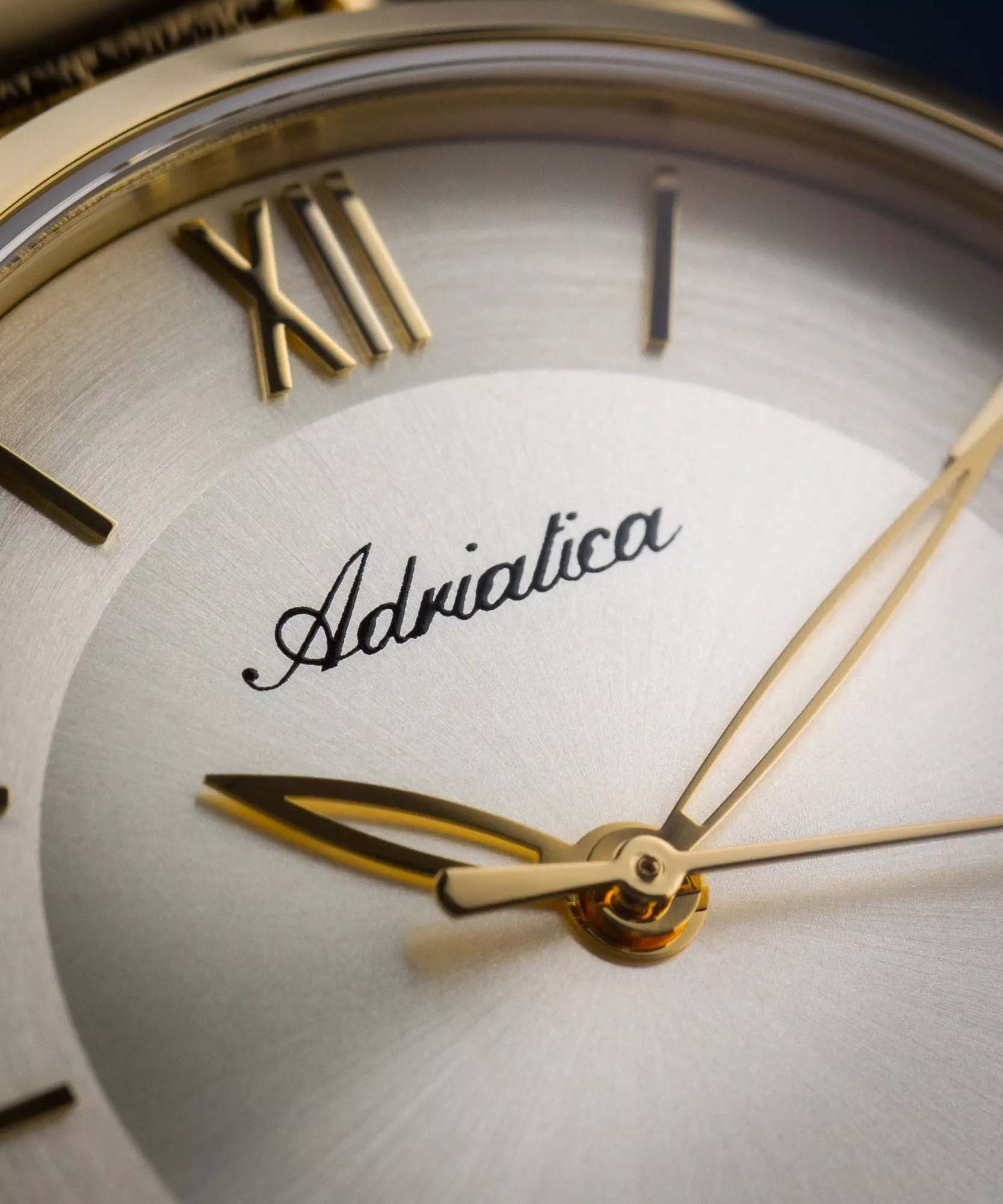 Женские кварцевые часы Adriatica A3823.1161Q — это элегантный аксессуар швейцарского производства с корпусом круглой формы. Корпус и браслет выполнены из стали с PVD-покрытиемPVDУльтратонкое покрытие наносится в технике вакуумного напыления, сочетает в себе нитрид титана особой прочности со слоем золота или оксида хрома. Несёт в себе декоративную или защитную функцию. и защищены минеральным стекломМинеральное стеклоМинеральное стекло представляет собой искусственно выращенный минерал кварца. Такое стекло отличается особой устойчивостью к повреждениям и царапинам. Уступает по некоторым качествам сапфировому стеклу.. Циферблат шампань с эффектом Sunray (солнечные лучи) оформлен штрихами и римской цифрой 12, что придаёт модели изысканный вид. Браслет фиксируется на раскладной застёжкеРаскладная застёжкаТакой тип застёжки используется только на браслетах из металла. Она никогда не раскрывается полностью, происходит разделение на 2 и более частей. Раскладывающая застёжка снизит вероятность потери часов к минимуму.. Часы оснащены точным кварцевым механизмом калибра Ronda 783. Водонепроницаемость 30 м позволит защитить корпус от случайных брызг или капель дождя.
