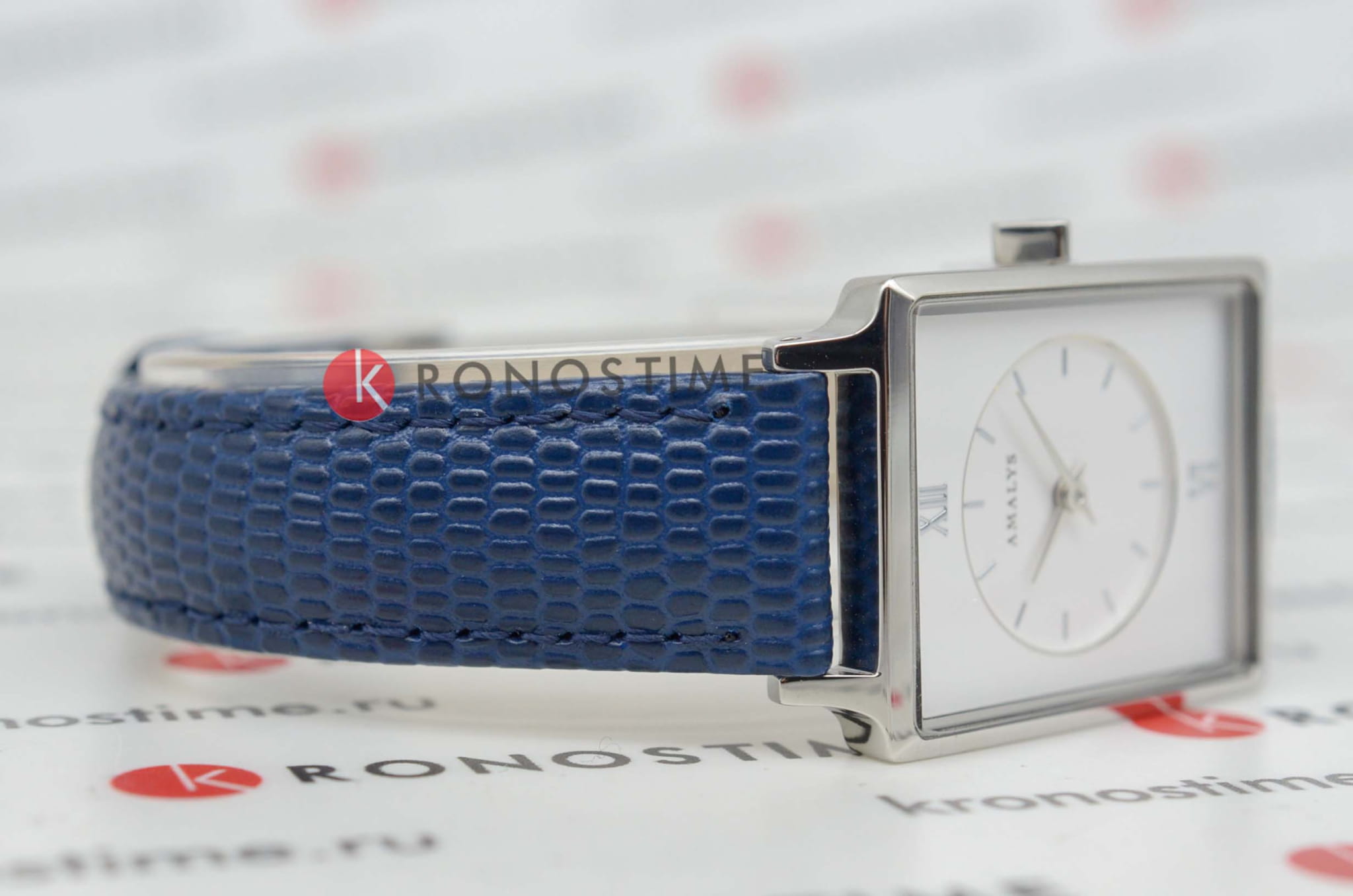 Женские кварцевые часы Amalys из коллекции Hepburn — это элегантный и универсальный аксессуар. Корпус прямоугольной формы размером 23×28 мм выполнен из нержавеющей стали. Циферблат белого цвета оформлен римскими цифрами и стрелками. Циферблат защищён минеральным стекломМинеральное стеклоМинеральное стекло представляет собой искусственно выращенный минерал кварца. Такое стекло отличается особой устойчивостью к повреждениям и царапинам. Уступает по некоторым качествам сапфировому стеклу.. Часы оснащены синим кожаным ремешком на классической пряжке. Водонепроницаемость 30 м позволяет использовать часы в повседневных условиях. Идеальный выбор для тех, кто ценит бельгийское качество и классический дизайн.