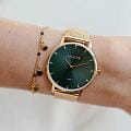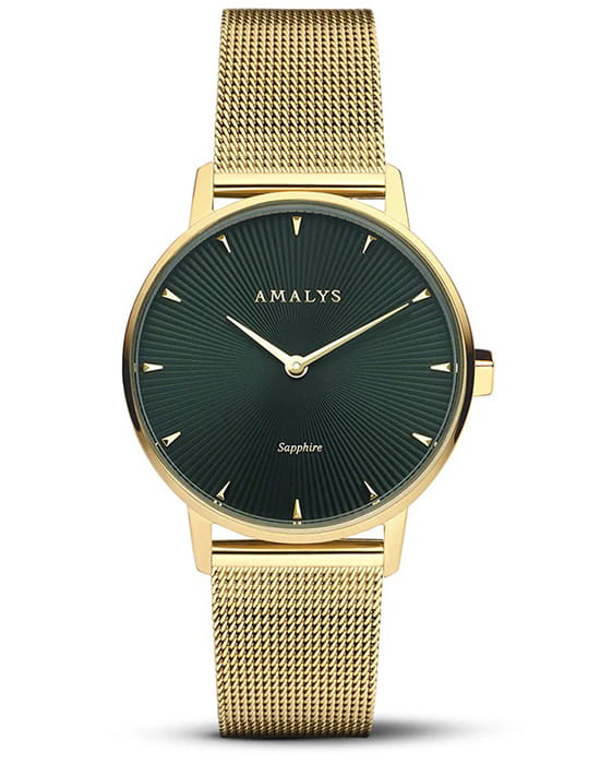 Amalys AMW-173 — женская модель с утончённым классическим дизайном, в которой сочетаются элегантность и практичность. Круглый корпус диаметром 23 мм выполнен из нержавеющей стали с PVD-покрытиемPVDУльтратонкое покрытие наносится в технике вакуумного напыления, сочетает в себе нитрид титана особой прочности со слоем золота или оксида хрома. Несёт в себе декоративную или защитную функцию., гармонирующим с браслетом шириной 16 мм в том же исполнении. Защитную функцию выполняет сапфировое стеклоСапфировое стеклоПрочный и надёжный материал из кристалла сапфира синтетического происхождения, характеризующийся особой твёрдостью и устойчивостью к царапинам и повреждениям., стойкое к царапинам и сохраняющее прозрачность. Механизм — кварцевый, обеспечивающий точность и стабильность хода. Браслет миланского плетения с PVD-покрытиемPVDУльтратонкое покрытие наносится в технике вакуумного напыления, сочетает в себе нитрид титана особой прочности со слоем золота или оксида хрома. Несёт в себе декоративную или защитную функцию. снабжён раскладным замкомРаскладной замокДанный вариант застежки используется только на часах с металлическим браслетом. Отличительная особенность такого крепления в том, что длина браслета становится универсальной и вы можете самостоятельно отрегулировать нужный вам размер – застежка просто двигается по браслету часов., который сочетает надёжность фиксации и удобство повседневного использования. Водозащита 3 ATM защищает часы от случайных брызг и дождя. Циферблат с римскими индексами и изящными стрелками подчёркивает классическую эстетику модели, делая её уместной как в повседневных образах, так и в торжественной обстановке.