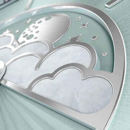 Циферблат в стиле Art Deco украшает усложнение фаз Луны в верхней половине, обрамлённой тонким кольцом облаков. Отмечено окно даты в положении «6 часов». Стрелки и накладные метки обработаны люминесцентным покрытиемЛюминесцентное покрытиеПозволяет считывать показания времени в темноте. Производители наносят на стрелки, часовые индексы, безель или поверхность циферблата светонакопительный состав, дающий холодное свечение. Superluminova — для уверенного считывания в темноте. Поверхность защищена сапфировым стекломСапфировое стеклоПрочный и надёжный материал из кристалла сапфира синтетического происхождения, характеризующийся особой твёрдостью и устойчивостью к царапинам и повреждениям. с антибликовым покрытием.