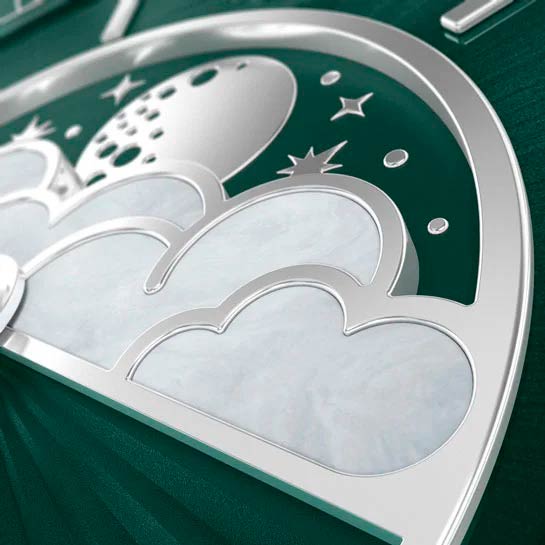 Циферблат в стиле Art Deco украшает усложнение фаз Луны в верхней половине, обрамлённой тонким кольцом облаков. Отмечено окно даты в положении «6 часов». Стрелки и накладные метки обработаны люминесцентным покрытиемЛюминесцентное покрытиеПозволяет считывать показания времени в темноте. Производители наносят на стрелки, часовые индексы, безель или поверхность циферблата светонакопительный состав, дающий холодное свечение. Superluminova — для уверенного считывания в темноте. Поверхность защищена сапфировым стекломСапфировое стеклоПрочный и надёжный материал из кристалла сапфира синтетического происхождения, характеризующийся особой твёрдостью и устойчивостью к царапинам и повреждениям. с антибликовым покрытием.