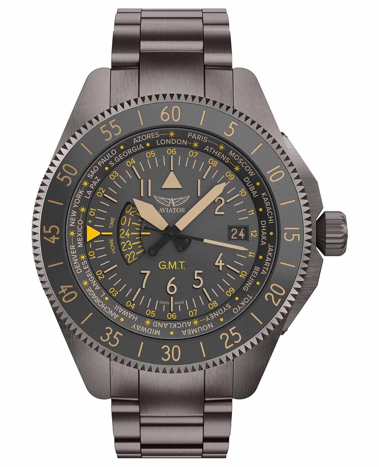 Aviator Airacobra V.1.37.7.305.5 “Airacobra GMT” — сбалансированный швейцарский пилотский GMT, сочетающий техническую строгость с удобными функциями для путешествий. Корпус диаметром 43 мм из нержавеющей стали с PVD-покрытиемPVDУльтратонкое покрытие наносится в технике вакуумного напыления, сочетает в себе нитрид титана особой прочности со слоем золота или оксида хрома. Несёт в себе декоративную или защитную функцию. обеспечивает уверенное ощущение надёжности, а герметичность до 100 м защищает при любой погоде .
