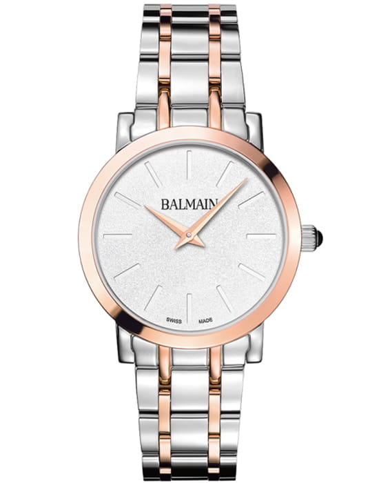 Женские часы Balmain Laelia B4438.33.26 кварцевый механизм с высокой точностью. Сапфировое стеклоСапфировое стеклоПрочный и надёжный материал из кристалла сапфира синтетического происхождения, характеризующийся особой твёрдостью и устойчивостью к царапинам и повреждениям. устойчивое к появлению царапин, обладающее высокой прозрачностью. Корпус изготовлен из нержавеющей стали PVD-покрытиемPVDУльтратонкое покрытие наносится в технике вакуумного напыления, сочетает в себе нитрид титана особой прочности со слоем золота или оксида хрома. Несёт в себе декоративную или защитную функцию.. Класс водозащиты: 50 метров, позволит защитить корпус от случайных брызг или капель дождя. Стальной браслет с PVD-покрытиемPVDУльтратонкое покрытие наносится в технике вакуумного напыления, сочетает в себе нитрид титана особой прочности со слоем золота или оксида хрома. Несёт в себе декоративную или защитную функцию.. на застёжке «бабочка» с кнопкамиЗастёжка "бабочка"Такой вид застёжки дополняется предохранителями, помогающими избежать случайного раскрытия браслета. Обладают изящным исполнением. . БезельБезельВнешний ободок, закрепляющий стекло. В спортивных часах так называется поворотное кольцо с делениями на циферблате, выполняет роль таймера – замеряет отрезки времени на шкале. Неподвижный безель – элемент декора. Однонаправленно вращающийся безель на дайверских часах позволяет фиксировать моменты погружения и выныривания на поверхность. с PVD-покрытиемPVDУльтратонкое покрытие наносится в технике вакуумного напыления, сочетает в себе нитрид титана особой прочности со слоем золота или оксида хрома. Несёт в себе декоративную или защитную функцию..