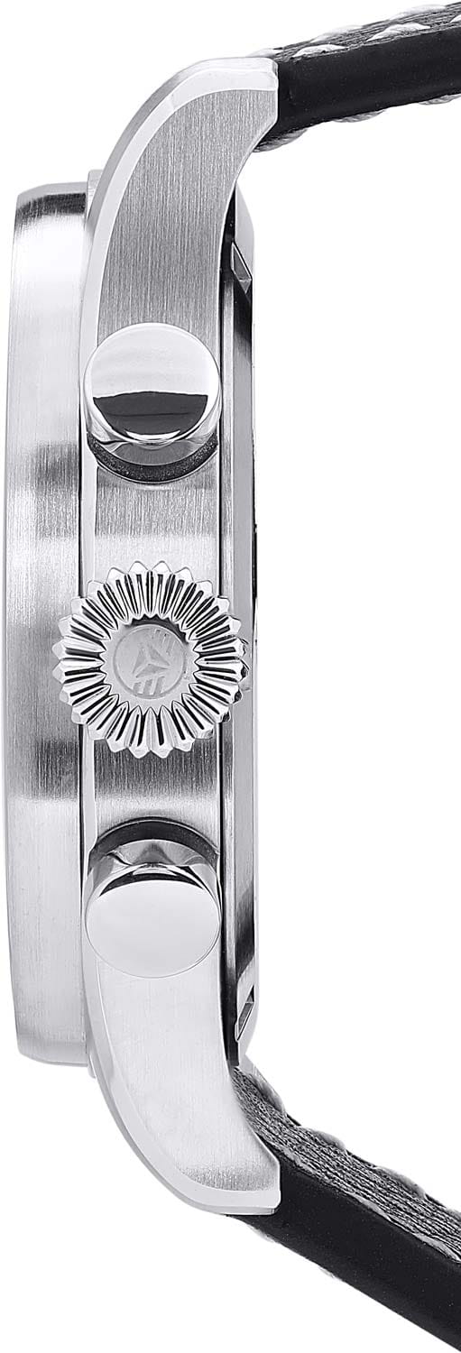 Мужские кварцевые часы-хронограф Bauhaus — это функциональный аксессуар в стиле авиационных приборов. Корпус диаметром 41 мм и толщиной 12 мм выполнен из стали с комбинированной матовой и полированной отделкой. Циферблат чёрного цвета оформлен арабскими цифрами и прямоугольными стрелками в стиле Baton. Присутствуют три субциферблата хронографа. Окошко даты расположено в положении 4 часов. Циферблат защищён прочным минеральным стекломМинеральное стеклоМинеральное стекло представляет собой искусственно выращенный минерал кварца. Такое стекло отличается особой устойчивостью к повреждениям и царапинам. Уступает по некоторым качествам сапфировому стеклу. K1. Механизм — швейцарский кварцевый калибр Ronda 5030.D с функциями хронографаХронографФункция позволяет измерять отрезки времени с особой точностью: часы, минуты, секунды. Верным признаком хронографа является наличие на циферблате 3 дополнительных окошек-счётчиков. и секундомераСекундомерСекундоме́р — прибор, способный измерять интервалы времени с точностью до долей секунды.. Рифлёная заводная головка конической формы украшена фирменным логотипом. Часы оснащены кожаным ремешком с декоративной белой строчкой и классической пряжкой. Водонепроницаемость 100 м позволяет использовать часы для плавания и повседневного ношения. Идеальный выбор для тех, кто ценит немецкое качество и спортивный дизайн.