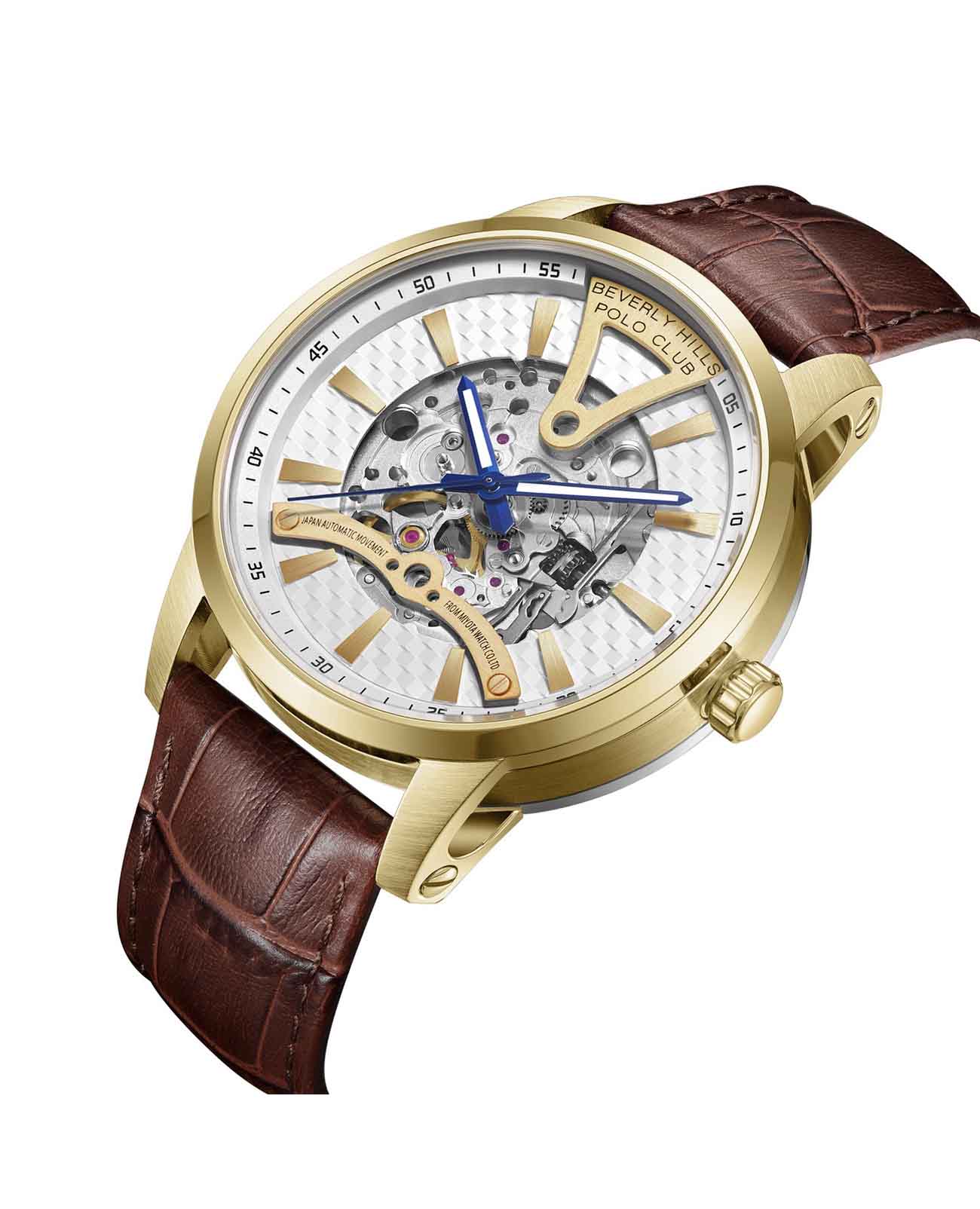 Американские мужские часы-скелетоны Beverly Hills Polo Club BP3553X.172 с надёжным автоматическим механизмом. Минеральное стеклоМинеральное стеклоМинеральное стекло представляет собой искусственно выращенный минерал кварца. Такое стекло отличается особой устойчивостью к повреждениям и царапинам. Уступает по некоторым качествам сапфировому стеклу. устойчивое к появлению царапин, обладающее высокой прозрачностью. Корпус часов изготовлен стали с IP-покрытиемIP-покрытиеМетод ионного напыления. Демонстрирует повышенную устойчивость к истиранию, окислению и химическим веществам. Под воздействием высокого давления и температуры около 1500°C молекулы металла надёжно соединяются с частицами корпуса часов.. Стрелки с люминесцентным покрытиемЛюминесцентное покрытиеПозволяет считывать показания времени в темноте. Производители наносят на стрелки, часовые индексы, безель или поверхность циферблата светонакопительный состав, дающий холодное свечение.. Класс водозащиты: 100 метров, позволит плавать, нырять и заниматься другими водными видами спорта. Кожаный ремешок на стандартной застежке.