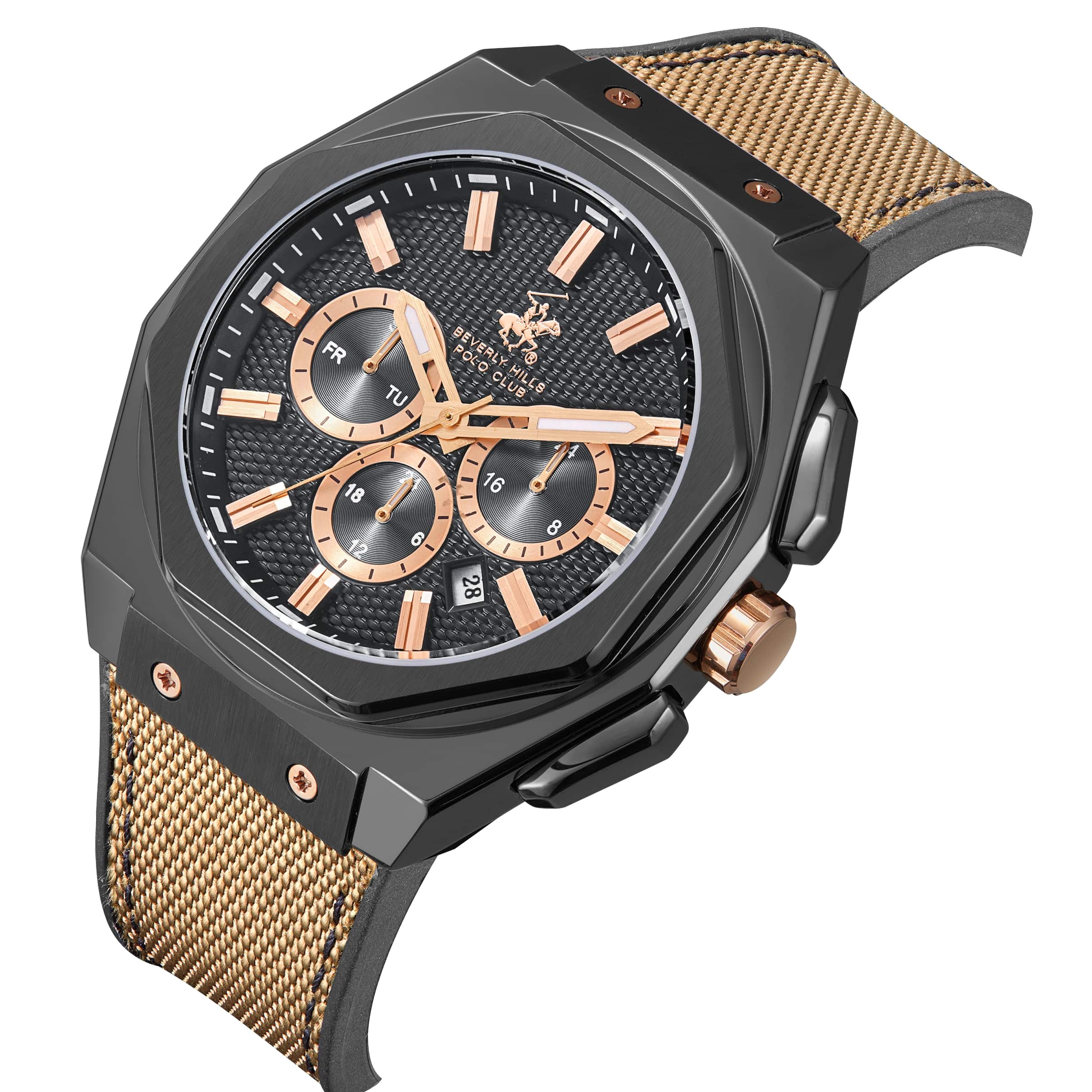 Beverly Hills Polo Club BP3719X.055 – стильные мужские часы, сочетающие современный дизайн и надёжность. Корпус диаметром 45 мм выполнен из нержавеющей стали с PVD-покрытиемPVDУльтратонкое покрытие наносится в технике вакуумного напыления, сочетает в себе нитрид титана особой прочности со слоем золота или оксида хрома. Несёт в себе декоративную или защитную функцию. 316L, обеспечивающей долговечность и устойчивость к коррозии. Циферблат придаёт модели свежий и современный вид, а его поверхность защищена минеральным стекломМинеральное стеклоМинеральное стекло представляет собой искусственно выращенный минерал кварца. Такое стекло отличается особой устойчивостью к повреждениям и царапинам. Уступает по некоторым качествам сапфировому стеклу., устойчивым к царапинам. Часы оснащены точным кварцевым механизмом, гарантирующим надёжное и стабильное отображение времени. Ремень, выполненный из комбинации текстиля и силикона, оснащён стандартной классической застёжкой, обеспечивающей удобство ношения и надёжную фиксацию на запястье. Водозащита до 100 метров (10 ATM) позволяет использовать часы при плавании и других водных видах спорта.
