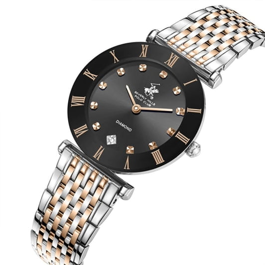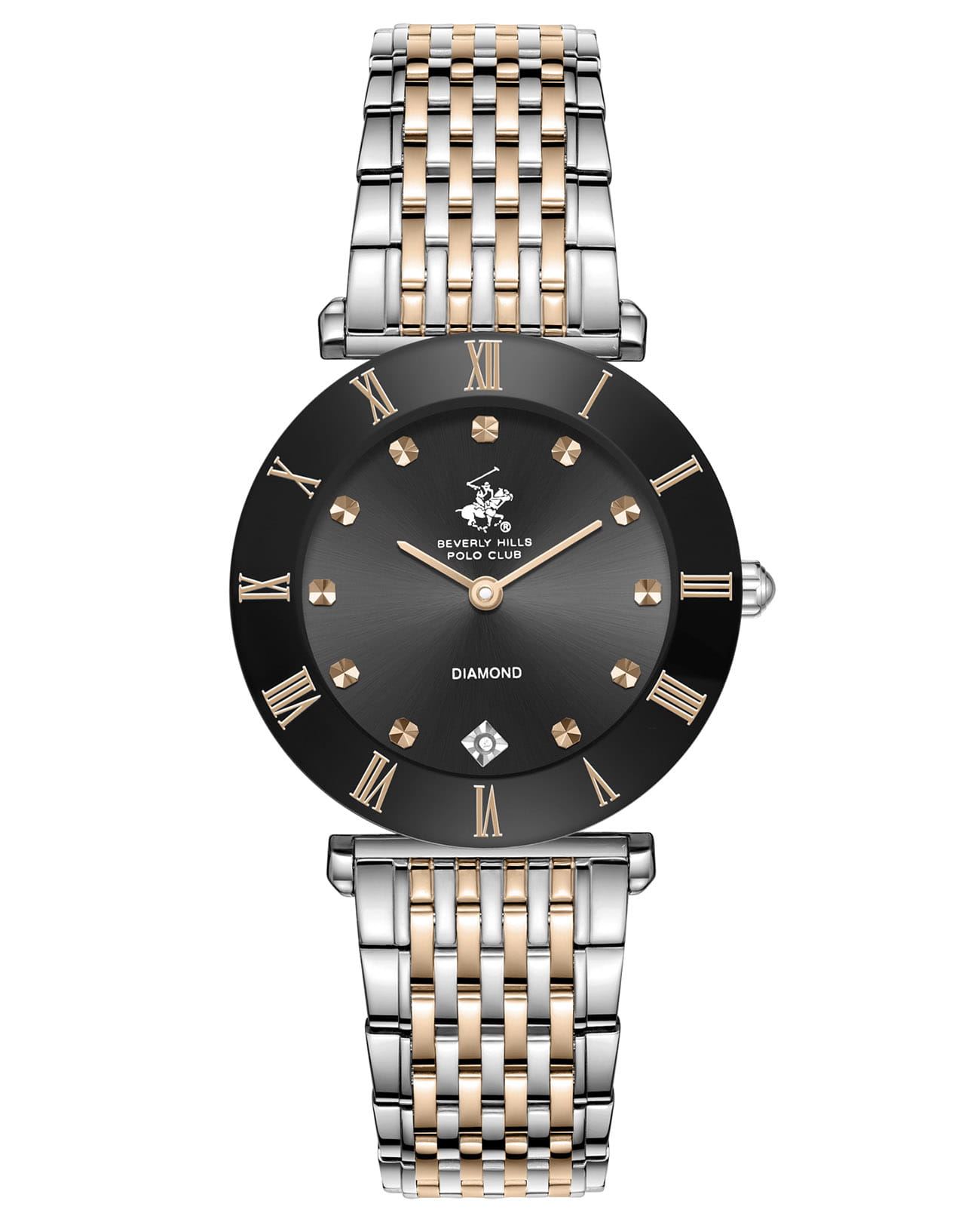 Женские кварцевые часы Beverly Hills Polo Club — это символ элегантного стиля и безупречного вкуса. Корпус диаметром 30 мм выполнен из суперметалла. БезельБезельВнешний ободок, закрепляющий стекло. В спортивных часах так называется поворотное кольцо с делениями на циферблате, выполняет роль таймера – замеряет отрезки времени на шкале. Неподвижный безель – элемент декора. Однонаправленно вращающийся безель на дайверских часах позволяет фиксировать моменты погружения и выныривания на поверхность. из суперметалла с IP-покрытиемIP-покрытиеМетод ионного напыления. Демонстрирует повышенную устойчивость к истиранию, окислению и химическим веществам. Под воздействием высокого давления и температуры около 1500°C молекулы металла надёжно соединяются с частицами корпуса часов.. Циферблат чёрного цвета оформлен римскими цифрами, стрелками и инкрустирован одним синтетическим бриллиантом. Циферблат защищён минеральным стекломМинеральное стеклоМинеральное стекло представляет собой искусственно выращенный минерал кварца. Такое стекло отличается особой устойчивостью к повреждениям и царапинам. Уступает по некоторым качествам сапфировому стеклу. с сапфировым покрытием. Часы оснащены стальным браслетом с частичным IP-покрытиемIP-покрытиеМетод ионного напыления. Демонстрирует повышенную устойчивость к истиранию, окислению и химическим веществам. Под воздействием высокого давления и температуры около 1500°C молекулы металла надёжно соединяются с частицами корпуса часов. на застёжке «бабочка» с кнопкамиЗастёжка "бабочка"Такой вид застёжки дополняется предохранителями, помогающими избежать случайного раскрытия браслета. Обладают изящным исполнением. . Водонепроницаемость 30 м позволяет использовать часы в повседневных условиях. Идеальный выбор для тех, кто ценит американское качество и универсальный дизайн.