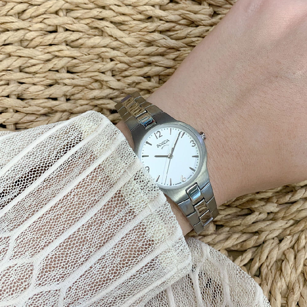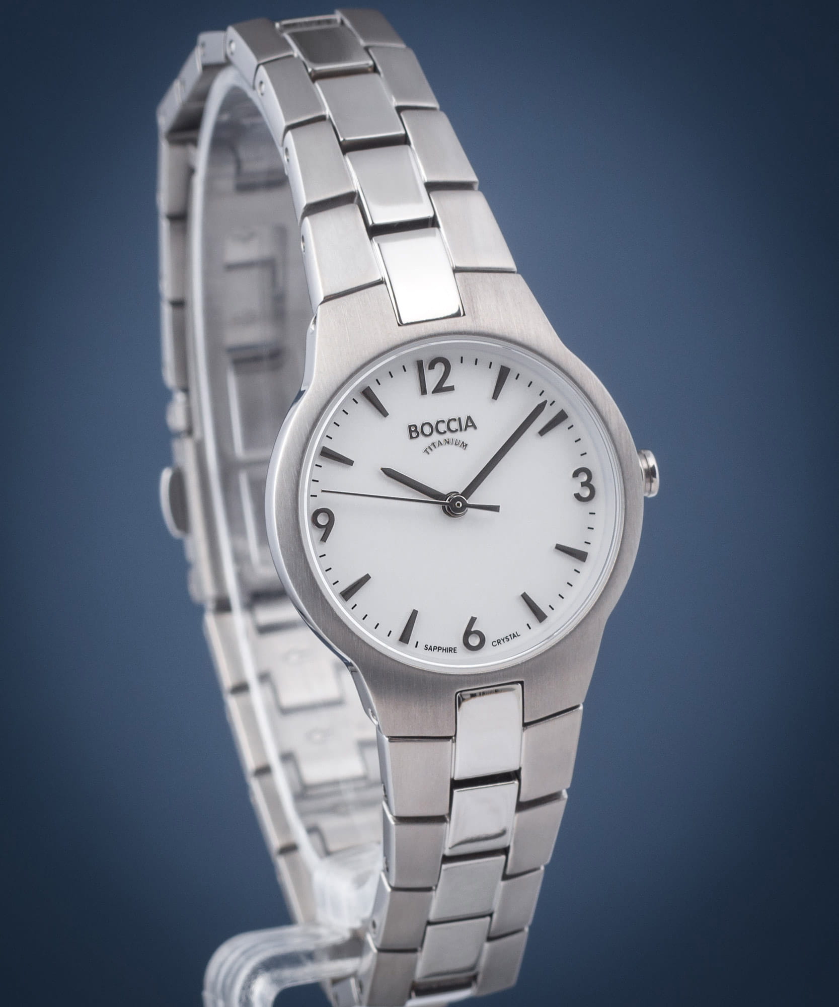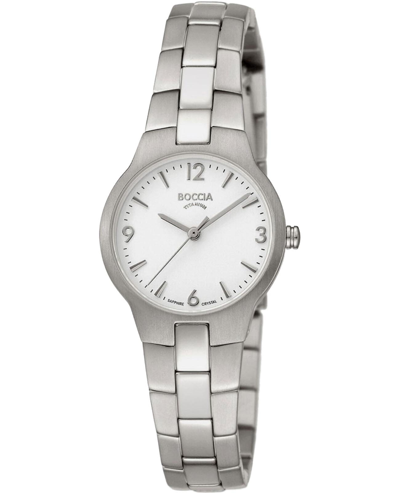 Женские наручные часы Boccia Titanium 3312-01 с надёжным кварцевым механизмом. Корпус и браслет часов изготовлены из титана. Сапфировое стеклоСапфировое стеклоПрочный и надёжный материал из кристалла сапфира синтетического происхождения, характеризующийся особой твёрдостью и устойчивостью к царапинам и повреждениям. устойчивое к мелким механическим повреждениям. Класс водозащиты: 50 метров, позволит защитить корпус от случайных брызг или капель дождя. Титановый браслет на раскладной застёжкеРаскладная застёжкаТакой тип застёжки используется только на браслетах из металла. Она никогда не раскрывается полностью, происходит разделение на 2 и более частей. Раскладывающая застёжка снизит вероятность потери часов к минимуму..