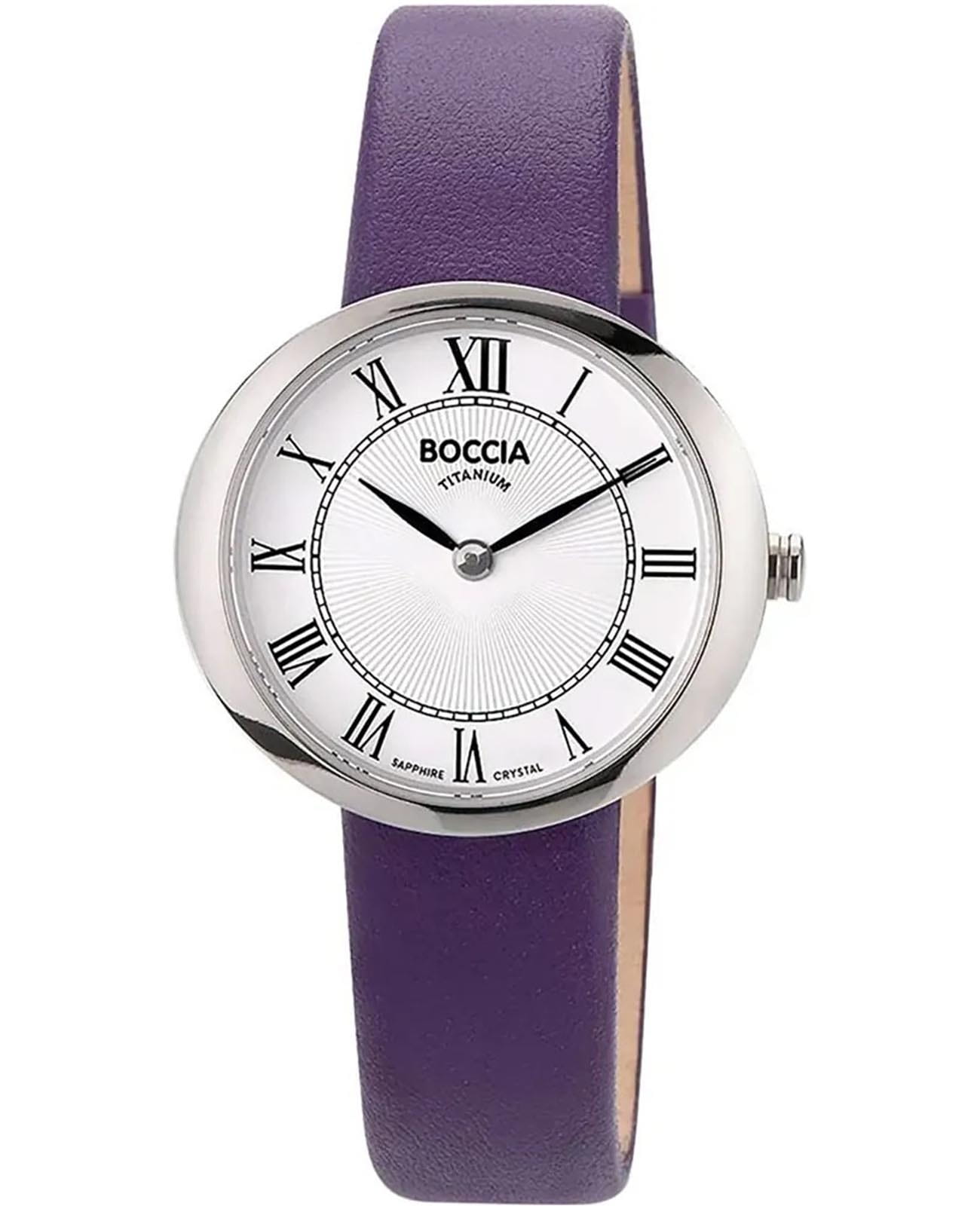 Женские немецкие титановые часы Boccia Titanium 3344-02, кварцевый механизм с высокой точностью. Сапфировое стеклоСапфировое стеклоПрочный и надёжный материал из кристалла сапфира синтетического происхождения, характеризующийся особой твёрдостью и устойчивостью к царапинам и повреждениям. устойчивое к мелким механическим повреждениям. Корпус изготовлен из титана. Метки в виде римских цифр. Класс водозащиты: 50 метров, позволит защитить корпус от случайных брызг или капель дождя. Кожаный ремешок на стандартной застёжке.
