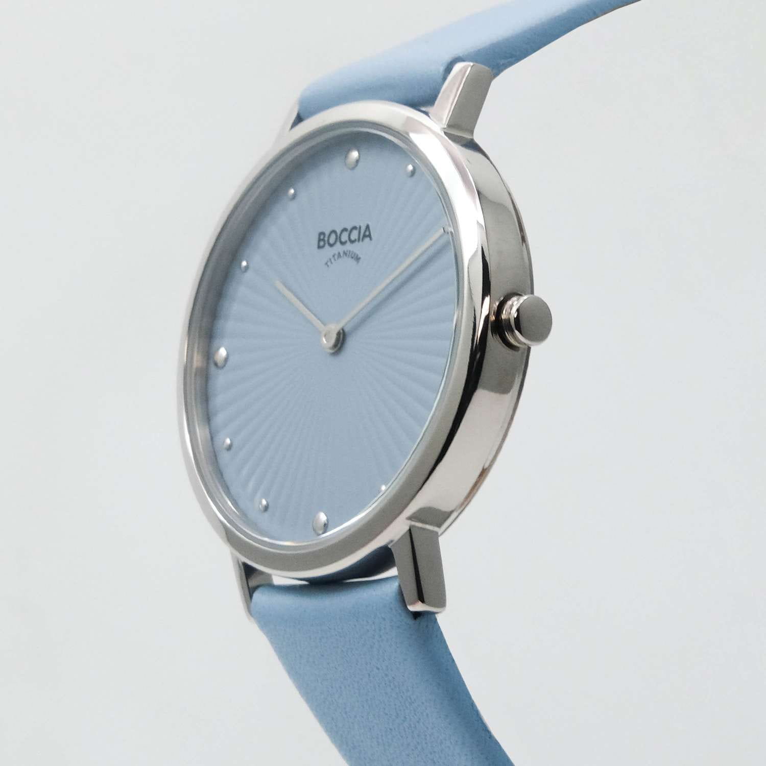 Элегантные женские часы Boccia 3365-01 станут неотъемлемой частью вашего повседневного стиля. Эти часы оборудованы надежным кварцевым механизмом Miyota GL22, обеспечивающим высокую точность и бесперебойную работу. Центральные часовая и минутная стрелки изящно выделяются на стильном голубом циферблате, создавая гармоничный и современный образ. Корпус часов выполнен из суперлегкого титана, что делает их не только прочными, но и комфортными в ношении. Круглый корпус диаметром 34 мм придаёт часам классический и универсальный вид. Голубой кожаный ремешок с традиционной застежкой идеально дополняет общий дизайн, добавляя яркий акцент. Прочное минеральное стеклоМинеральное стеклоМинеральное стекло представляет собой искусственно выращенный минерал кварца. Такое стекло отличается особой устойчивостью к повреждениям и царапинам. Уступает по некоторым качествам сапфировому стеклу. защищает циферблат от мелких механических повреждений, обеспечивая долговечность и сохранение первоначального внешнего вида. Водостойкость уровня WR 50 позволяет не беспокоиться о попадании влаги при мытье рук или в дождливую погоду.