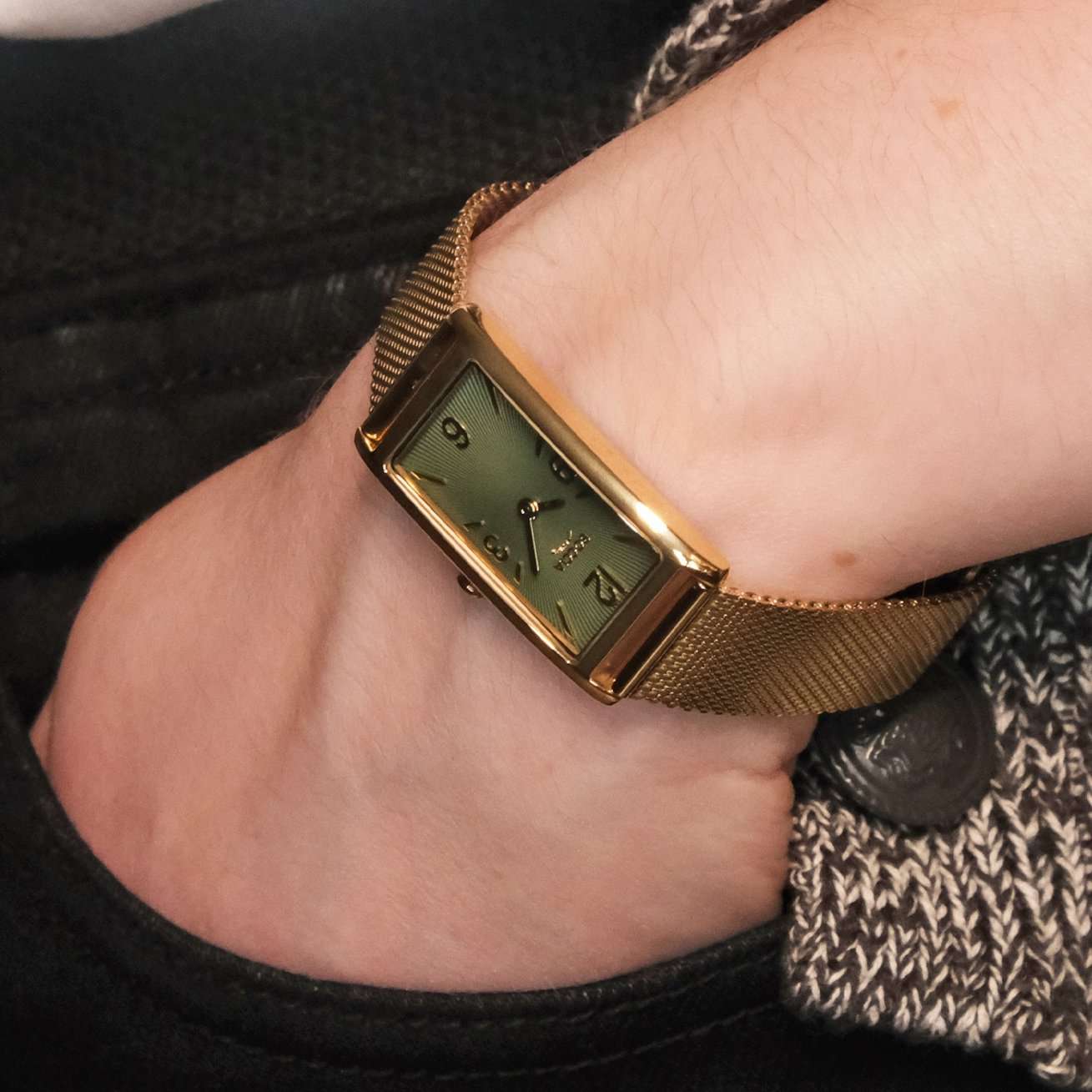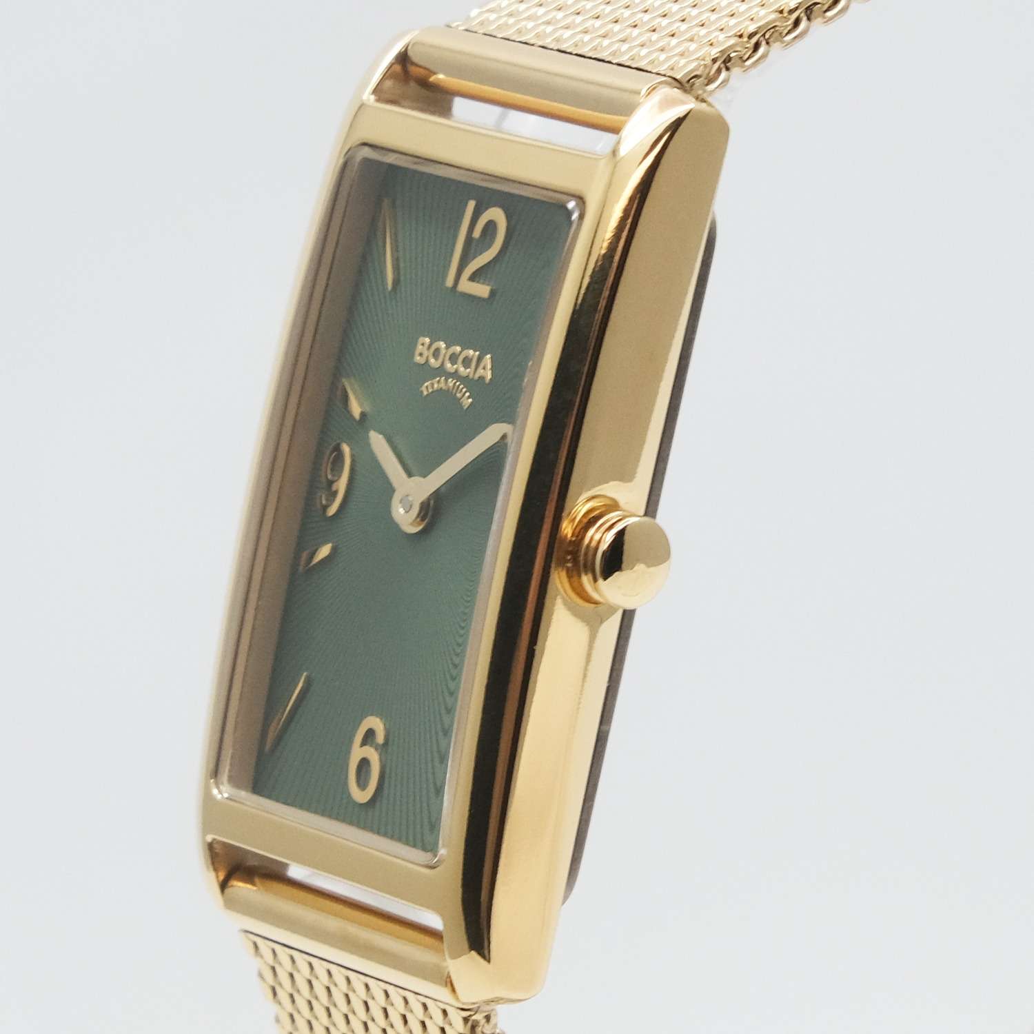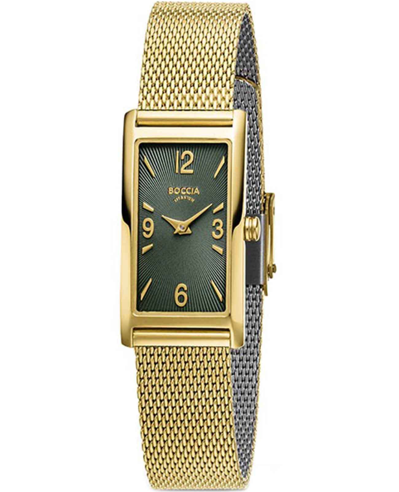 Женские часы Boccia 3366-03, которые станут стильным и функциональным аксессуаром для современной женщины. Эти часы оснащены кварцевым механизмом Miyota 5Y20, обеспечивающим точное и надежное отсчитывание времени. Центральные часовая и минутная стрелки выделяются на элегантном зеленом циферблате, создавая контрастный и выразительный образ. Прямоугольный корпус часов выполнен из суперлегкого титана с PVDPVDУльтратонкое покрытие наносится в технике вакуумного напыления, сочетает в себе нитрид титана особой прочности со слоем золота или оксида хрома. Несёт в себе декоративную или защитную функцию.-покрытием цвета желтого золота, что делает их невероятно комфортными для ежедневного ношения. Размер корпуса 35х18 мм добавляет изысканности и утонченности внешнему виду. Особое внимание привлекает стальной браслет с PVDPVDУльтратонкое покрытие наносится в технике вакуумного напыления, сочетает в себе нитрид титана особой прочности со слоем золота или оксида хрома. Несёт в себе декоративную или защитную функцию.-покрытием цвета желтого золота, выполненный в технике миланского плетения, который придаёт часам современный и элегантный вид. А раскладной замокРаскладной замокДанный вариант застежки используется только на часах с металлическим браслетом. Отличительная особенность такого крепления в том, что длина браслета становится универсальной и вы можете самостоятельно отрегулировать нужный вам размер – застежка просто двигается по браслету часов. обеспечивает удобство и надежность фиксации. Прочное выпуклое минеральное стеклоМинеральное стеклоМинеральное стекло представляет собой искусственно выращенный минерал кварца. Такое стекло отличается особой устойчивостью к повреждениям и царапинам. Уступает по некоторым качествам сапфировому стеклу. защищает циферблат от мелких механических повреждений, гарантируя долговечность и сохранение первоначального внешнего вида. Водостойкость уровня WR 30 обеспечивает защиту от брызг, делая их подходящими для повседневного использования.
