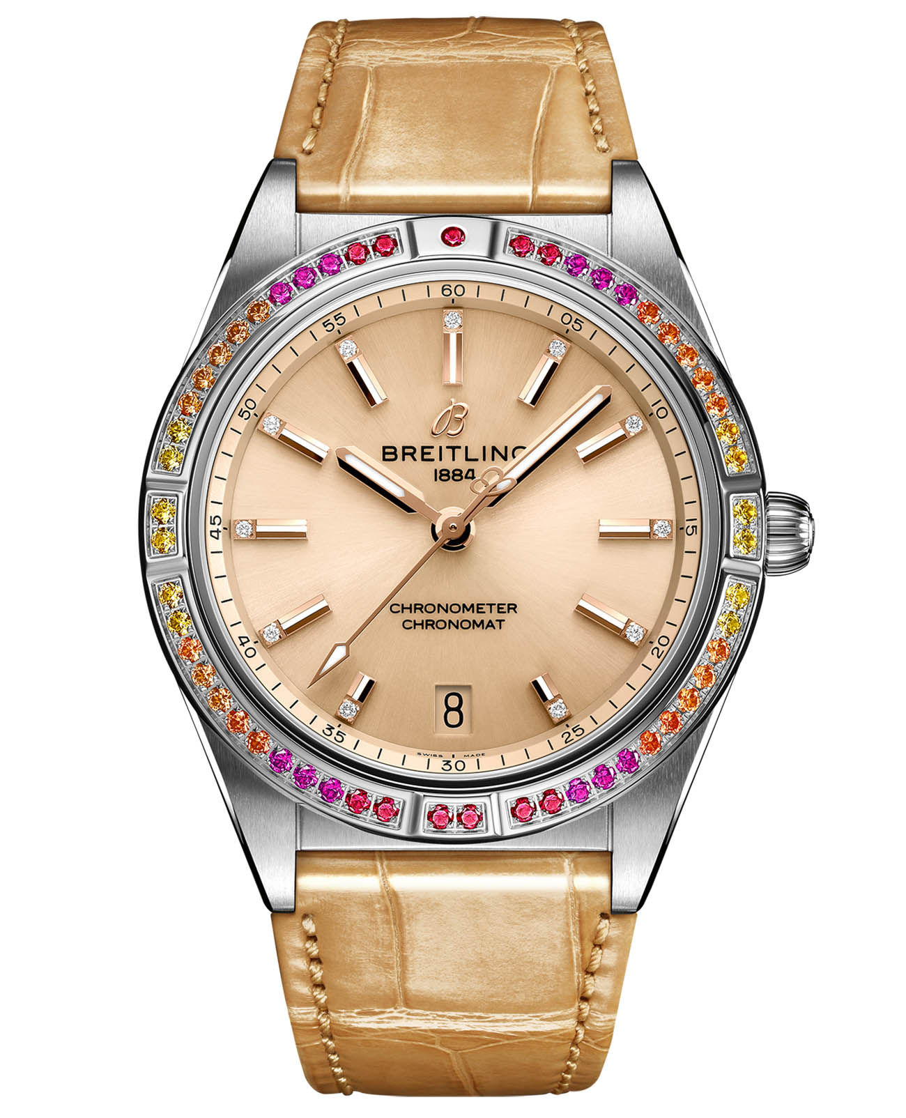 Эти элегантные часы в стиле современное ретро созданы для представительниц прекрасного пола, желающих выделиться из толпы. Chronomat South Sea легко узнать по специальным лакированным циферблатам с золотыми индексами и стрелками, инкрустированным бриллиантами часовым маркерам и украшенным драгоценными камнями безелем коктейльных оттенков. К ним по цвету были подобраны блестящие ремешки из кожи аллигатора с раскладными застежками.