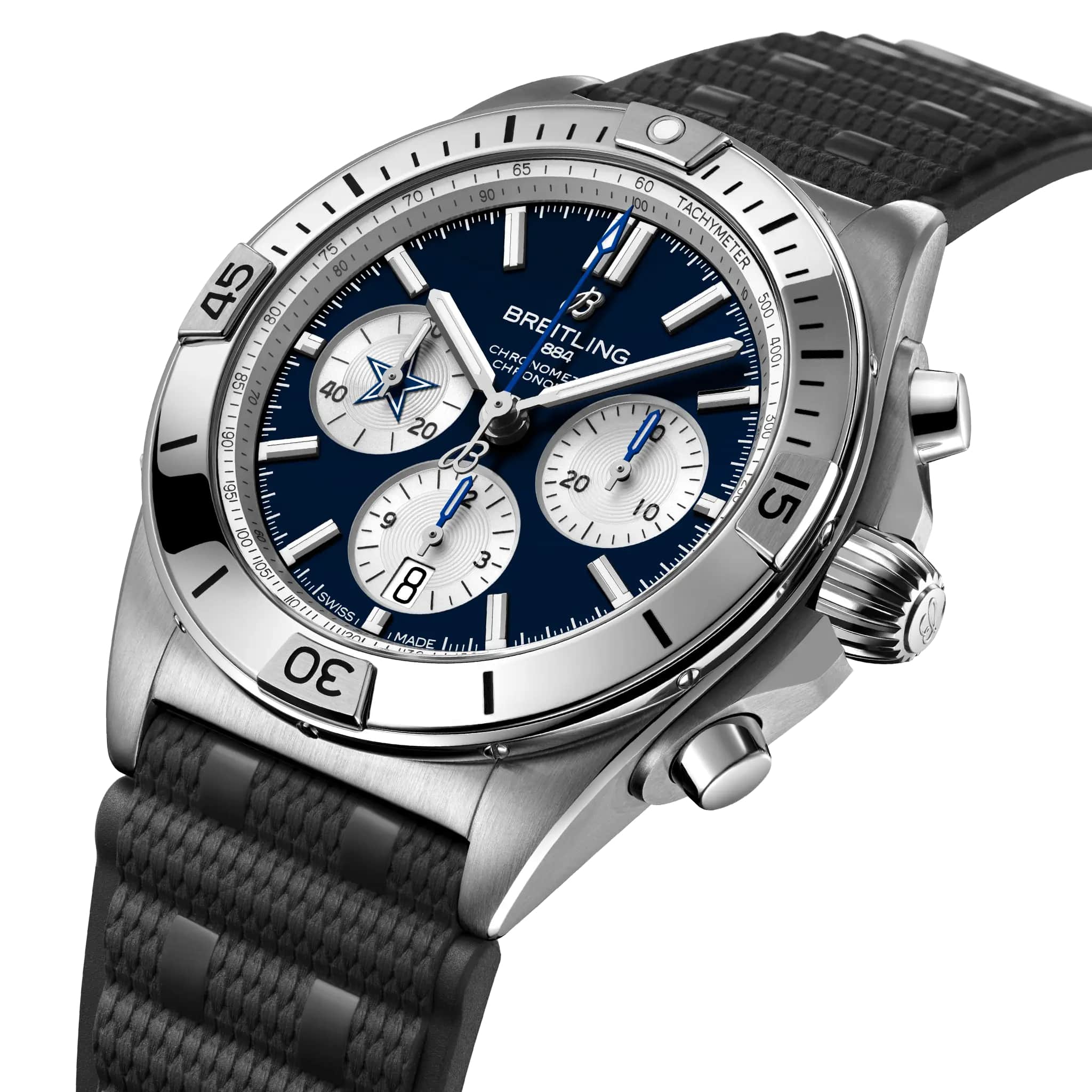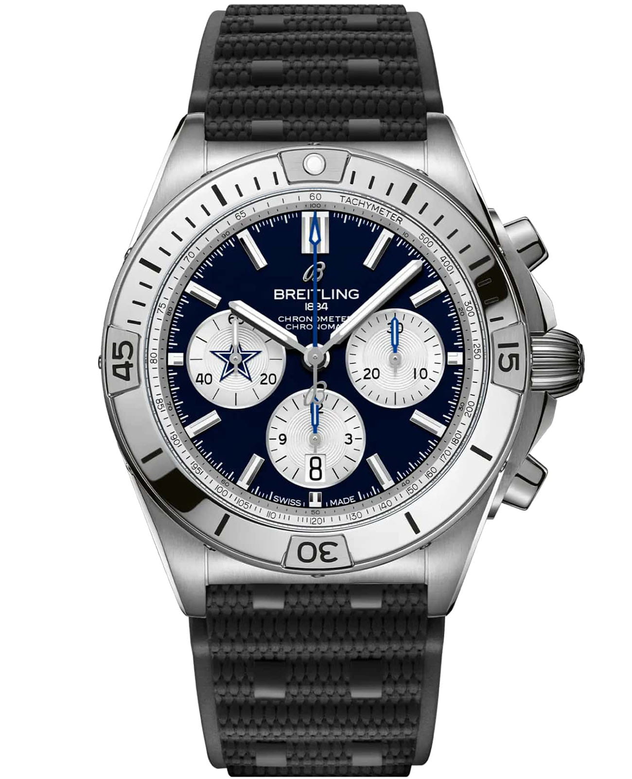 Мужские швейцарские часы-хронограф с секундомером Breitling Chronomat B01 42 NFL Dallas Cowboys Edition AB01342B1C1S1, механический механизм (автоматический калибр) с высокой точностью. Сапфировое стеклоСапфировое стеклоПрочный и надёжный материал из кристалла сапфира синтетического происхождения, характеризующийся особой твёрдостью и устойчивостью к царапинам и повреждениям. устойчивое к появлению царапин, обладающее высокой прозрачностью. Класс водозащиты: 200 метров, позволит плавать, нырять и заниматься другими водными видами спорта. Корпус часов изготовлен из нержавеющей стали. Браслет из каучука на раскладной застёжкеРаскладная застёжкаТакой тип застёжки используется только на браслетах из металла. Она никогда не раскрывается полностью, происходит разделение на 2 и более частей. Раскладывающая застёжка снизит вероятность потери часов к минимуму.. Стрелки и метки с люминесцентным покрытиемЛюминесцентное покрытиеПозволяет считывать показания времени в темноте. Производители наносят на стрелки, часовые индексы, безель или поверхность циферблата светонакопительный состав, дающий холодное свечение.. Шкала тахиметра на циферблате. Окошко даты находится в положении 6 часов.