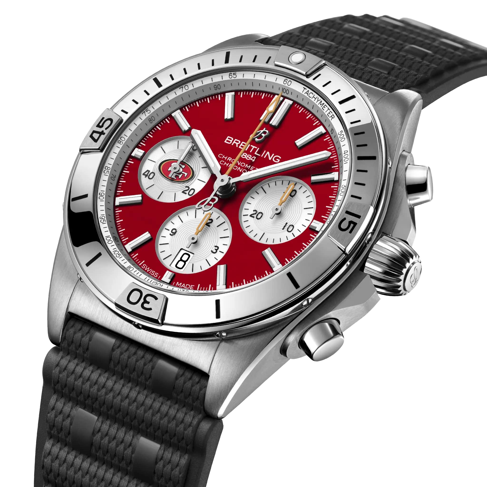 Мужские швейцарские часы-хронограф с секундомером Breitling B01 42 NFL San Francisco 49ers Edition AB01342B1K1S1, механический механизм (автоматический калибр) с высокой точностью. Сапфировое стеклоСапфировое стеклоПрочный и надёжный материал из кристалла сапфира синтетического происхождения, характеризующийся особой твёрдостью и устойчивостью к царапинам и повреждениям. устойчивое к появлению царапин, обладающее высокой прозрачностью. Класс водозащиты: 200 метров, позволит плавать, нырять и заниматься другими водными видами спорта. Корпус часов изготовлен из нержавеющей стали. Браслет из каучука на раскладной застёжкеРаскладная застёжкаТакой тип застёжки используется только на браслетах из металла. Она никогда не раскрывается полностью, происходит разделение на 2 и более частей. Раскладывающая застёжка снизит вероятность потери часов к минимуму.. Стрелки и метки с люминесцентным покрытиемЛюминесцентное покрытиеПозволяет считывать показания времени в темноте. Производители наносят на стрелки, часовые индексы, безель или поверхность циферблата светонакопительный состав, дающий холодное свечение.. Шкала тахиметра на циферблате. Окошко даты находится в положении 6 часов.