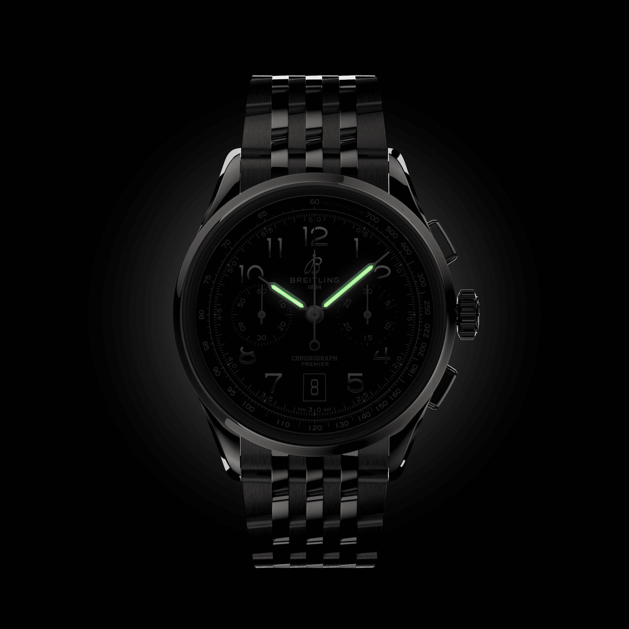 Мужские швейцарские часы-хронографХронографФункция позволяет измерять отрезки времени с особой точностью: часы, минуты, секунды. Верным признаком хронографа является наличие на циферблате 3 дополнительных окошек-счётчиков. с тахиметромТахиметрРазмеченная шкала, располагается на ободке или безеле часов. Тахиметр позволяет рассчитать скорость на определённом участке пути, расстояние измеряется в километрах или милях. Breitling Premier B01 Chronograph 42 AB0145221B1A1, механический механизм (автоматический калибр) с высокой точностью. Сапфировое стеклоСапфировое стеклоПрочный и надёжный материал из кристалла сапфира синтетического происхождения, характеризующийся особой твёрдостью и устойчивостью к царапинам и повреждениям. с антибликовым покрытием устойчивое к появлению царапин, обладающее высокой прозрачностью. Класс водозащиты: 100 метров, позволит плавать, нырять и заниматься другими водными видами спорта. Корпус часов изготовлен из стали. Стальной браслет с застёжкой-бабочкой с кнопкамиЗастёжка "бабочка"Такой вид застёжки дополняется предохранителями, помогающими избежать случайного раскрытия браслета. Обладают изящным исполнением. . Стрелки с люминесцентным покрытиемЛюминесцентное покрытиеПозволяет считывать показания времени в темноте. Производители наносят на стрелки, часовые индексы, безель или поверхность циферблата светонакопительный состав, дающий холодное свечение.. Окошко даты находится в положении 6 часов. СекундомерСекундомерСекундоме́р — прибор, способный измерять интервалы времени с точностью до долей секунды..