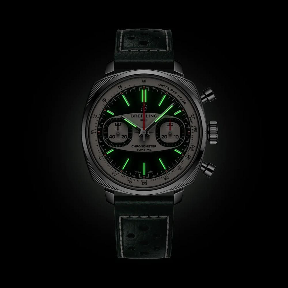 Breitling Top Time B01 Racing Green AB01771A1L1X1 — лимитированная модель, сочетающая винтажную эстетику и современные технологии, вдохновлённая гоночными хронографами 1960-х годов. Корпус диаметром 38 мм выполнен из нержавеющей стали с полированной отделкой. На задней крышке — гравировка «One of 750», указывающая на ограниченный тираж. Циферблат защищён сапфировым стекломСапфировое стеклоПрочный и надёжный материал из кристалла сапфира синтетического происхождения, характеризующийся особой твёрдостью и устойчивостью к царапинам и повреждениям. с антибликовым покрытиемАнтибликовое покрытиеСлой оксида металла в 0,13-0,3 микрон, благодаря которому стекло часов не бликует и не отражает свет. Антибликовое покрытие уменьшает отражение света в 10 раз, обеспечивая отличную читаемость показателей циферблата., устойчивым к царапинам и бликам. Зелёный циферблат оформлен в характерном стиле «surfboard» с двумя белыми субциферблатами. Разметка и стрелки покрыты люминесцентным покрытиемЛюминесцентное покрытиеПозволяет считывать показания времени в темноте. Производители наносят на стрелки, часовые индексы, безель или поверхность циферблата светонакопительный состав, дающий холодное свечение. для хорошей читаемости в темноте. Модель оснащена автоматическим хронографомХронографФункция позволяет измерять отрезки времени с особой точностью: часы, минуты, секунды. Верным признаком хронографа является наличие на циферблате 3 дополнительных окошек-счётчиков. калибра Breitling B01 с 1/4-секундной точностью, 30-минутным счётчиком, запасом хода до 70 часов и сертификацией COSCСертификат COSCОфициальный сертификат, подтверждающий то, что часы ходят с особо высокой точностью. Для получения документа часы подвергаются тестовым испытаниям, разработанным швейцарским институтом тестирования хронометров COSC. Допустимая норма для механических часов -4/+6 секунд в день, для кварцевых моделей +/- 0,07 секунд в день.. Часы укомплектованы перфорированным зелёным кожаным ремешком на стандартной застежке, которая обеспечивает комфорт и надёжную фиксацию. Водонепроницаемость 100 метров делает модель подходящей для активного образа жизни и повседневной эксплуатации. Top Time B01 Racing Green — яркое переосмысление классического хронографа для поклонников винтажного стиля и швейцарской точности.