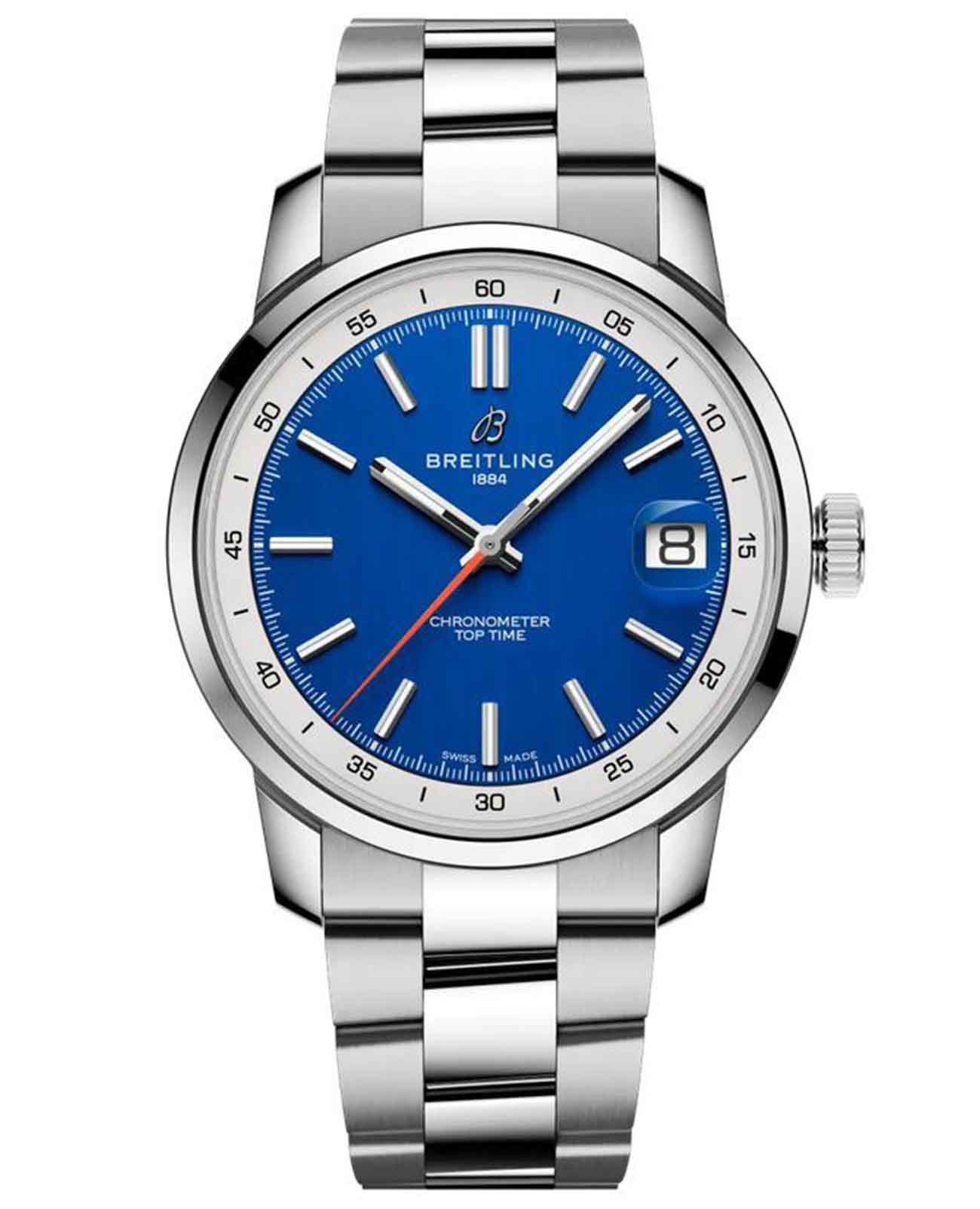 Breitling Top Time B31 AB3113A71C1A1 — стильная новинка 2025 года с характерной винтажной эстетикой и современным механизмом собственного производства. Корпус диаметром 38 мм выполнен из нержавеющей стали с полированной отделкой. Прозрачная задняя крышка позволяет наблюдать за работой механизма. Циферблат защищён выпуклым сапфировым стекломСапфировое стеклоПрочный и надёжный материал из кристалла сапфира синтетического происхождения, характеризующийся особой твёрдостью и устойчивостью к царапинам и повреждениям. с двухсторонним антибликовым покрытиемАнтибликовое покрытиеСлой оксида металла в 0,13-0,3 микрон, благодаря которому стекло часов не бликует и не отражает свет. Антибликовое покрытие уменьшает отражение света в 10 раз, обеспечивая отличную читаемость показателей циферблата.. Циферблат с контрастным внутренним кольцом и яркой оранжевой секундной стрелкой оформлен в узнаваемом стиле коллекции Top Time. Стрелки и часовые метки имеют люминесцентное покрытиеЛюминесцентное покрытиеПозволяет считывать показания времени в темноте. Производители наносят на стрелки, часовые индексы, безель или поверхность циферблата светонакопительный состав, дающий холодное свечение., обеспечивающее отличную читаемость. Внутри установлен автоматический калибр Breitling B31, отображающий часы, минуты, малую секунду и дату. Механизм обеспечивает запас хода до 78 часов и работает с частотой 28 800 полуколебаний в час. Часы укомплектованы стальным браслетом на раскладной застёжкойРаскладная застёжкаТакой тип застёжки используется только на браслетах из металла. Она никогда не раскрывается полностью, происходит разделение на 2 и более частей. Раскладывающая застёжка снизит вероятность потери часов к минимуму.. Водонепроницаемость 100 метров делает модель универсальной для повседневного использования. Top Time B31 AB3113A71C1A1 — гармония винтажного дизайна и инновационного часового мастерства.