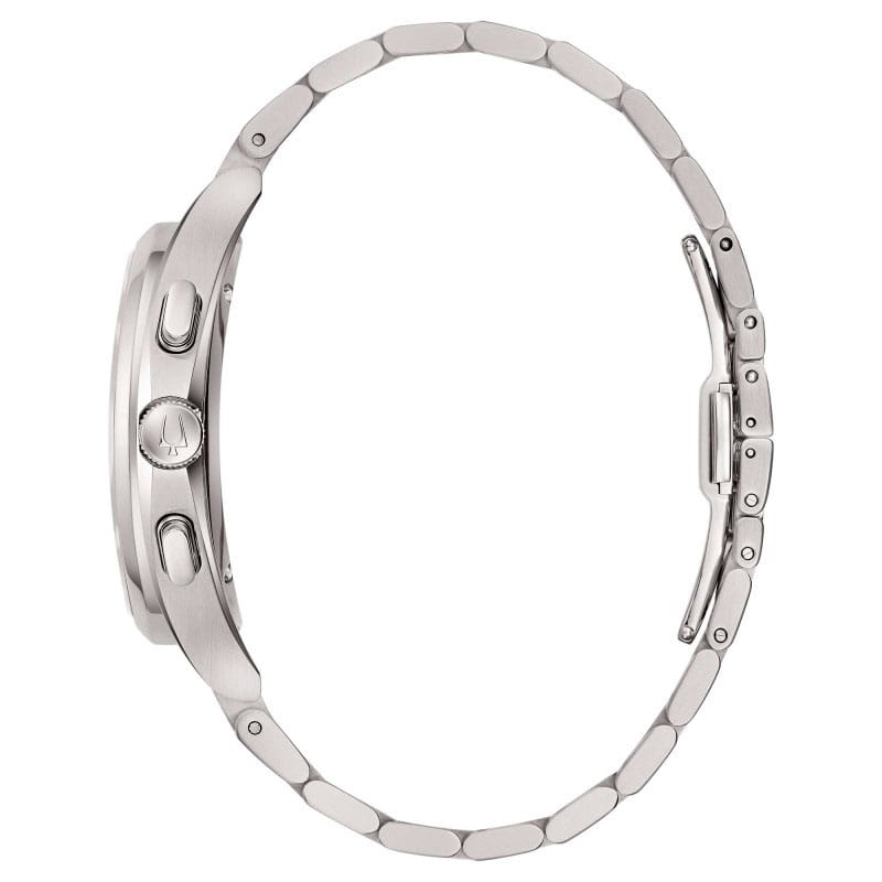 Мужские кварцевые часы-хронографХронографФункция позволяет измерять отрезки времени с особой точностью: часы, минуты, секунды. Верным признаком хронографа является наличие на циферблате 3 дополнительных окошек-счётчиков. Bulova CURV 96A297 – отражающий идеальное сочетание современного дизайна, надёжности и функциональности. Элегантный облик станет превосходным завершением образа, наделив его индивидуальным характером. Корпус из нержавеющей стали серебристого цвета, диаметром 44 мм идеально сбалансирован и элегантен. Защиту циферблата обеспечивает прочное сапфировое стеклоСапфировое стеклоПрочный и надёжный материал из кристалла сапфира синтетического происхождения, характеризующийся особой твёрдостью и устойчивостью к царапинам и повреждениям. с антибликовым покрытиемАнтибликовое покрытиеСлой оксида металла в 0,13-0,3 микрон, благодаря которому стекло часов не бликует и не отражает свет. Антибликовое покрытие уменьшает отражение света в 10 раз, обеспечивая отличную читаемость показателей циферблата. гарантирующее четкость показаний. Центральные часовая и минутная стрелки, секундная стрелка вынесена на малый циферблат. Стальной браслет на застёжке-бабочке с кнопкамиЗастёжка "бабочка"Такой вид застёжки дополняется предохранителями, помогающими избежать случайного раскрытия браслета. Обладают изящным исполнением. обеспечивает комфортное ношение. Водозащита 30 метров позволит защитить корпус от случайных брызг или капель дождя. Стрелки с люминесцентным покрытиемЛюминесцентное покрытиеПозволяет считывать показания времени в темноте. Производители наносят на стрелки, часовые индексы, безель или поверхность циферблата светонакопительный состав, дающий холодное свечение. позволяющие легко определять время даже в темноте. Эта модель – отличный выбор для тех, кто ищет сочетание стиля, качества и функциональности. Часы станут не только полезным аксессуаром, но и выразительным элементом вашего имиджа.