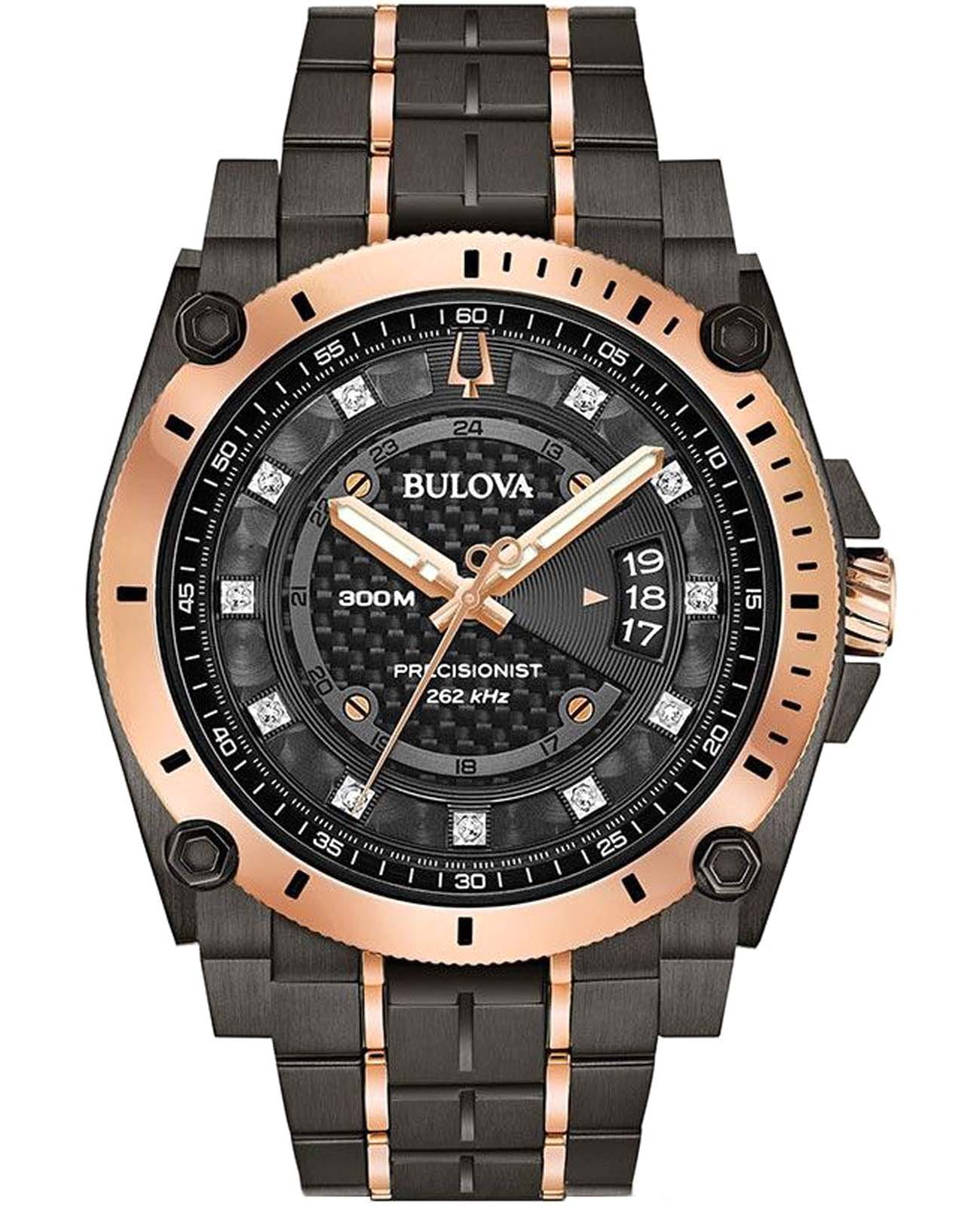 Мужские кварцевые наручные часы Bulova Precisionist 98D149 – отражающий идеальное сочетание современного дизайна, надёжности и функциональности. Корпус из нержавеющей стали с IP-покрытиемIP-покрытиеМетод ионного напыления. Демонстрирует повышенную устойчивость к истиранию, окислению и химическим веществам. Под воздействием высокого давления и температуры около 1500°C молекулы металла надёжно соединяются с частицами корпуса часов. черного цвета, диаметром 46.5 мм идеально сбалансирован и надежен. Минеральное стеклоМинеральное стеклоМинеральное стекло представляет собой искусственно выращенный минерал кварца. Такое стекло отличается особой устойчивостью к повреждениям и царапинам. Уступает по некоторым качествам сапфировому стеклу. защищает циферблат от царапин и устойчивое к механическим повреждениям. Апертура даты в позиции 3 часов. 12/24х часовой формат времени. Стальной браслет на раскладной застёжке с фиксаторомРаскладная застёжкаТакой тип застёжки используется только на браслетах из металла. Она никогда не раскрывается полностью, происходит разделение на 2 и более частей. Раскладывающая застёжка снизит вероятность потери часов к минимуму. обеспечивает комфортное ношение. БезельБезельВнешний ободок, закрепляющий стекло. В спортивных часах так называется поворотное кольцо с делениями на циферблате, выполняет роль таймера – замеряет отрезки времени на шкале. Неподвижный безель – элемент декора. Однонаправленно вращающийся безель на дайверских часах позволяет фиксировать моменты погружения и выныривания на поверхность. с IP-покрытиемIP-покрытиеМетод ионного напыления. Демонстрирует повышенную устойчивость к истиранию, окислению и химическим веществам. Под воздействием высокого давления и температуры около 1500°C молекулы металла надёжно соединяются с частицами корпуса часов. цвета розового золота. Водозащита 300 метров позволит плавать, нырять и заниматься другими водными видами спорта. Стрелки с люминесцентным покрытиемЛюминесцентное покрытиеПозволяет считывать показания времени в темноте. Производители наносят на стрелки, часовые индексы, безель или поверхность циферблата светонакопительный состав, дающий холодное свечение. позволяющие легко определять время даже в темноте. Заводная головка с защитой. Эта модель – отличный выбор для тех, кто ищет сочетание стиля, качества и функциональности. Часы станут не только полезным аксессуаром, но и выразительным элементом вашего имиджа.