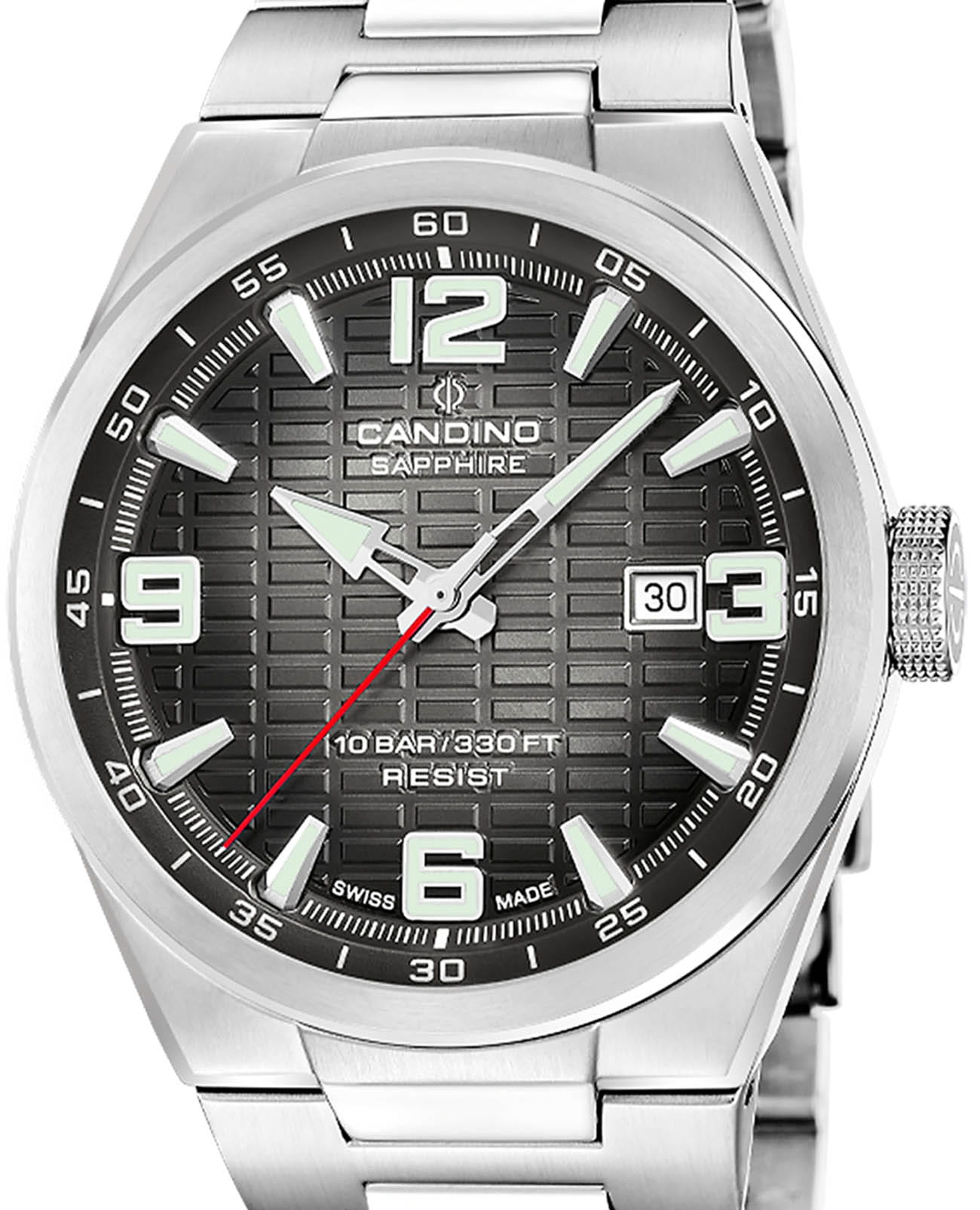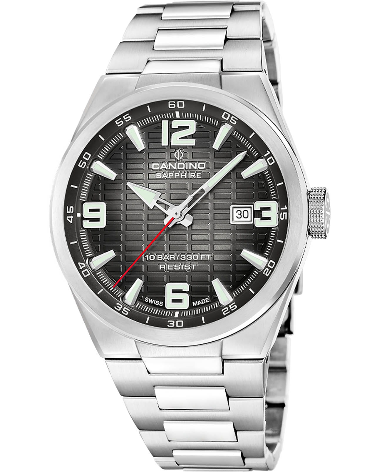 Мужские кварцевые часы Candino из коллекции Series 1947 — это сочетание классического дизайна, надёжности и швейцарского качества. Корпус диаметром 43 мм выполнен из нержавеющей стали. Циферблат чёрного цвета оформлен индексами и стрелками с люминесцентным покрытиемЛюминесцентное покрытиеПозволяет считывать показания времени в темноте. Производители наносят на стрелки, часовые индексы, безель или поверхность циферблата светонакопительный состав, дающий холодное свечение.. Окошко даты расположено в положении 3 часов. Циферблат защищён сапфировым стекломСапфировое стеклоПрочный и надёжный материал из кристалла сапфира синтетического происхождения, характеризующийся особой твёрдостью и устойчивостью к царапинам и повреждениям., устойчивым к царапинам. Механизм — кварцевый, обеспечивает высокую точность хода. Часы оснащены стальным браслетом с раскладной застёжкойРаскладная застёжкаТакой тип застёжки используется только на браслетах из металла. Она никогда не раскрывается полностью, происходит разделение на 2 и более частей. Раскладывающая застёжка снизит вероятность потери часов к минимуму.. Водонепроницаемость 100 м позволяет использовать часы для плавания и повседневного ношения. Гарантия — 2 года. Идеальный выбор для тех, кто ценит стиль, точность и надёжность.