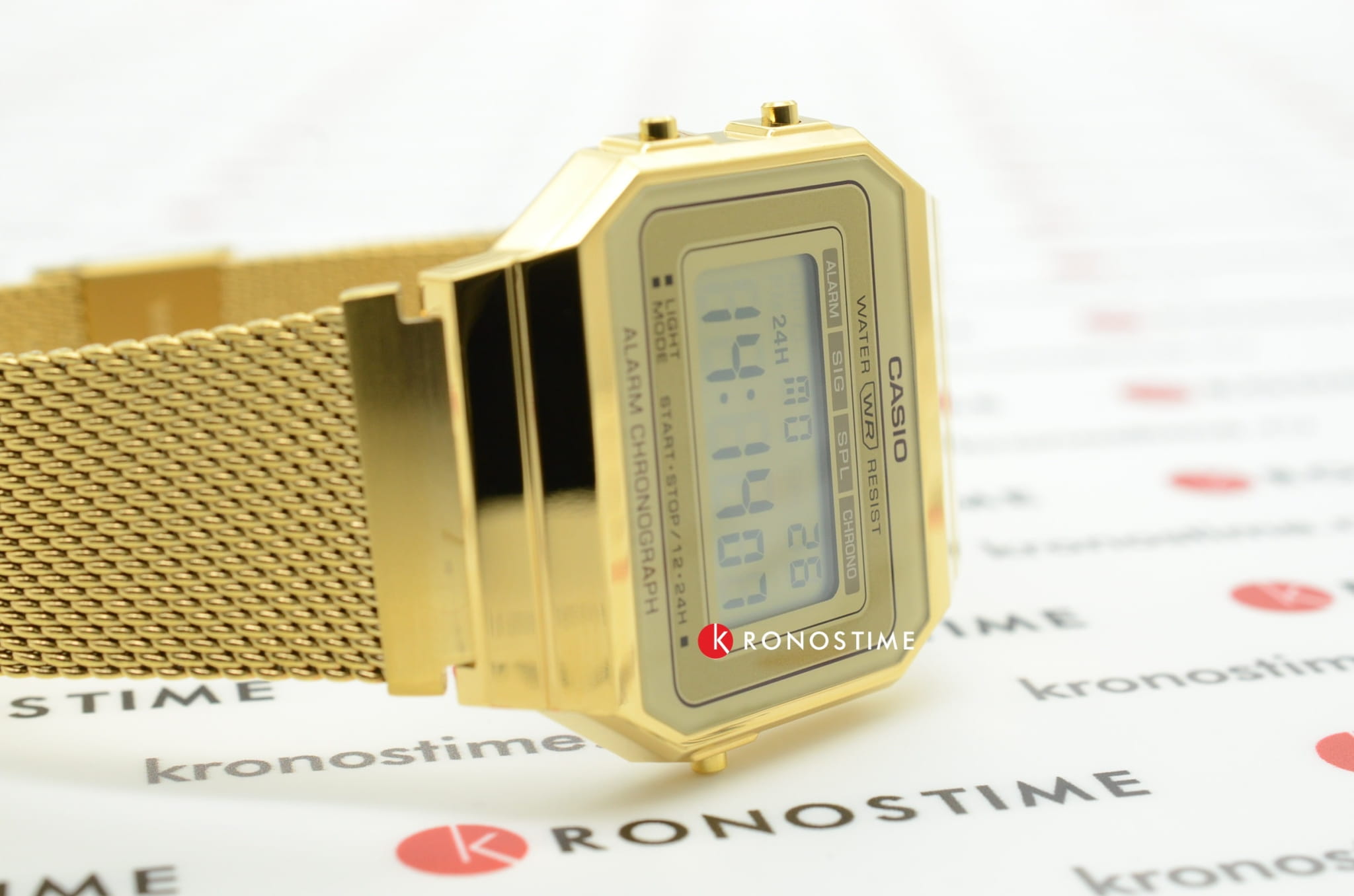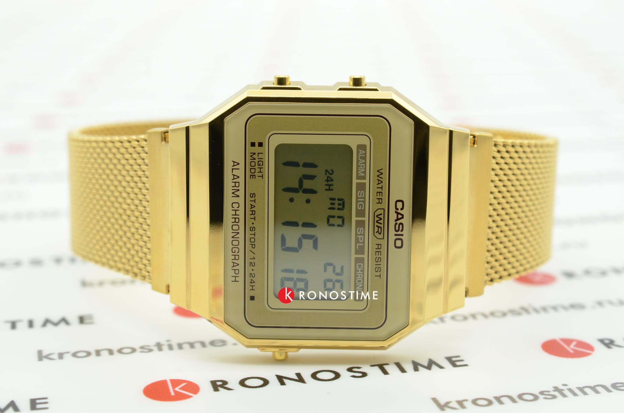 Золотистое исполнение сочетается с любой одеждой, это универсальный вариант на каждый день. Компактный корпус из полимерного пластика отлично смотрится на запястье. Модель обладает базовым функционалом: будильник, секундомер, автоматический календарь. Особый стиль придаёт браслет из нержавеющей стали 316L миланского плетения. Батарейка рассчитана на 3 года службы. Минеральное стекло препятствует образованию царапин. Габариты: 38,6 x 36,3 x 9,6 мм.