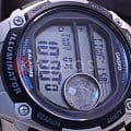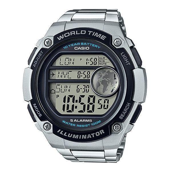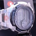 Японские спортивные наручные кварцевые мужские часы с пятью будильниками. ЖК циферблат серого цвета.  Корпус - Пластиковый; Стекло - Минеральное; Водозащита - 100 м. (WR 100); Материал ремешка - Нержавеющая сталь; Цвет ремешка - Серебристый; Цвет циферблата - Lcd.
