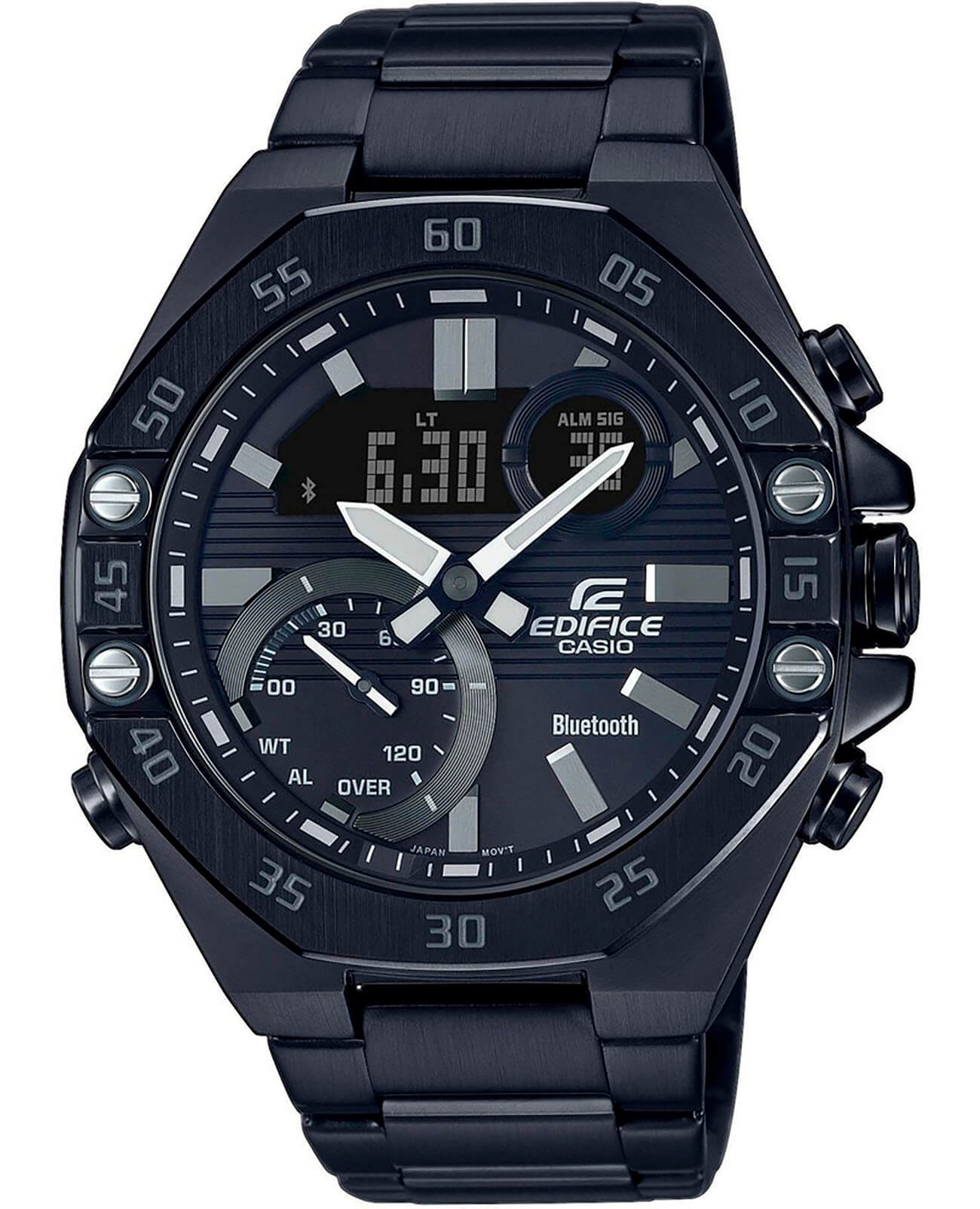 Аналого-цифровой хронографХронографФункция позволяет измерять отрезки времени с особой точностью: часы, минуты, секунды. Верным признаком хронографа является наличие на циферблате 3 дополнительных окошек-счётчиков. отличается синим циферблатом с гоночным характером и горизонтальным узором. Необычным элементом стал 8-угольный безельБезельВнешний ободок, закрепляющий стекло. В спортивных часах так называется поворотное кольцо с делениями на циферблате, выполняет роль таймера – замеряет отрезки времени на шкале. Неподвижный безель – элемент декора. Однонаправленно вращающийся безель на дайверских часах позволяет фиксировать моменты погружения и выныривания на поверхность. с 4-мя винтами. Он напоминает о профессиональных инструментах, используемых при обслуживании гоночных болидов. Часы оснащены запланированным таймером для грамотного распределения времени. Он получает информацию с календаря посредством технологии BluetoothBluetoothСовременная технология, позволяющая синхронизировать часы с телефоном и переносить данные. Часы с Bluetooth расширяют возможности вашего смартфона и делают его использование ещё более удобным.. Японский кварцевый механизм. Срок службы батарейки CR2016 - 2 года. Двойная светодиодная подсветкаСветодиодная подсветкаСветодиодная или LED-подсветка обеспечивает появление яркого холодного свечения за счёт LED-элементов - маленьких лампочек. Они потребляют минимальное количество энергии, чаще всего можно встретить 1 светодиод, в нижней части циферблата.. Корпус и браслет из антикоррозионной стали 316L с IP-покрытиемIP-покрытиеМетод ионного напыления. Демонстрирует повышенную устойчивость к истиранию, окислению и химическим веществам. Под воздействием высокого давления и температуры около 1500°C молекулы металла надёжно соединяются с частицами корпуса часов.. Минеральное стекло. Автоматическая коррекция стрелок. Водонепроницаемость 100 метров. Будильник, мировое времяМировое время Полезное часовое усложнение, отображающее время в основных городах и известных областях по всему миру, оно связано с часовыми поясами, удобно для путешественников и бизнесменов. , секундомер, автоматический календарь. Габариты: 51 x 48,5 x 12,5 мм.