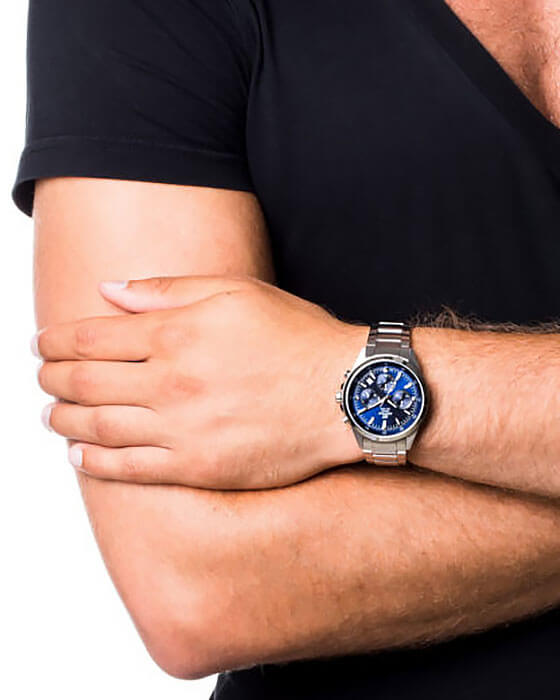 Компактный циферблат синего цвета стал отражением автомобильной динамики, благодаря классической цветовой гамме часы идеально смотрятся с любой одеждой. Аксессуар выполнен из стали 316L, известной за счёт долговечности и антикоррозионных свойств. Кварцевый японский механизм Miyota. Батарейка рассчитана на 2 года работы. Водозащита 100 метров. Закручивающаяся задняя крышка. Яркая люминесцентная подсветкаЛюминесцентное покрытиеПозволяет считывать показания времени в темноте. Производители наносят на стрелки, часовые индексы, безель или поверхность циферблата светонакопительный состав, дающий холодное свечение.. Минеральное стекло. ХронографХронографФункция позволяет измерять отрезки времени с особой точностью: часы, минуты, секунды. Верным признаком хронографа является наличие на циферблате 3 дополнительных окошек-счётчиков., секундомер, отображение даты. Габариты: 47,4 x 41 x 11,6 мм.