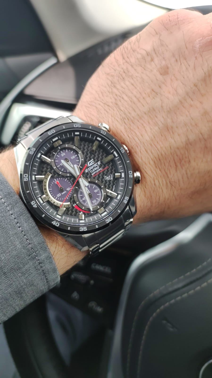 Габаритные наручные часы станут ключевой деталью для повседневного образа, привлекательно выглядят элементы красного цвета. Интерес вызывает необычный тёмный циферблат, имеющий карбоновую текстуру, переплетённые волокна образуют оригинальный узор. Ударопрочный корпусУдаропрочный корпусМеханизм заключён в корпус, выполненный из современных материалов, устойчивых к ударам, механическим повреждениям и падению с высоты: инновационный пластик, карбон, нержавеющая сталь, титан. и браслет на раскладной застёжкеРаскладная застёжкаТакой тип застёжки используется только на браслетах из металла. Она никогда не раскрывается полностью, происходит разделение на 2 и более частей. Раскладывающая застёжка снизит вероятность потери часов к минимуму. сделаны из стали 316L с антикоррозионными свойствами, за счёт чего часы надолго сохранят безупречный внешний вид. Модель получает питание от солнечного света Tough SolarTough SolarТехнология основана на подзарядке аккумулятора от источника солнечного света, специальная панель улавливает солнечные лучи и преобразует их в энергию для работы часов. Достаточно пары минут нахождения на солнце для функционирования часов в течении суток., состояние заряда можно отслеживать благодаря наличию особого индикатора. БезельБезельВнешний ободок, закрепляющий стекло. В спортивных часах так называется поворотное кольцо с делениями на циферблате, выполняет роль таймера – замеряет отрезки времени на шкале. Неподвижный безель – элемент декора. Однонаправленно вращающийся безель на дайверских часах позволяет фиксировать моменты погружения и выныривания на поверхность. с чёрным IP-покрытиемIP-покрытиеМетод ионного напыления. Демонстрирует повышенную устойчивость к истиранию, окислению и химическим веществам. Под воздействием высокого давления и температуры около 1500°C молекулы металла надёжно соединяются с частицами корпуса часов.. Закручивающаяся крышка с резьбовым соединением. Водонепроницаемость 100 метров. Подсветка NeobriteПодсветка NeobriteИспользование светонакопительных составов на основе сульфида цинка или алюмината стронция, яркий свет можно наблюдать на протяжении 6-10 часов после «зарядки» часов около источника света.. Сапфировое стеклоСапфировое стеклоПрочный и надёжный материал из кристалла сапфира синтетического происхождения, характеризующийся особой твёрдостью и устойчивостью к царапинам и повреждениям.. Часы-хронографХронографФункция позволяет измерять отрезки времени с особой точностью: часы, минуты, секунды. Верным признаком хронографа является наличие на циферблате 3 дополнительных окошек-счётчиков. с секундомеромСекундомерСекундоме́р — прибор, способный измерять интервалы времени с точностью до долей секунды. с точностью показаний 1с и временем измерения 30мин. Габариты: 51,5 x 47,6 x 12 мм.
