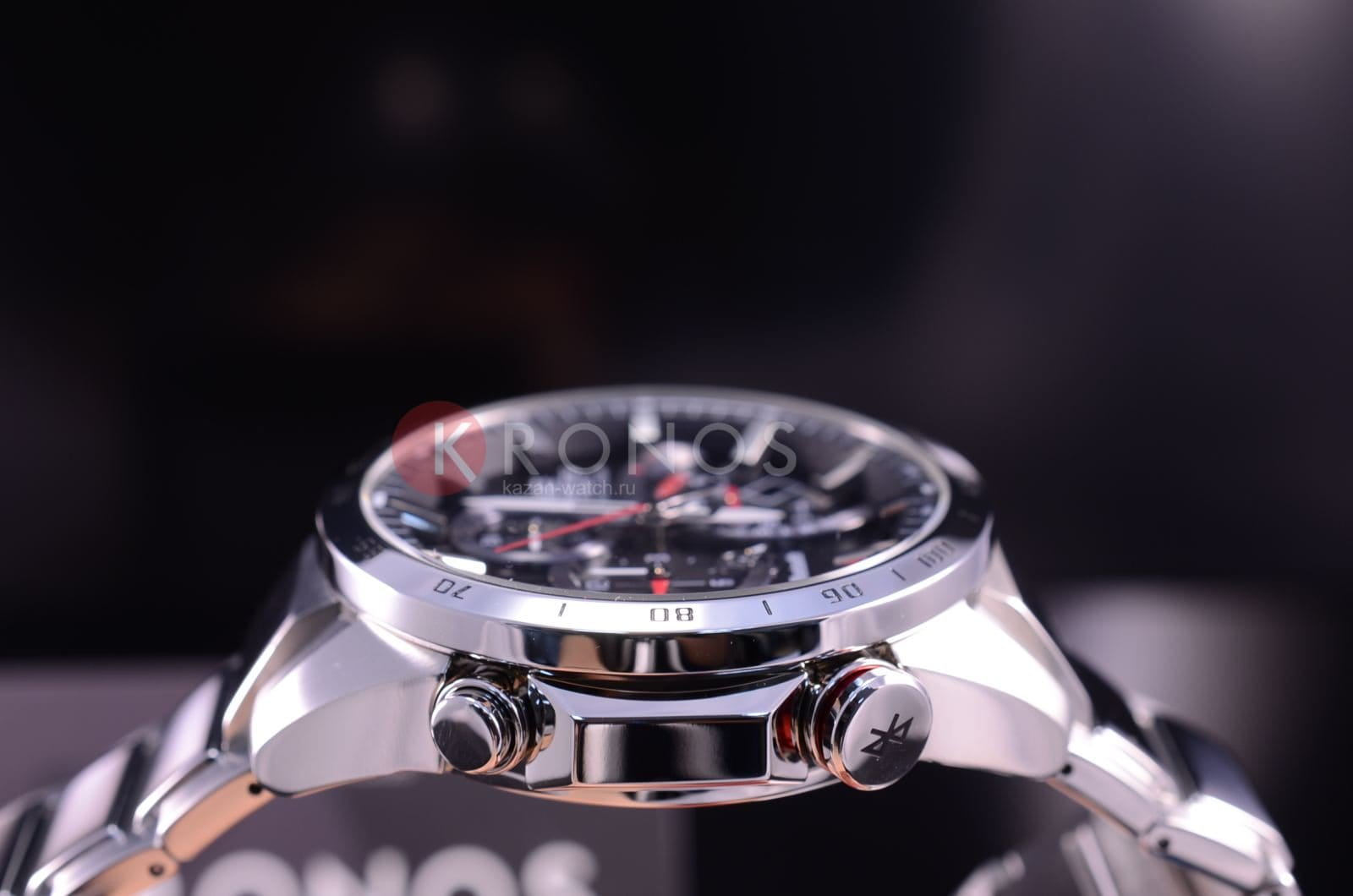 Общее исполнение аксессуара выдержано в автомобильной стилистике, тёмный циферблат отличается оригинальным расположением счётчиков. Наручные часы оснащены технологией BluetoothBluetoothСовременная технология, позволяющая синхронизировать часы с телефоном и переносить данные. Часы с Bluetooth расширяют возможности вашего смартфона и делают его использование ещё более удобным. с низким потреблением энергии, позволяющей часам считывать информацию с интернет-сервера точного времени и обеспечивать абсолютную точность времени. Питание происходит за счёт солнечной батареи - . Водонепроницаемость 100 метров. Минеральное стекло. Люминесцентная подсветкаЛюминесцентное покрытиеПозволяет считывать показания времени в темноте. Производители наносят на стрелки, часовые индексы, безель или поверхность циферблата светонакопительный состав, дающий холодное свечение.. Наличие авиарежима. Функции: уведомление о полученных сообщениях по электронной почте, поиск телефона, отображение числа и дня недели, секундомер, будильник, тахиметрТахиметрРазмеченная шкала, располагается на ободке или безеле часов. Тахиметр позволяет рассчитать скорость на определённом участке пути, расстояние измеряется в километрах или милях., расчёт средней скорости пройденного маршрута. Габариты: 52 x 48,1 x 14,2 мм.