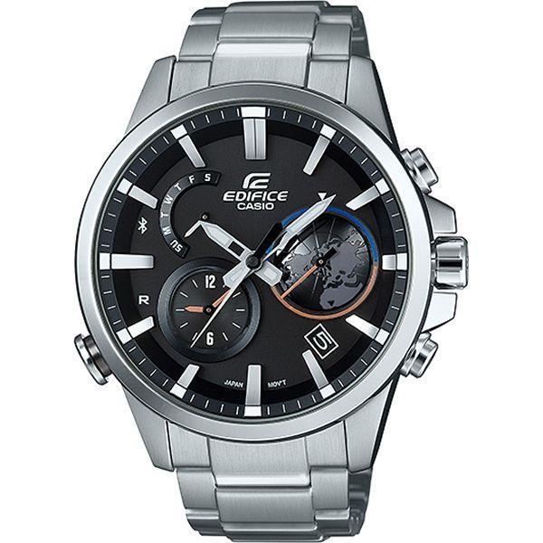 Высокотехнологичный аксессуар в чёрно-серебристой расцветке имеет лаконичное исполнение с оригинальными счётчиками на циферблате. Наручные часы Edifice Smartphone Link оснащены Bluetooth 4.0BluetoothСовременная технология, позволяющая синхронизировать часы с телефоном и переносить данные. Часы с Bluetooth расширяют возможности вашего смартфона и делают его использование ещё более удобным., позволяющей корректировать текущее время и копировать настройки мирового времениМировое время Полезное часовое усложнение, отображающее время в основных городах и известных областях по всему миру, оно связано с часовыми поясами, удобно для путешественников и бизнесменов. с помощью интернет-сервиса. Часы не нуждаются в подзаводе благодаря технологии питания от солнечного света . Без подзарядки модель может проработать до 5 месяцев. Люминесцентная подсветка NeobriteПодсветка NeobriteИспользование светонакопительных составов на основе сульфида цинка или алюмината стронция, яркий свет можно наблюдать на протяжении 6-10 часов после «зарядки» часов около источника света.. Авиарежим. Минеральное стекло. Ударопрочный корпусУдаропрочный корпусМеханизм заключён в корпус, выполненный из современных материалов, устойчивых к ударам, механическим повреждениям и падению с высоты: инновационный пластик, карбон, нержавеющая сталь, титан. и браслет из нержавеющей стали 316L. Водостойкость 100 метров. Завинчивающаяся заводная головка. Функция поиска телефона, приём уведомлений о новых письмах электронной посты, секундомер, автоматический календарь, расчёт средней скорости пройденного маршрута. Габариты: 47,3 x 51,9 x 13,3 мм.
