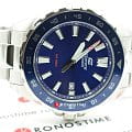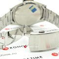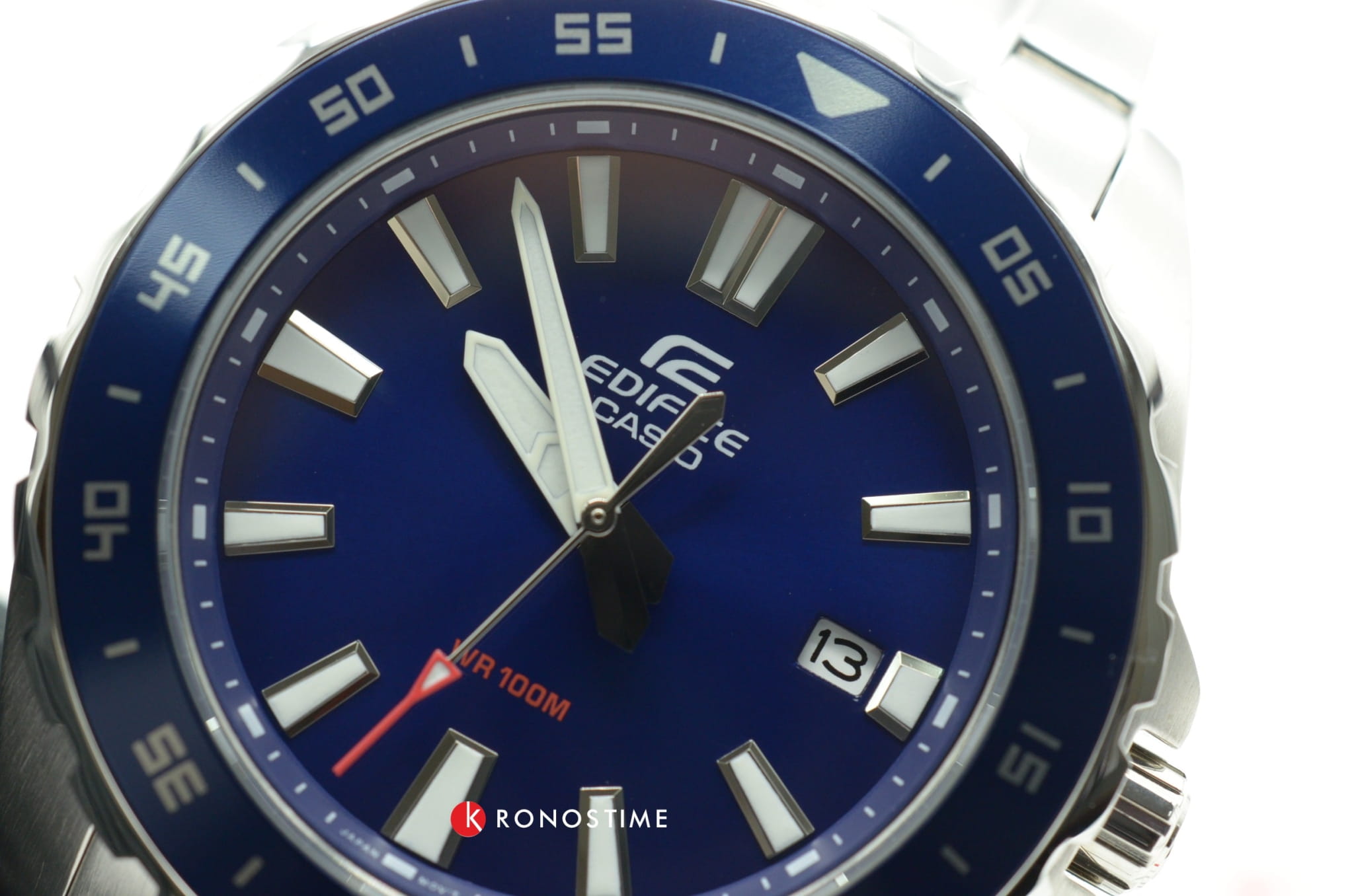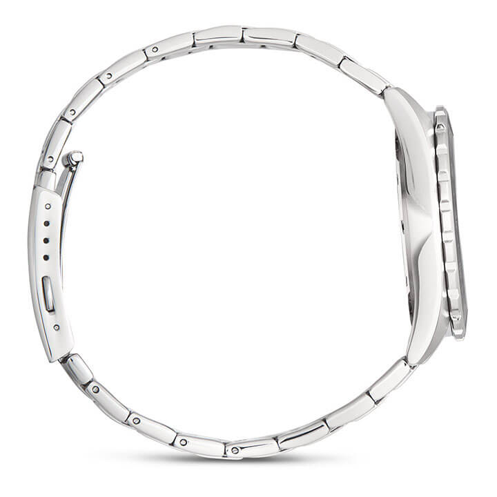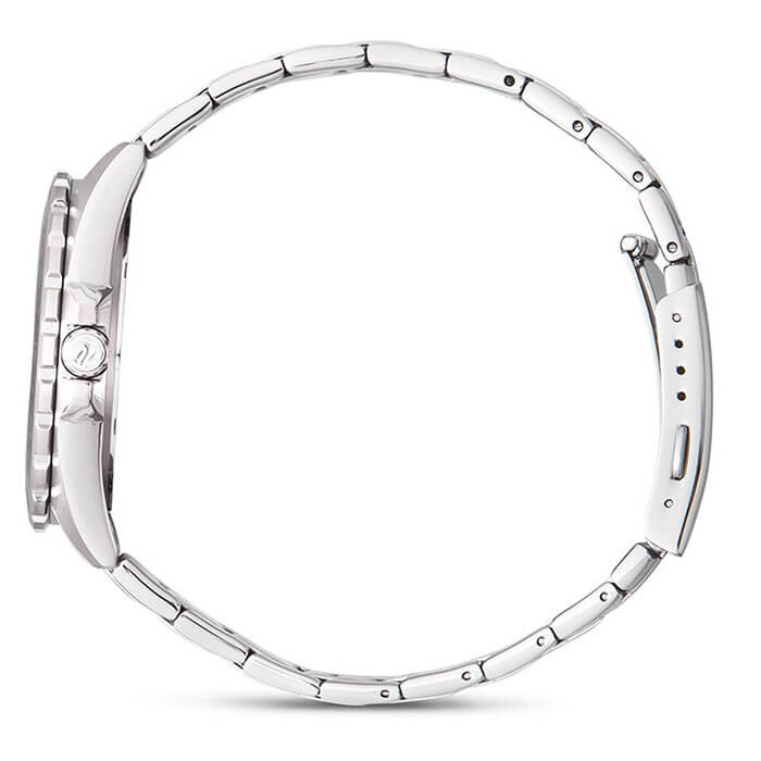 Серебристо-синяя модель наделена элементами дайверского дизайна, повторяя внешний облик механических часов для дайвинга 1950-х годов, в глаза бросается массивный однонаправленно вращающийся безельБезельВнешний ободок, закрепляющий стекло. В спортивных часах так называется поворотное кольцо с делениями на циферблате, выполняет роль таймера – замеряет отрезки времени на шкале. Неподвижный безель – элемент декора. Однонаправленно вращающийся безель на дайверских часах позволяет фиксировать моменты погружения и выныривания на поверхность. с фигурным краем, крупные стрелки и часовые индексы. Секундная стрелка дополнена красным наконечником, что обеспечивает превосходную читаемость показаний с циферблата. Кварцевый японский механизм с точностью хода часов +/- 20 секунд в месяц. Батарейка рассчитана на 3 года работы. Люминесцентная подсветка NeobriteПодсветка NeobriteИспользование светонакопительных составов на основе сульфида цинка или алюмината стронция, яркий свет можно наблюдать на протяжении 6-10 часов после «зарядки» часов около источника света.. Водонепроницаемость при давлении до 10 бар. Ударопрочный корпусУдаропрочный корпусМеханизм заключён в корпус, выполненный из современных материалов, устойчивых к ударам, механическим повреждениям и падению с высоты: инновационный пластик, карбон, нержавеющая сталь, титан. и браслет из нержавеющей стали 316L. Цветное IP-покрытиеIP-покрытиеМетод ионного напыления. Демонстрирует повышенную устойчивость к истиранию, окислению и химическим веществам. Под воздействием высокого давления и температуры около 1500°C молекулы металла надёжно соединяются с частицами корпуса часов.. Минеральное стекло. Окошко индикации числа. Габариты: 42 x 37,8 x 9,4 мм.