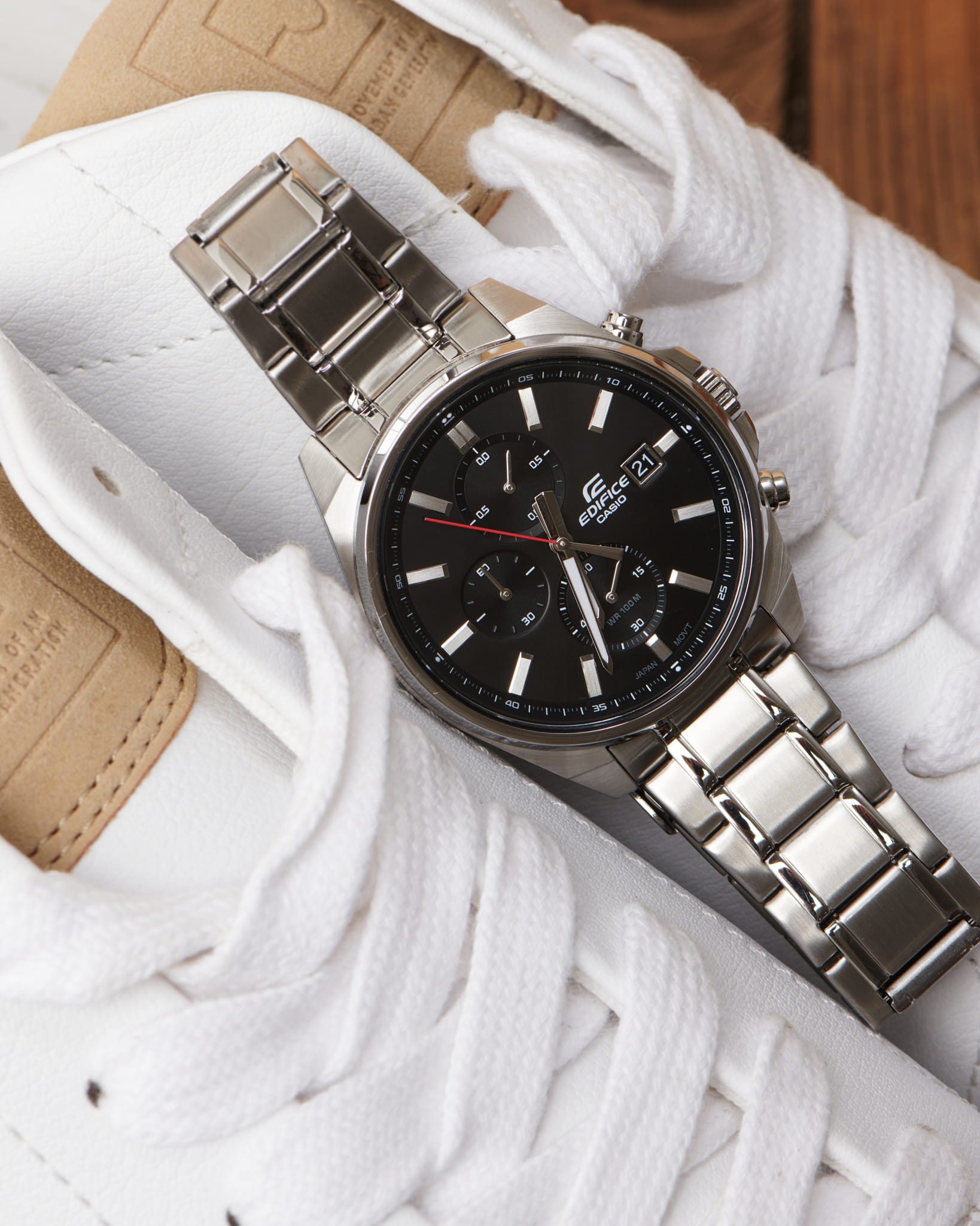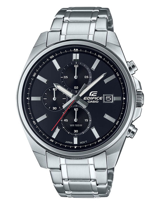 Модель Casio Edifice EFV-610D-1AVUDF сочетает спортивный стиль и функциональность, предлагая удобство в повседневном использовании. Корпус диаметром 43,8 мм выполнен из нержавеющей стали, а тонкий безельБезельВнешний ободок, закрепляющий стекло. В спортивных часах так называется поворотное кольцо с делениями на циферблате, выполняет роль таймера – замеряет отрезки времени на шкале. Неподвижный безель – элемент декора. Однонаправленно вращающийся безель на дайверских часах позволяет фиксировать моменты погружения и выныривания на поверхность. и широкий циферблат с лаконичным дизайном придают часам элегантный и современный вид.