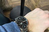 Черный циферблат оснащен дополнительными счетчиками хронографаХронографФункция позволяет измерять отрезки времени с особой точностью: часы, минуты, секунды. Верным признаком хронографа является наличие на циферблате 3 дополнительных окошек-счётчиков. с точностью до 1/10 секунды, а красная секундная стрелка добавляет динамичный акцент. Минеральное стеклоМинеральное стеклоМинеральное стекло представляет собой искусственно выращенный минерал кварца. Такое стекло отличается особой устойчивостью к повреждениям и царапинам. Уступает по некоторым качествам сапфировому стеклу. защищает дисплей от царапин и внешних воздействий.