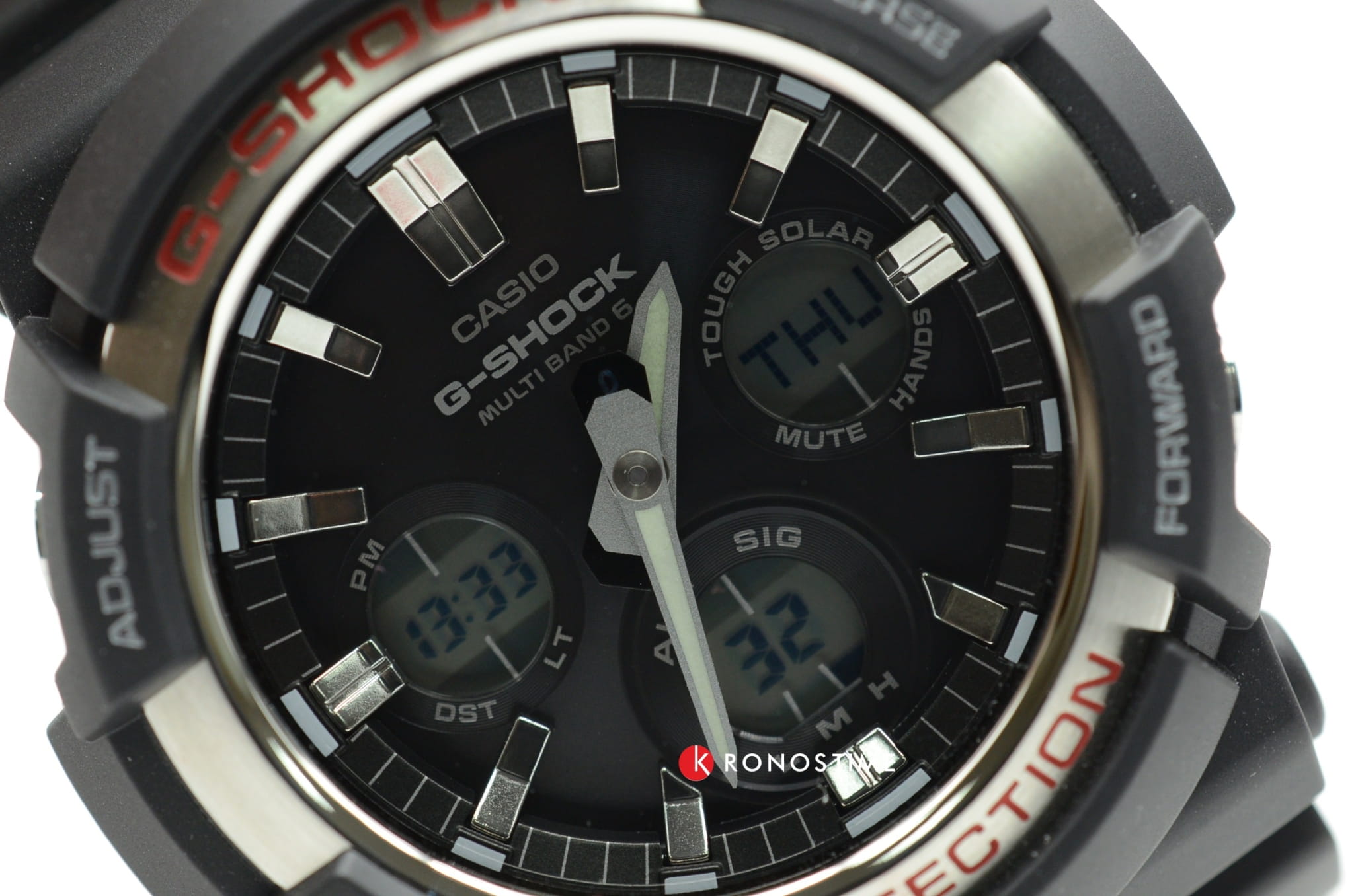 Тёмный циферблат дополнен контрастными стрелками и часовыми метками, расположены счётчики хронографаХронографФункция позволяет измерять отрезки времени с особой точностью: часы, минуты, секунды. Верным признаком хронографа является наличие на циферблате 3 дополнительных окошек-счётчиков.. Гибкий ремешок из полимерного материала не вызывает дискомфорта при ношении и не нуждается в особом уходе. Это наручные часы на солнечной батарее, реализуется технология . Функционал: приём сигнала от 6 радиовышек, автоматический календарь, мировое времяМировое время Полезное часовое усложнение, отображающее время в основных городах и известных областях по всему миру, оно связано с часовыми поясами, удобно для путешественников и бизнесменов. , секундомер, таймер, будильник. Минеральное стекло. Ударопрочный полимерный корпусУдаропрочный корпусМеханизм заключён в корпус, выполненный из современных материалов, устойчивых к ударам, механическим повреждениям и падению с высоты: инновационный пластик, карбон, нержавеющая сталь, титан.. Индикатор уровня заряда батарейки. Люминесцентная подсветкаЛюминесцентное покрытиеПозволяет считывать показания времени в темноте. Производители наносят на стрелки, часовые индексы, безель или поверхность циферблата светонакопительный состав, дающий холодное свечение. стрелок, светодиодная подсветкаСветодиодная подсветкаСветодиодная или LED-подсветка обеспечивает появление яркого холодного свечения за счёт LED-элементов - маленьких лампочек. Они потребляют минимальное количество энергии, чаще всего можно встретить 1 светодиод, в нижней части циферблата. дисплея. Габариты: 55,1 x 52,5 x 16,7 мм.