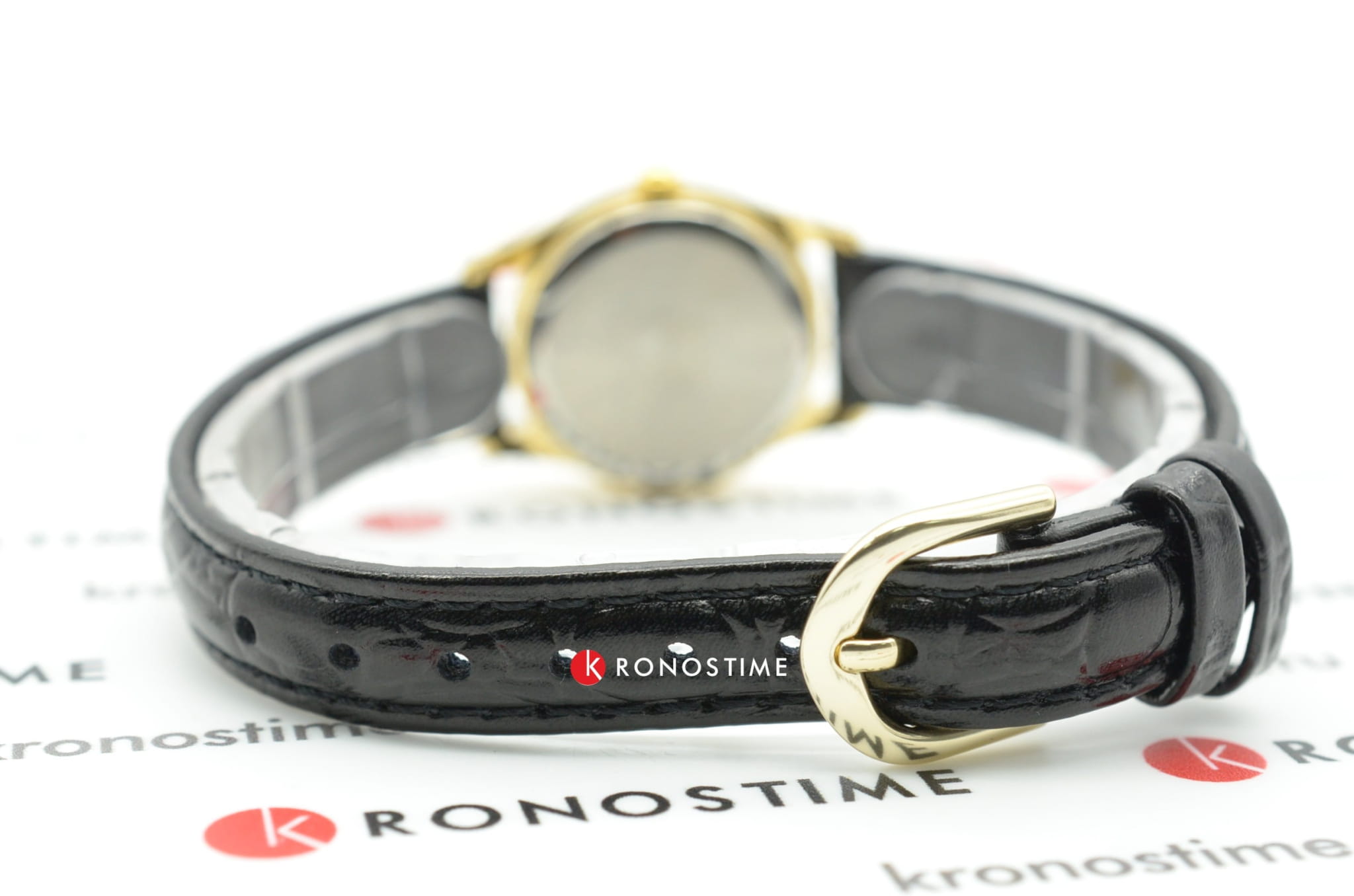 Яркий, золотой корпус часов привлекательно сочетается вместе с черным ремнем из кожи. Циферблат модели имеет круглую форму и выдержан в цвете шампань. На циферблате расположены аккуратные показатели времени и три стильные, золотые стрелки. Кварцевый механизм часов работает от батарейки. Циферблат надежно защищен от повреждений минеральным стеклом. Данная модель имеет показатель водонепроницаемости WR10. Прочный корпус аксессуара сделан из латуни.