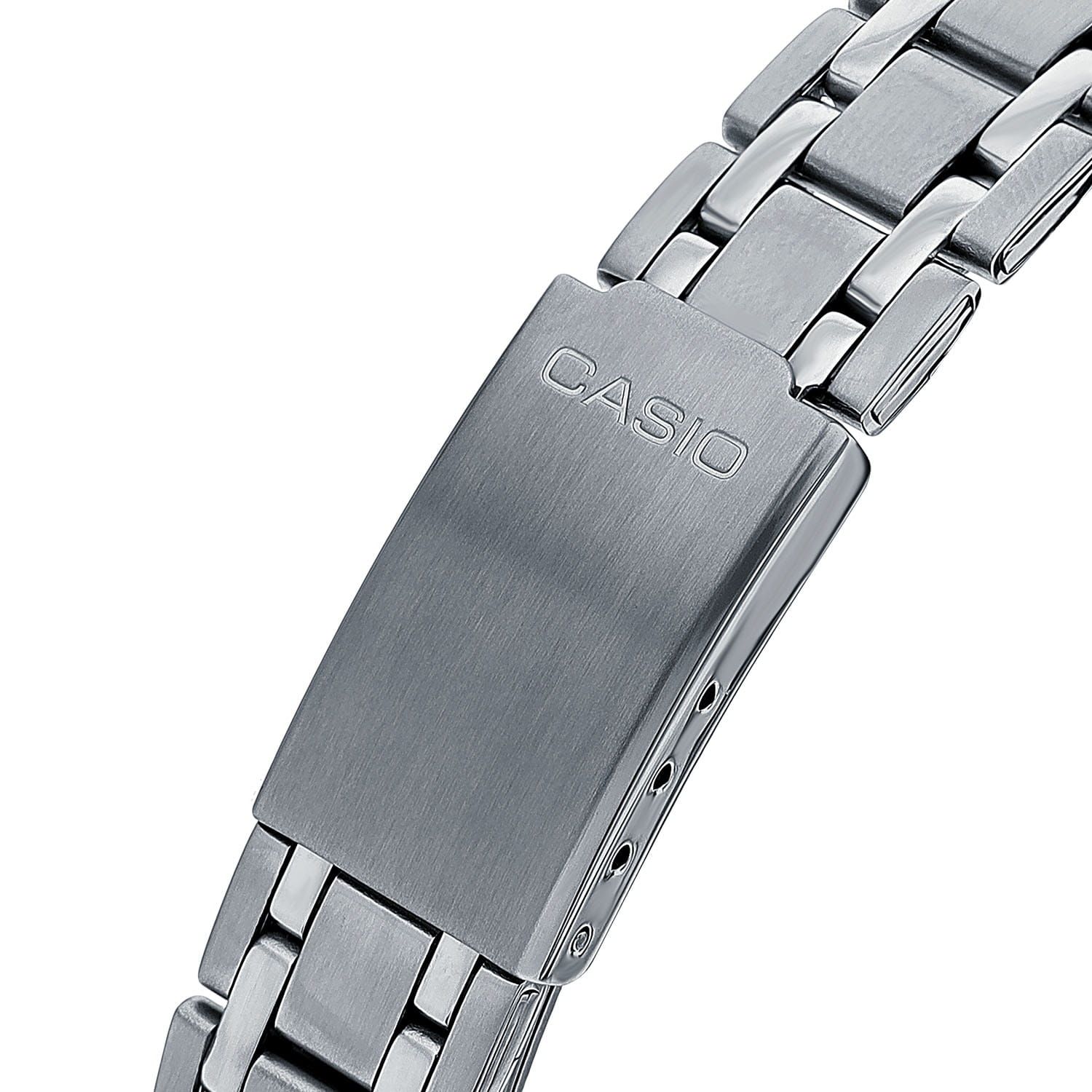 Японские женские часы с минеральным стекломМинеральное стеклоМинеральное стекло представляет собой искусственно выращенный минерал кварца. Такое стекло отличается особой устойчивостью к повреждениям и царапинам. Уступает по некоторым качествам сапфировому стеклу. Casio Collection LTP-1310PD-7B, кварцевый механизм с высокой точностью. Класс водозащиты: 50 метров, позволит защитить корпус от случайных брызг или капель дождя. Корпус часов изготовлен из латуни. Стальной браслет на раскладной застёжкеРаскладная застёжкаТакой тип застёжки используется только на браслетах из металла. Она никогда не раскрывается полностью, происходит разделение на 2 и более частей. Раскладывающая застёжка снизит вероятность потери часов к минимуму.. Подсветка NeobriteПодсветка NeobriteИспользование светонакопительных составов на основе сульфида цинка или алюмината стронция, яркий свет можно наблюдать на протяжении 6-10 часов после «зарядки» часов около источника света..