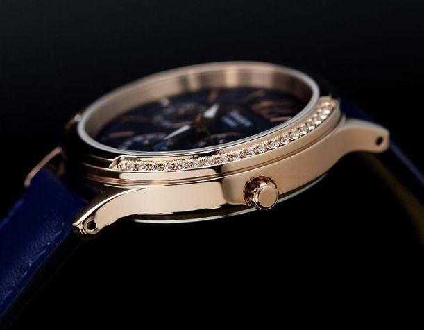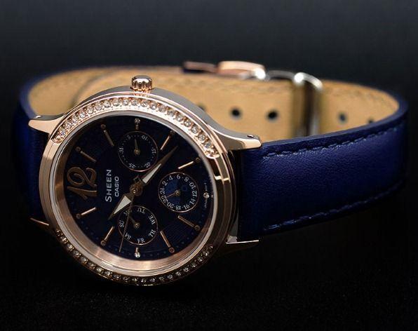 Имиджевые женские наручные часы, выполненные в fashion стиле. Кварцевые часы с элементом питания SR920SW. Корпус часов SHE-3030GL-2A выполнен из высокопрочной стали с полным IP покрытием. Синий фон циферблата перекликается с ярко-синим цветом ремешка из натуральной кожи. Водонепроницаемость часов 50 метров, минеральное стекло.  Украшены часы вставками из кристаллов Swarovski. Эти часы привлекут всеобщее внимание.