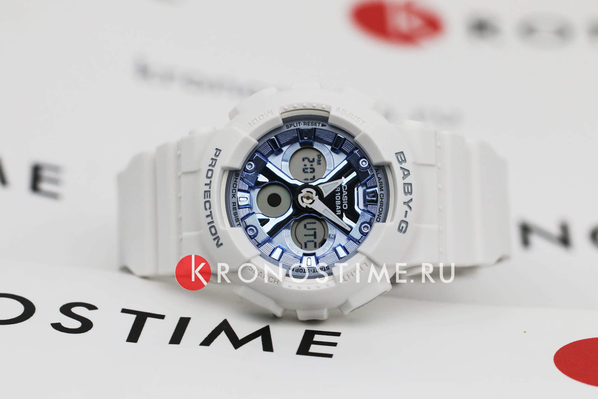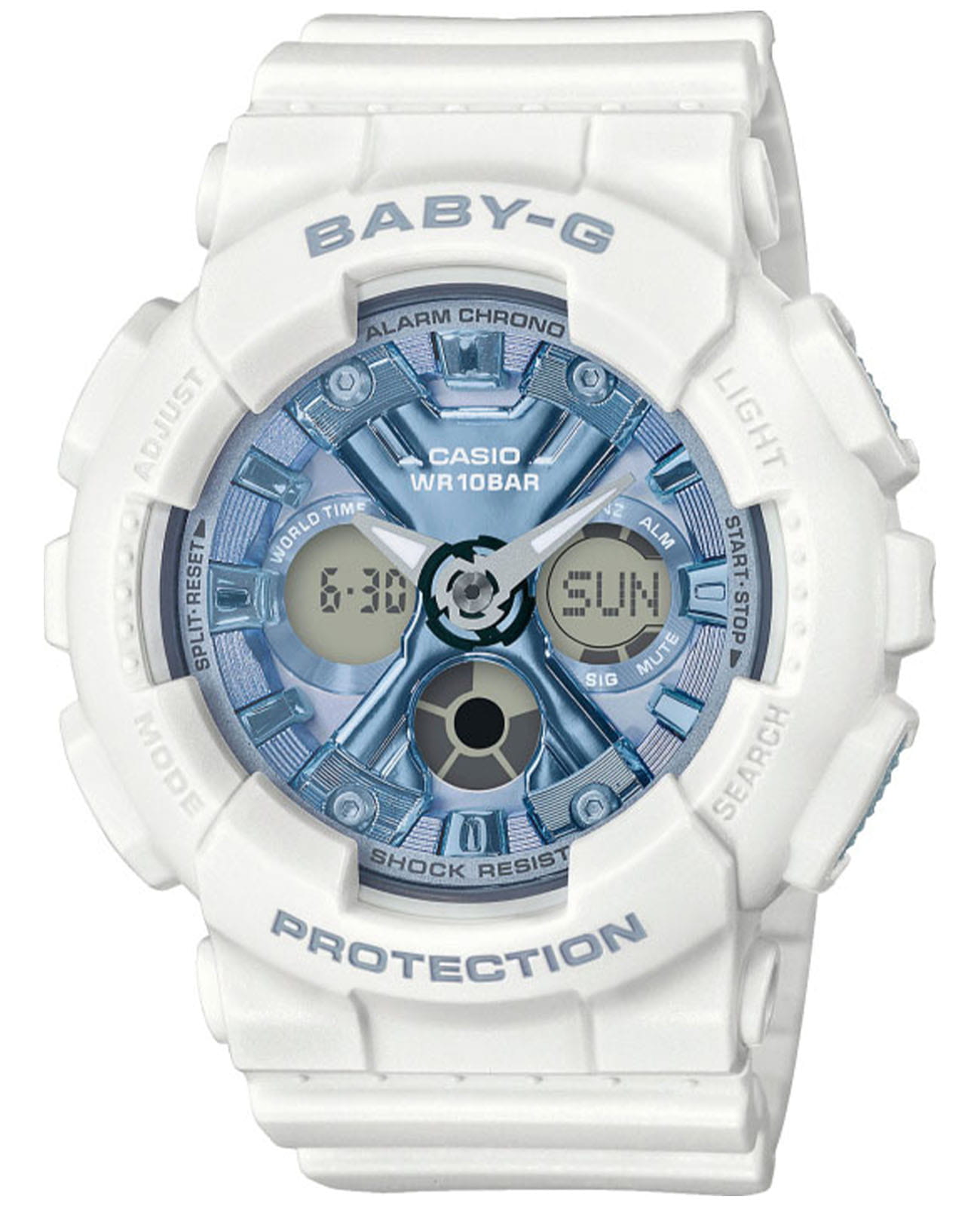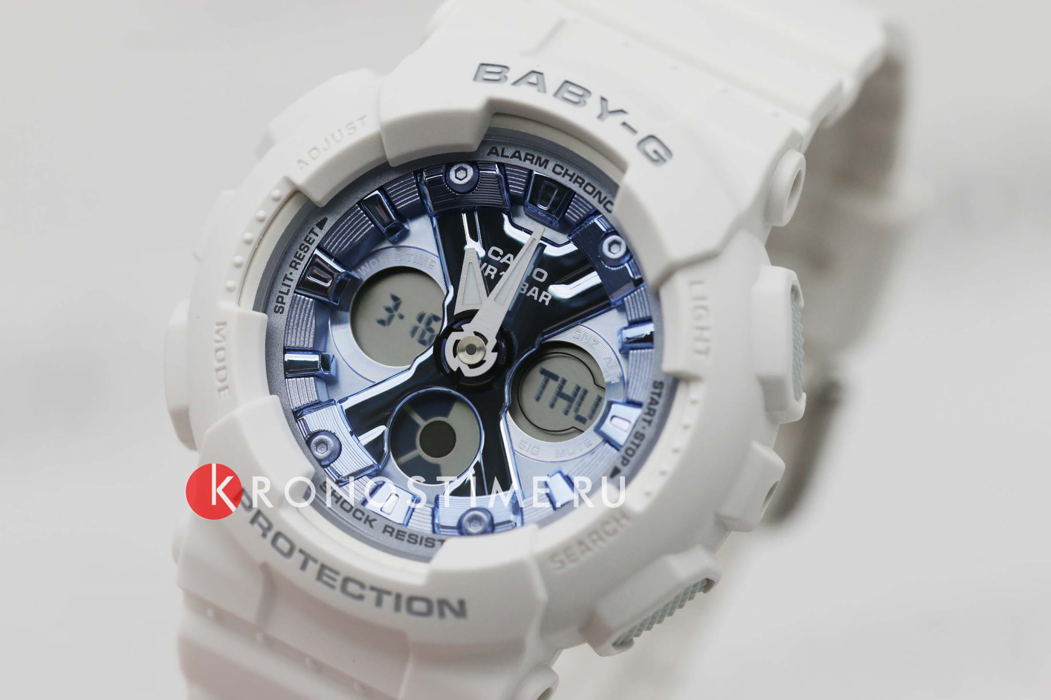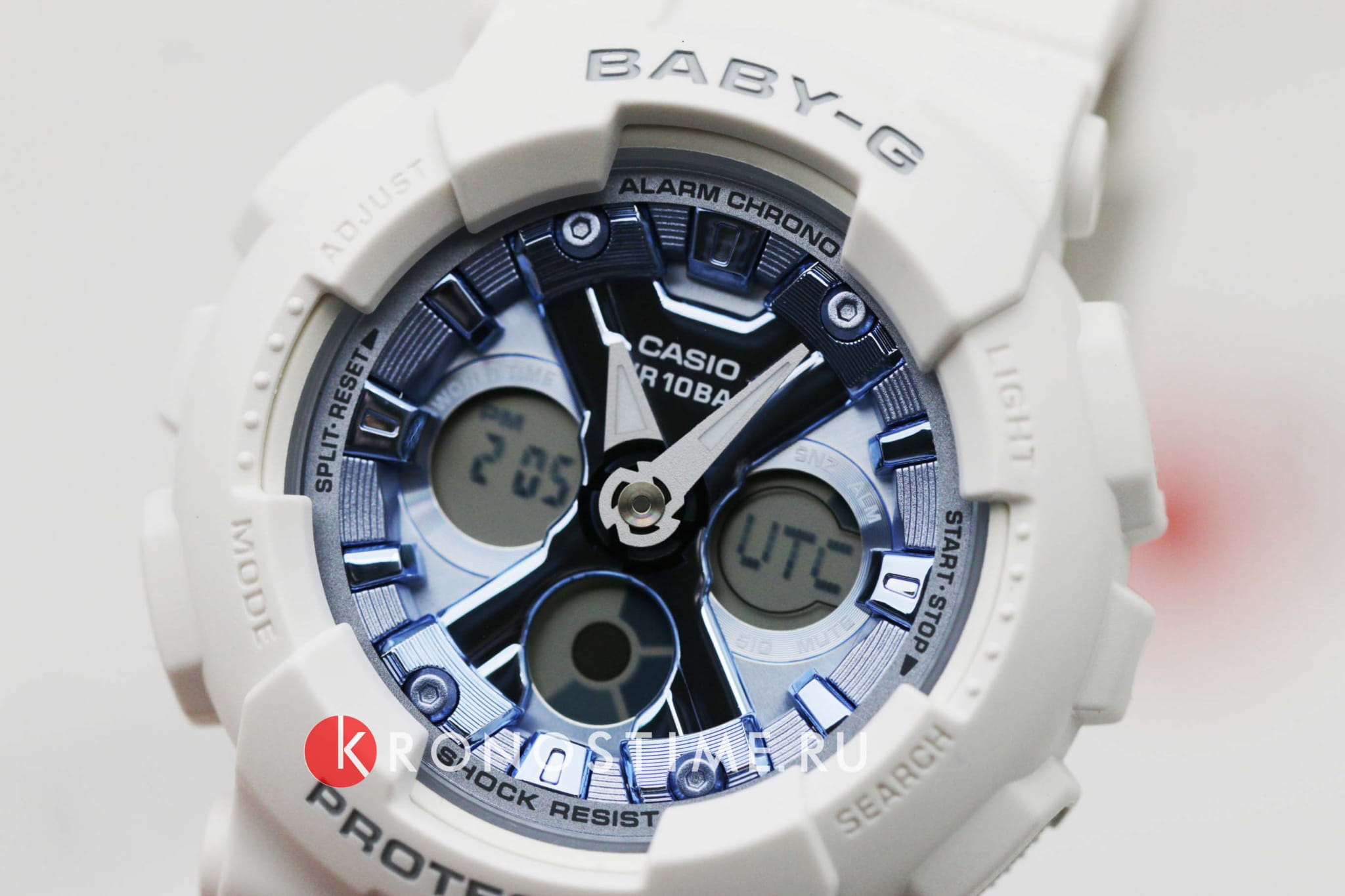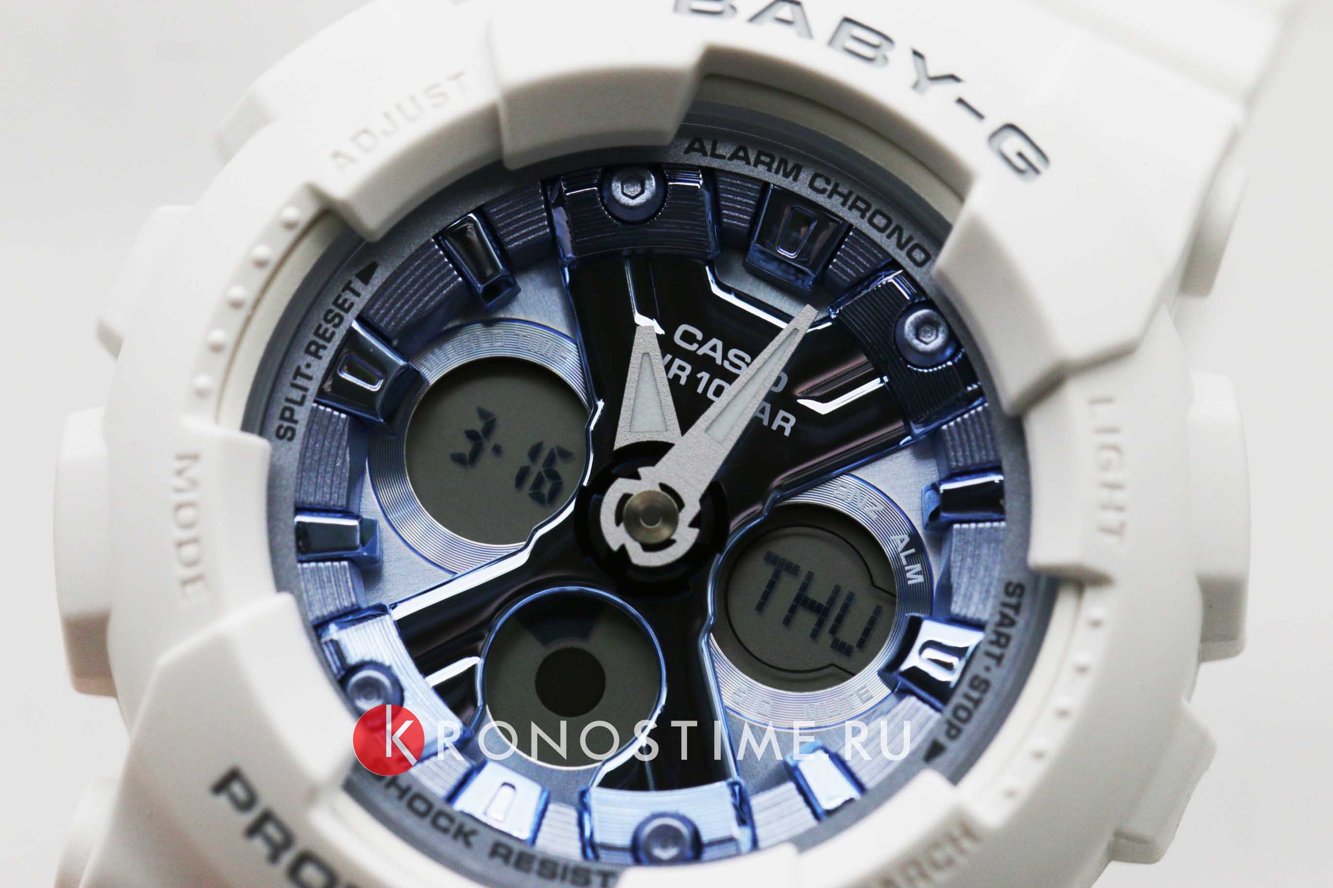 Привлекательно смотрится белый матовый корпус в сочетании с приметным фактурным циферблатом цвета синий металлик. Часы точно понравится девушкам, желающим всегда выглядеть модно и стильно. Противоударный корпусУдаропрочный корпусМеханизм заключён в корпус, выполненный из современных материалов, устойчивых к ударам, механическим повреждениям и падению с высоты: инновационный пластик, карбон, нержавеющая сталь, титан. и ремешок выполнены из полимерного пластика, материал известен за счёт устойчивости к повреждениям и падению с высоты. Японский кварцевый механизм с точностью хода +/- 30 секунд в месяц. Батарейка рассчитана на 2 года. Циферблат со светодиодной подсветкойСветодиодная подсветкаСветодиодная или LED-подсветка обеспечивает появление яркого холодного свечения за счёт LED-элементов - маленьких лампочек. Они потребляют минимальное количество энергии, чаще всего можно встретить 1 светодиод, в нижней части циферблата.. Минеральное стеклоМинеральное стеклоМинеральное стекло представляет собой искусственно выращенный минерал кварца. Такое стекло отличается особой устойчивостью к повреждениям и царапинам. Уступает по некоторым качествам сапфировому стеклу. устойчивое к мелким механическим повреждениям. Ударопрочный корпусУдаропрочный корпусМеханизм заключён в корпус, выполненный из современных материалов, устойчивых к ударам, механическим повреждениям и падению с высоты: инновационный пластик, карбон, нержавеющая сталь, титан. защищает механизм от ударов и вибрации. Циферблат подсвечивается светодиодомСветодиодная подсветкаСветодиодная или LED-подсветка обеспечивает появление яркого холодного свечения за счёт LED-элементов - маленьких лампочек. Они потребляют минимальное количество энергии, чаще всего можно встретить 1 светодиод, в нижней части циферблата.. Подсветка NeobriteПодсветка NeobriteИспользование светонакопительных составов на основе сульфида цинка или алюмината стронция, яркий свет можно наблюдать на протяжении 6-10 часов после «зарядки» часов около источника света. обеспечивает длительное послесвечение в темноте даже после кратковременного нахождения на свету. Мировое времяМировое время Полезное часовое усложнение, отображающее время в основных городах и известных областях по всему миру, оно связано с часовыми поясами, удобно для путешественников и бизнесменов. – 48 городов (29 часовых поясов). Функция включения/отключения летнего времени. 12-ти и 24-х часовой формат времени. СекундомерСекундомерСекундоме́р — прибор, способный измерять интервалы времени с точностью до долей секунды. с точностью показаний 1/100с и временем измерения 24ч. Сплит-хронографСплит-хронографИспользуется для измерения продолжительности нескольких временных отрезков, начинающихся одновременно, а заканчивающихся в разное время.. ТаймерТаймерОтсчитывает секунды в обратном направлении в заданном интервале времени. обратного отсчета от 1мин до 24ч. Функция отключения/включения звука. Габариты: 46,3 x 43,3 x 15,8 мм.