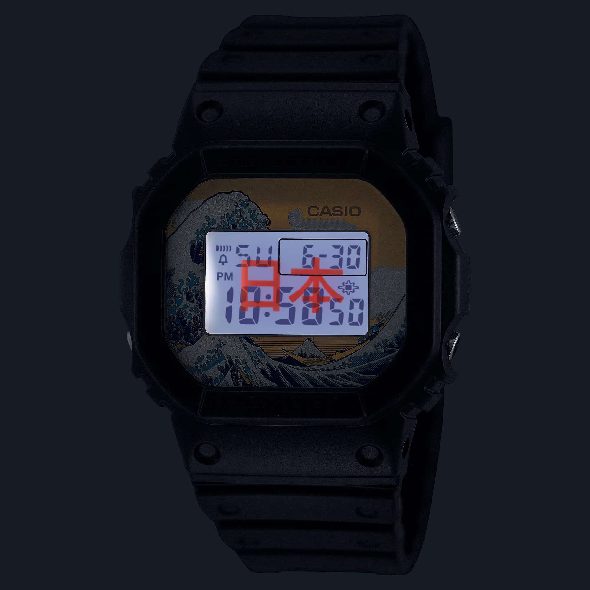 Мужские японские ударопрочныеУдаропрочный корпусМеханизм заключён в корпус, выполненный из современных материалов, устойчивых к ударам, механическим повреждениям и падению с высоты: инновационный пластик, карбон, нержавеющая сталь, титан. часы Casio G-Shock DW-5600KHK25-1, механизм с высокой точностью. Это отсылка к знаменитой работе мастера «Великая волна» (The Great Wave), ее циферблат с динамичными синими и белыми оттенками символизирует морские волны и мощь природы. Минеральное стеклоМинеральное стеклоМинеральное стекло представляет собой искусственно выращенный минерал кварца. Такое стекло отличается особой устойчивостью к повреждениям и царапинам. Уступает по некоторым качествам сапфировому стеклу. защищает циферблат от царапин, а водозащита до 200 метров достаточна для плавания и активного отдыха. Корпус часов изготовлен из пластика и эффектно подчеркивает художественные элементы циферблата. Ударопрочный корпусУдаропрочный корпусМеханизм заключён в корпус, выполненный из современных материалов, устойчивых к ударам, механическим повреждениям и падению с высоты: инновационный пластик, карбон, нержавеющая сталь, титан. защищает механизм от ударов и вибрации. Светодиодная подсветкаСветодиодная подсветкаСветодиодная или LED-подсветка обеспечивает появление яркого холодного свечения за счёт LED-элементов - маленьких лампочек. Они потребляют минимальное количество энергии, чаще всего можно встретить 1 светодиод, в нижней части циферблата. дисплея. Функции данной модели включают в себя секундомерСекундомерСекундоме́р — прибор, способный измерять интервалы времени с точностью до долей секунды., автоматический календарь, таймерТаймерОтсчитывает секунды в обратном направлении в заданном интервале времени., будильникБудильникБуди́льник — часы, в заданный момент времени подающие звуковой, световой и/или в редких случаях другой сигнал.. Ремешок из полимерного материала с классической застежкой.  Идеальный выбор для тех, кто ценит стиль, функциональность и качество.