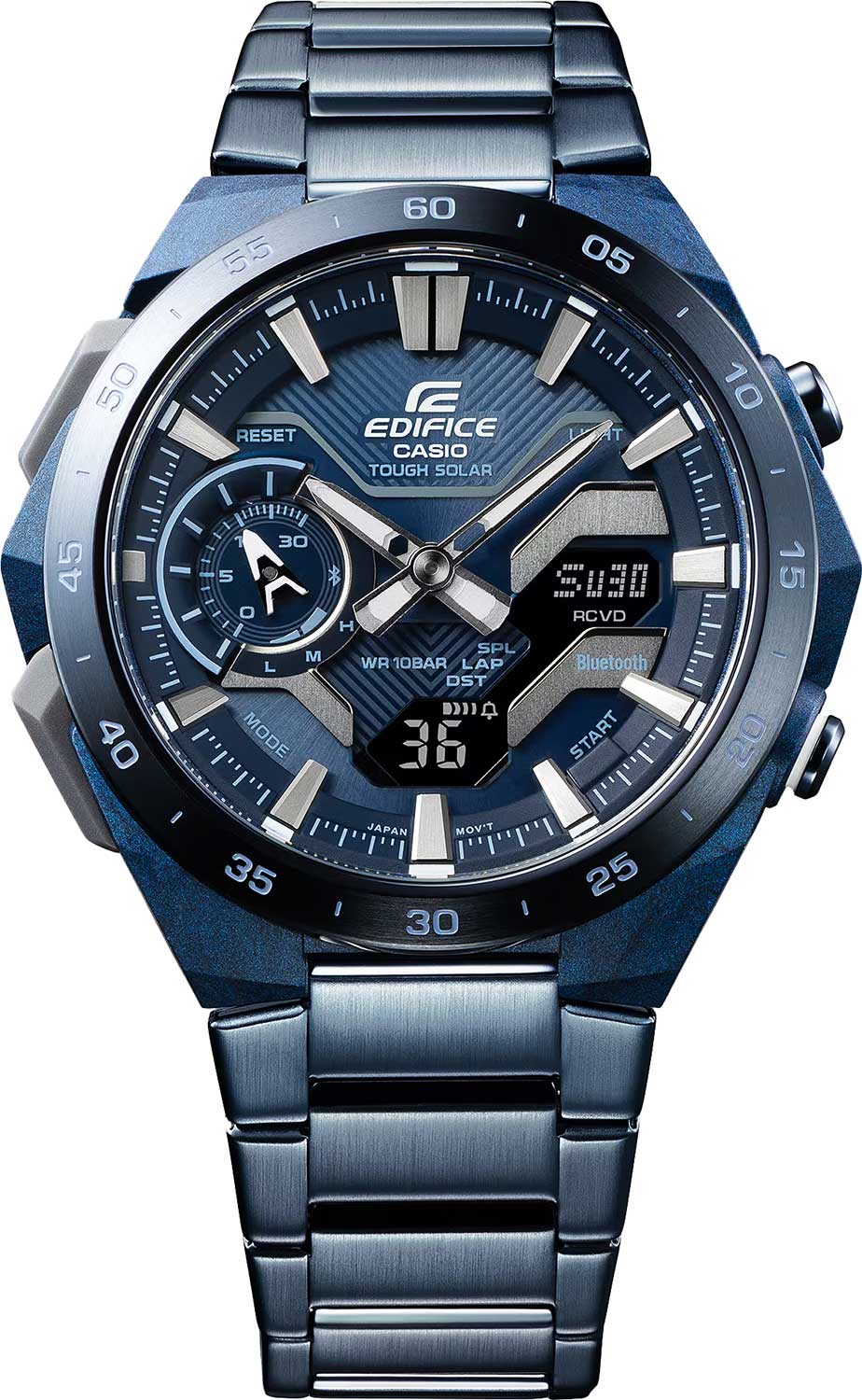 Модель Casio Edifice ECB-2200CB-2A из коллекции Edifice сочетает передовые технологии и динамичный спортивный стиль. Корпус выполнен из углеродного волокнаCarbon Core Guard Новейшая структура корпуса, разработанная Casio. Полиуретановая пластина дополнительно усилена карбоновыми вставками, что придаёт специальную защиту от механических повреждений. Карбон отличается лёгкостью и прочностью., усиленного смолой, что обеспечивает прочность и легкость и стальной безельБезельВнешний ободок, закрепляющий стекло. В спортивных часах так называется поворотное кольцо с делениями на циферблате, выполняет роль таймера – замеряет отрезки времени на шкале. Неподвижный безель – элемент декора. Однонаправленно вращающийся безель на дайверских часах позволяет фиксировать моменты погружения и выныривания на поверхность. с PVD-покрытиемPVDУльтратонкое покрытие наносится в технике вакуумного напыления, сочетает в себе нитрид титана особой прочности со слоем золота или оксида хрома. Несёт в себе декоративную или защитную функцию.. Синий циферблат с металлическими метками и объемными элементами подчеркивает автоспортивный характер модели. Часы оснащены Bluetooth®-синхронизациейBluetoothСовременная технология, позволяющая синхронизировать часы с телефоном и переносить данные. Часы с Bluetooth расширяют возможности вашего смартфона и делают его использование ещё более удобным., позволяющей автоматически корректировать время, управлять мировым временемМировое время Полезное часовое усложнение, отображающее время в основных городах и известных областях по всему миру, оно связано с часовыми поясами, удобно для путешественников и бизнесменов. и передавать данные секундомера через приложение CASIO WATCHES. Солнечная батарея Tough SolarTough SolarТехнология основана на подзарядке аккумулятора от источника солнечного света, специальная панель улавливает солнечные лучи и преобразует их в энергию для работы часов. Достаточно пары минут нахождения на солнце для функционирования часов в течении суток. преобразует свет в энергию, обеспечивая бесперебойную работу. Дополнительные функции включают таймер обратного отсчетаТаймерОтсчитывает секунды в обратном направлении в заданном интервале времени. с индикатором на отметке 9 часов, будильникБудильникБуди́льник — часы, в заданный момент времени подающие звуковой, световой и/или в редких случаях другой сигнал., секундомерСекундомерСекундоме́р — прибор, способный измерять интервалы времени с точностью до долей секунды. и двойную светодиодную подсветку Super IlluminatorСветодиодная подсветкаСветодиодная или LED-подсветка обеспечивает появление яркого холодного свечения за счёт LED-элементов - маленьких лампочек. Они потребляют минимальное количество энергии, чаще всего можно встретить 1 светодиод, в нижней части циферблата. для удобного чтения показаний в темноте. Браслет из нержавеющей стали с синим ионным покрытиемPVDУльтратонкое покрытие наносится в технике вакуумного напыления, сочетает в себе нитрид титана особой прочности со слоем золота или оксида хрома. Несёт в себе декоративную или защитную функцию. и раскладной застёжкойРаскладная застёжкаТакой тип застёжки используется только на браслетах из металла. Она никогда не раскрывается полностью, происходит разделение на 2 и более частей. Раскладывающая застёжка снизит вероятнос