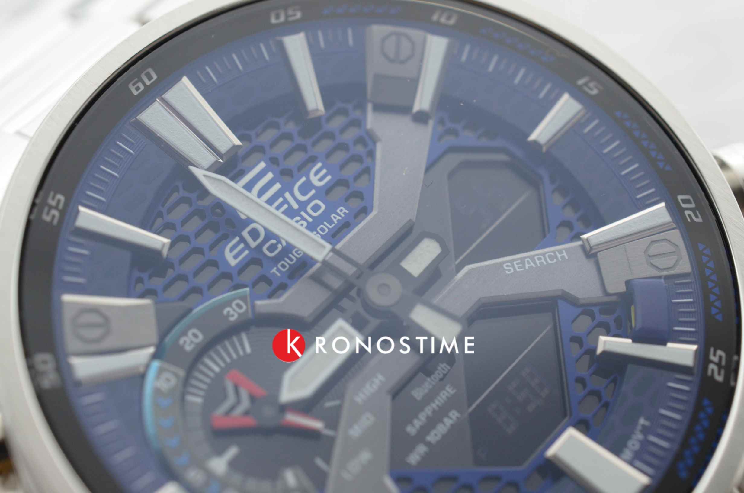 Достаточно внушительный синий циферблат с оригинальным расположением счётчиков. Многофункциональная модель пригодится на любой случай жизни, ведь она оснащена Bluetooth 4.0BluetoothСовременная технология, позволяющая синхронизировать часы с телефоном и переносить данные. Часы с Bluetooth расширяют возможности вашего смартфона и делают его использование ещё более удобным., хронографомХронографФункция позволяет измерять отрезки времени с особой точностью: часы, минуты, секунды. Верным признаком хронографа является наличие на циферблате 3 дополнительных окошек-счётчиков., секундомером, тахиметромТахиметрРазмеченная шкала, располагается на ободке или безеле часов. Тахиметр позволяет рассчитать скорость на определённом участке пути, расстояние измеряется в километрах или милях., таймером, будильником, календарём, есть мировое времяМировое время Полезное часовое усложнение, отображающее время в основных городах и известных областях по всему миру, оно связано с часовыми поясами, удобно для путешественников и бизнесменов. и функция поиска телефона. Питание поступает от солнечной энергии - . Водонепроницаемость до 10 бар. Корпус, браслет, безельБезельВнешний ободок, закрепляющий стекло. В спортивных часах так называется поворотное кольцо с делениями на циферблате, выполняет роль таймера – замеряет отрезки времени на шкале. Неподвижный безель – элемент декора. Однонаправленно вращающийся безель на дайверских часах позволяет фиксировать моменты погружения и выныривания на поверхность. из нержавеющей стали. Минеральное стекло. Двойная светодиодная подсветкаСветодиодная подсветкаСветодиодная или LED-подсветка обеспечивает появление яркого холодного свечения за счёт LED-элементов - маленьких лампочек. Они потребляют минимальное количество энергии, чаще всего можно встретить 1 светодиод, в нижней части циферблата.. Габариты: 50 x 46 x 9,8 мм.
