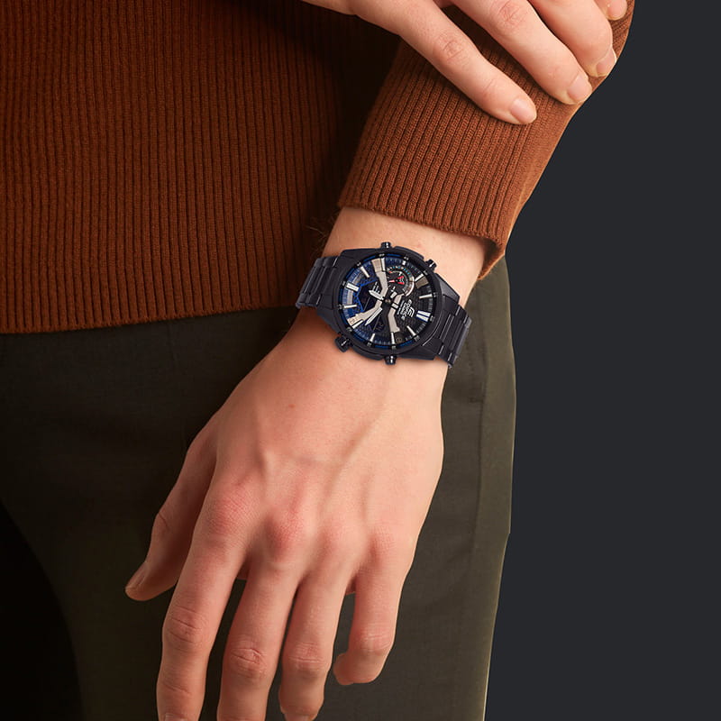 Японские мужские часы из коллекции Edifice отражают динамику и спортивный стиль, связанный с автомобильной тематикой.