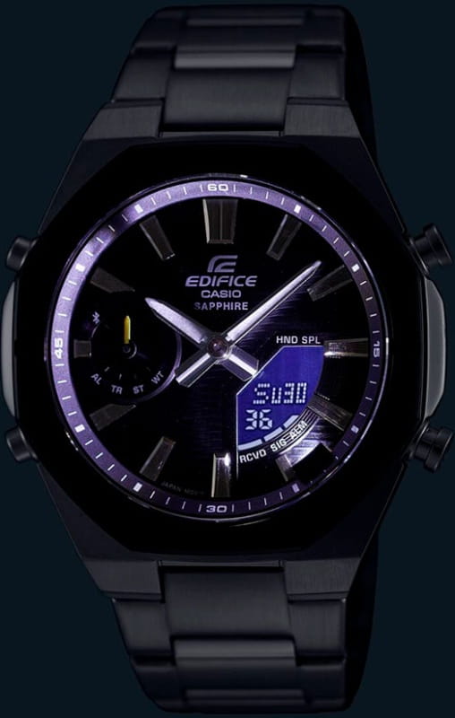 Японские мужские наручные часы Casio Edifice ECB-S10D-2A — это высокотехнологичный аксессуар для тех, кто ценит точность, стиль и современные инновации. Модель из коллекции Edifice , оснащённая технологией Bluetooth®, объединяет в себе классический дизайн и цифровые функции, делая каждое использование по-настоящему удобным. Корпус диаметром 43 мм выполнен из прочной нержавеющей стали , что придаёт модели благородства и долговечности. Циферблат синего цвета изготовлен по технологии Sunray (солнечные лучи) , обеспечивая глубину и игру света. Защиту механизму обеспечивает сапфировое стеклоСапфировое стеклоПрочный и надёжный материал из кристалла сапфира синтетического происхождения, характеризующийся особой твёрдостью и устойчивостью к царапинам и повреждениям., устойчивое к царапинам и с антибликовым покрытием для лучшей читаемости. Часы работают на кварцевом механизме с поддержкой BluetoothBluetoothСовременная технология, позволяющая синхронизировать часы с телефоном и переносить данные. Часы с Bluetooth расширяют возможности вашего смартфона и делают его использование ещё более удобным. , что позволяет синхронизировать их со смартфоном через специальное приложение CASIO WATCHES . Это даёт возможность автоматически корректировать время, устанавливать будильники, отслеживать дни недели на 6 языках , включая русский, а также выбирать время в до 300 городов мира . Также реализована функция перемещения стрелок , которая открывает обзор цифровых окон, и функция поиска телефона. Модель предлагает широкий набор функций: — Секундомер с точностью 1/100 секунды и временем измерения до 24 часов ; — SPLIT-хронографСплит-хронографИспользуется для измерения продолжительности нескольких временных отрезков, начинающихся одновременно, а заканчивающихся в разное время.; — ТаймерТаймерОтсчитывает секунды в обратном направлении в заданном интервале времени. обратного отсчёта от 1 секунды до 24 часов ; — 5 независимых будильников и ежечасный сигнал ; — отображение времени в формате 12/24 часа ; — автоматический календарь с возможностью отображения дня недели до 2099 года; — включение/выключение звука кнопок и авиарежим . Для комфортного использования в темное время стрелки покрыты люминесцентным составом NeobriteПодсветка NeobriteИспользование светонакопительных составов на основе сульфида цинка или алюмината стронция, яркий свет можно наблюдать на протяжении 6-10 часов после «зарядки» часов около источника света., который заряжается на свету и долго светится в темноте. Часы также имеют двойную светодиодную подсветку циферблата , с регулировкой длительности свечения (1.5 или 3 секунды), что делает их особенно удобными в условиях слабого освещения. Часы обладают водозащитой WR100 , подходят для повседневного ношения и плавания без акваланга. Толщина корпуса составляет всего 9.6 мм , благодаря чему часы легко помещаются под манжетом рубашки и не вызывают дискомфорта при носке. Завершает образ стальной браслет с раскладывающейся тройной застежкой , обеспечивающий надежную фиксацию и комфортную посадку на запястье. Батарейка рассчитана на 2 года автономной работы , а вес модели составляет 129 грамм . Эта модель — идеальный выбор для тех, кто ценит современные технологии , классический стиль и точность японского качества . Casio Edifice — не просто хронограф, а полноценный спутник в деловой и повс