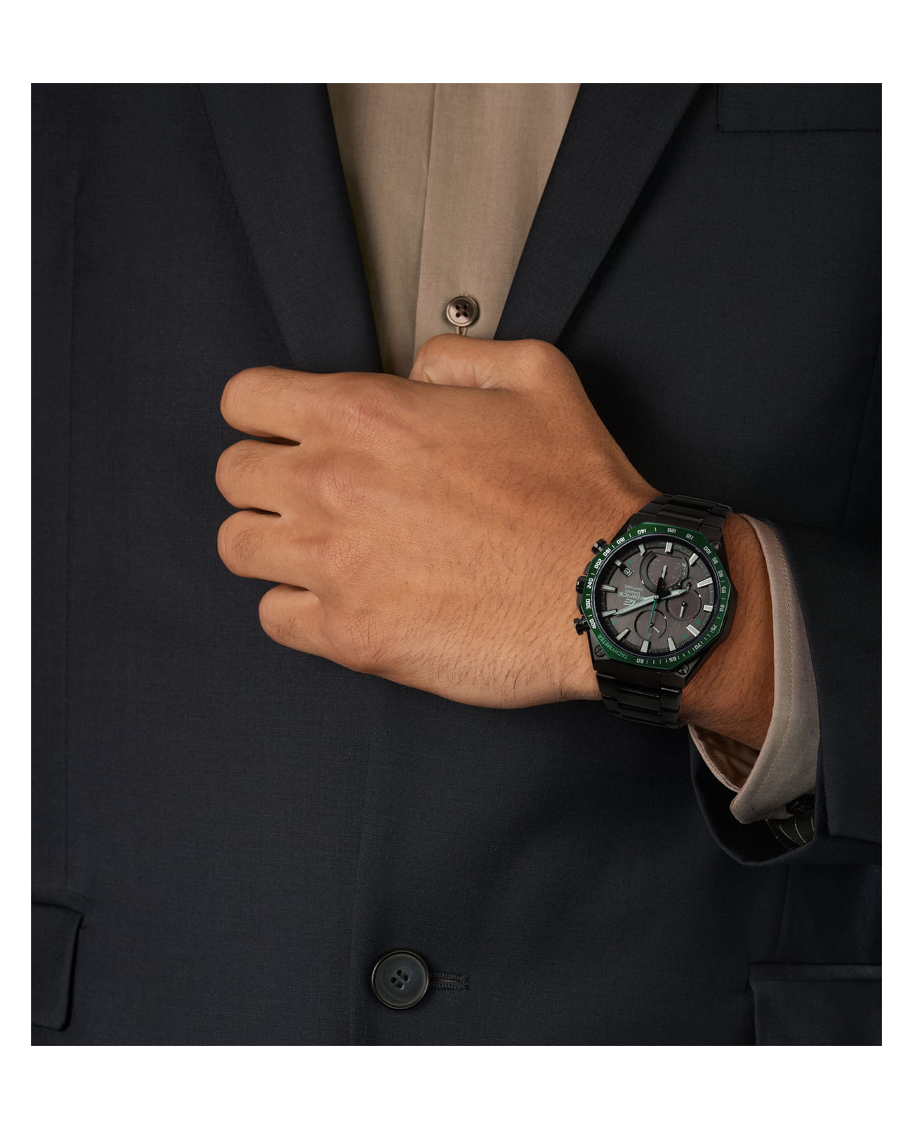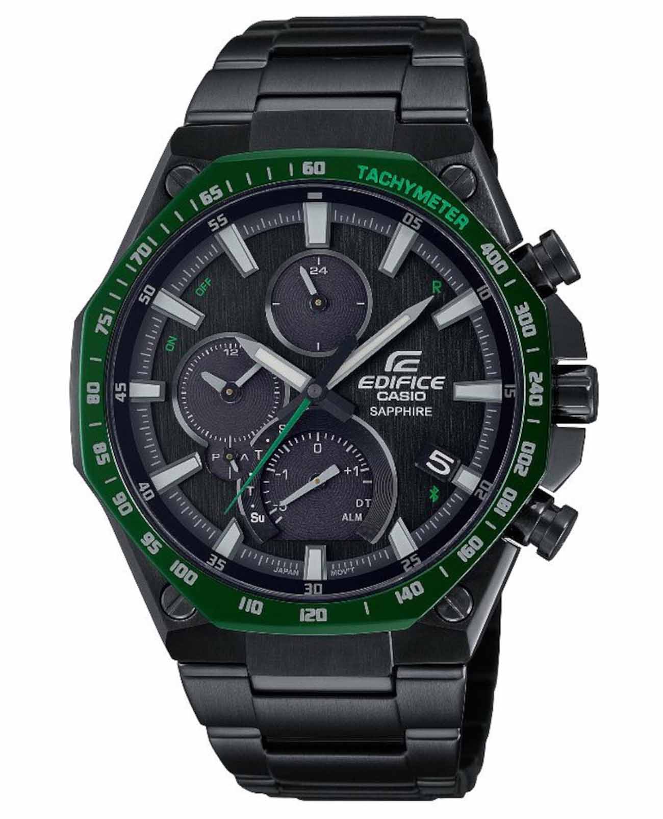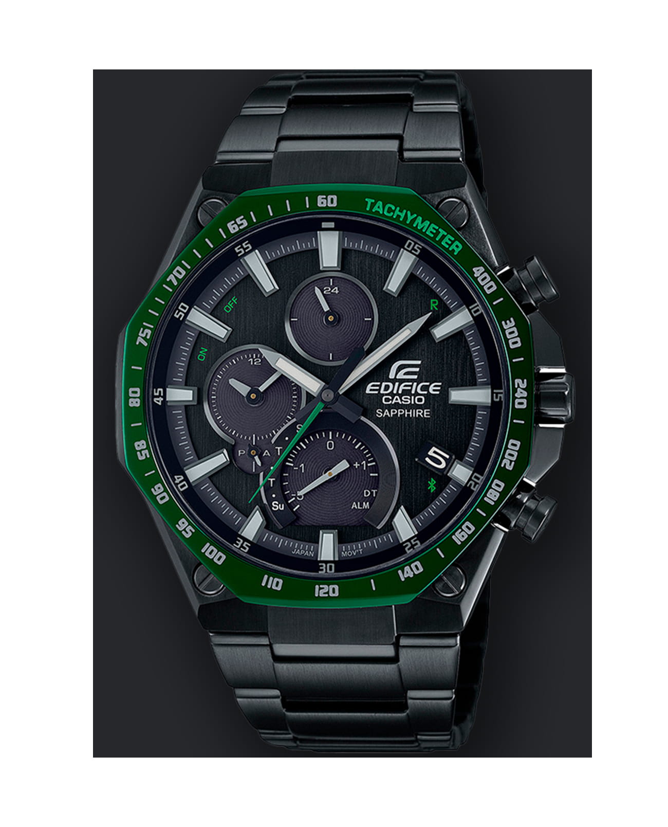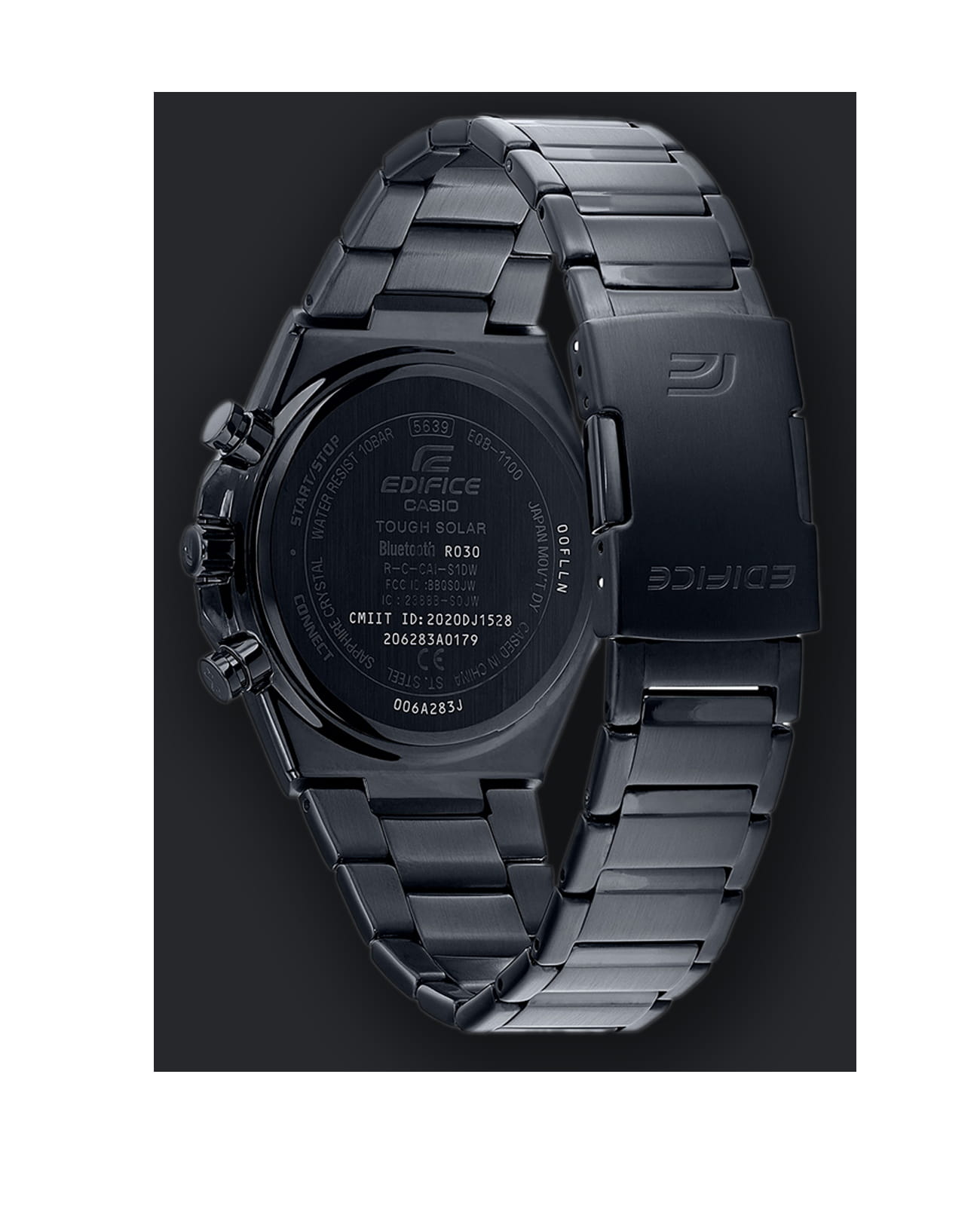 Японские мужские часы с Bluetooth и солнечной батареей Casio Edifice EQB-1100XDC-1A, кварцевый механизм с высокой точностью. Сапфировое стекло устойчивое к появлению царапин, обладающее высокой прозрачностью. Класс водозащиты: 100 метров, позволит плавать, нырять и заниматься другими водными видами спорта. Корпус часов изготовлен из стали IP-покрытиемIP-покрытиеМетод ионного напыления. Демонстрирует повышенную устойчивость к истиранию, окислению и химическим веществам. Под воздействием высокого давления и температуры около 1500°C молекулы металла надёжно соединяются с частицами корпуса часов. черного цвета. Питание от солнечной энергии Tough SolarTough SolarТехнология основана на подзарядке аккумулятора от источника солнечного света, специальная панель улавливает солнечные лучи и преобразует их в энергию для работы часов. Достаточно пары минут нахождения на солнце для функционирования часов в течении суток. - солнечные батарейки большой мощности, индикатор низкого заряда батареи. В часах используется новый модуль, оснащенный BluetoothBluetoothСовременная технология, позволяющая синхронизировать часы с телефоном и переносить данные. Часы с Bluetooth расширяют возможности вашего смартфона и делают его использование ещё более удобным., благодаря чему, часы могут автоматически подключаться к смартфону для синхронизации точного времени, удобной настройки или для быстрого поиска телефона. Часы-хронографХронографФункция позволяет измерять отрезки времени с особой точностью: часы, минуты, секунды. Верным признаком хронографа является наличие на циферблате 3 дополнительных окошек-счётчиков. с секундомеромСекундомерСекундоме́р — прибор, способный измерять интервалы времени с точностью до долей секунды. и тахиметромТахиметрРазмеченная шкала, располагается на ободке или безеле часов. Тахиметр позволяет рассчитать скорость на определённом участке пути, расстояние измеряется в километрах или милях.. Второй часовой пояс и мировое времяМировое время Полезное часовое усложнение, отображающее время в основных городах и известных областях по всему миру, оно связано с часовыми поясами, удобно для путешественников и бизнесменов. в положении 9 часов, одновременное отображение текущего времени и времени в другом часовом поясе. Окошко даты находится в положении 4 часа. День недели отображается на отдельном индикаторе в позиции 6 часов.