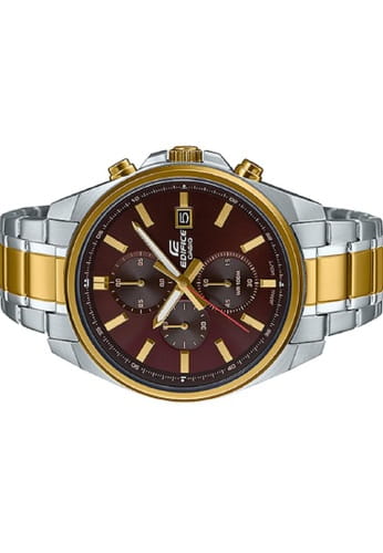Японские мужские часы-хронографХронографФункция позволяет измерять отрезки времени с особой точностью: часы, минуты, секунды. Верным признаком хронографа является наличие на циферблате 3 дополнительных окошек-счётчиков. Casio Edifice EFV-610SG-5A, кварцевый механизм с высокой точностью. Класс водозащиты: 100 метров, позволит плавать, нырять и заниматься другими водными видами спорта. Корпус часов изготовлен из стали с IP-покрытиемIP-покрытиеМетод ионного напыления. Демонстрирует повышенную устойчивость к истиранию, окислению и химическим веществам. Под воздействием высокого давления и температуры около 1500°C молекулы металла надёжно соединяются с частицами корпуса часов.. Раскладная застёжкаРаскладная застёжкаТакой тип застёжки используется только на браслетах из металла. Она никогда не раскрывается полностью, происходит разделение на 2 и более частей. Раскладывающая застёжка снизит вероятность потери часов к минимуму. с фиксатором. Светонакопительное покрытие NeobriteПодсветка NeobriteИспользование светонакопительных составов на основе сульфида цинка или алюмината стронция, яркий свет можно наблюдать на протяжении 6-10 часов после «зарядки» часов около источника света. обеспечивает длительное послесвечение в темноте даже после кратковременного нахождения на свету. СекундомерСекундомерСекундоме́р — прибор, способный измерять интервалы времени с точностью до долей секунды. с разрешением показаний 1/10 сек и временем измерения 1 ч. Циферблат с окошком даты.