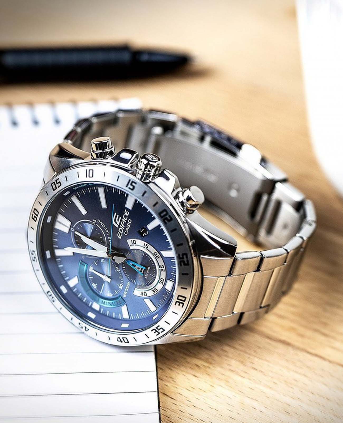 Японские мужские часы-хронографХронографФункция позволяет измерять отрезки времени с особой точностью: часы, минуты, секунды. Верным признаком хронографа является наличие на циферблате 3 дополнительных окошек-счётчиков. Casio Edifice EFV-620D-1A2V. Минеральное стеклоМинеральное стеклоМинеральное стекло представляет собой искусственно выращенный минерал кварца. Такое стекло отличается особой устойчивостью к повреждениям и царапинам. Уступает по некоторым качествам сапфировому стеклу. устойчивое к появлению царапин, обладающее высокой прозрачностью. Копрус часов изготовлен из нержавеющей стали. БезельБезельВнешний ободок, закрепляющий стекло. В спортивных часах так называется поворотное кольцо с делениями на циферблате, выполняет роль таймера – замеряет отрезки времени на шкале. Неподвижный безель – элемент декора. Однонаправленно вращающийся безель на дайверских часах позволяет фиксировать моменты погружения и выныривания на поверхность. из стали с IP-покрытиемIP-покрытиеМетод ионного напыления. Демонстрирует повышенную устойчивость к истиранию, окислению и химическим веществам. Под воздействием высокого давления и температуры около 1500°C молекулы металла надёжно соединяются с частицами корпуса часов.. Светодиодная автоподсветка NeobriteПодсветка NeobriteИспользование светонакопительных составов на основе сульфида цинка или алюмината стронция, яркий свет можно наблюдать на протяжении 6-10 часов после «зарядки» часов около источника света.  - при повороте часов в сторону лица подсветка дисплея осуществляется автоматически.  Настраиваемое послесвечение 1,5 или 3сек. Записная книжка на 30 ячеек памяти для записи имен и телефонных номеров, каждая запись может включать в себя текст из 8 букв и 16 цифр. СекундомерСекундомерСекундоме́р — прибор, способный измерять интервалы времени с точностью до долей секунды. с точностью измерения 1/100 секунды и измерением до 23 часов 59 минут 59,99 cек. ТаймерТаймерОтсчитывает секунды в обратном направлении в заданном интервале времени. обратного отсчета (диапазон времени 24 часа), автоматический календарь, 12/24 отображение времени. Мировое времяМировое время Полезное часовое усложнение, отображающее время в основных городах и известных областях по всему миру, оно связано с часовыми поясами, удобно для путешественников и бизнесменов. – 30 городов (29 часовых поясов). 5 будильниковБудильникБуди́льник — часы, в заданный момент времени подающие звуковой, световой и/или в редких случаях другой сигнал., один с функцией Snooze, ежечасный сигнал. Класс водозащиты: 100 метров, позволит плавать, нырять и заниматься другими водными видами спорта. Стальной браслет на раскладной застёжкеРаскладная застёжкаТакой тип застёжки используется только на браслетах из металла. Она никогда не раскрывается полностью, происходит разделение на 2 и более частей. Раскладывающая застёжка снизит вероятность потери часов к минимуму..