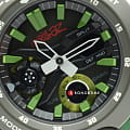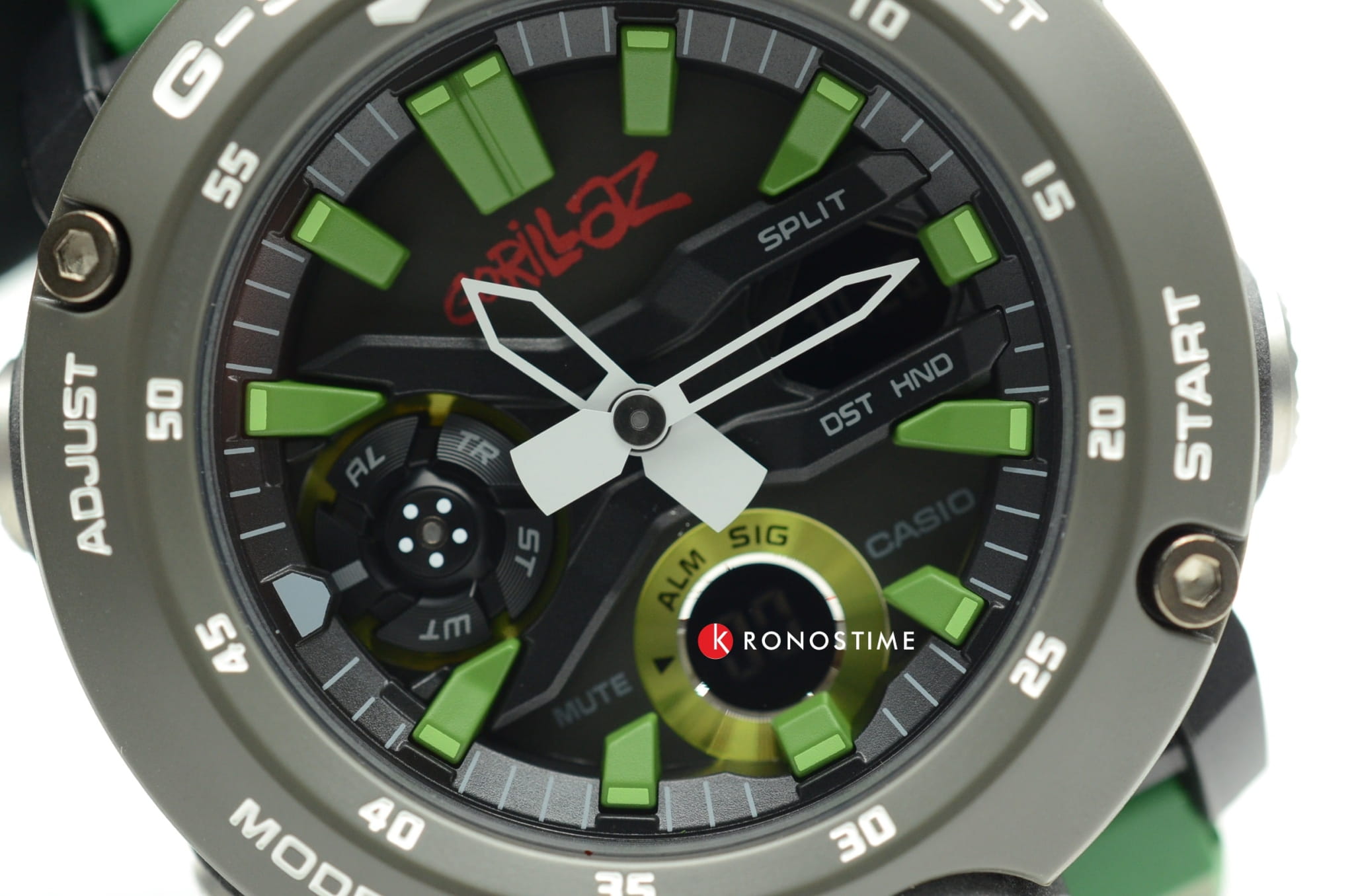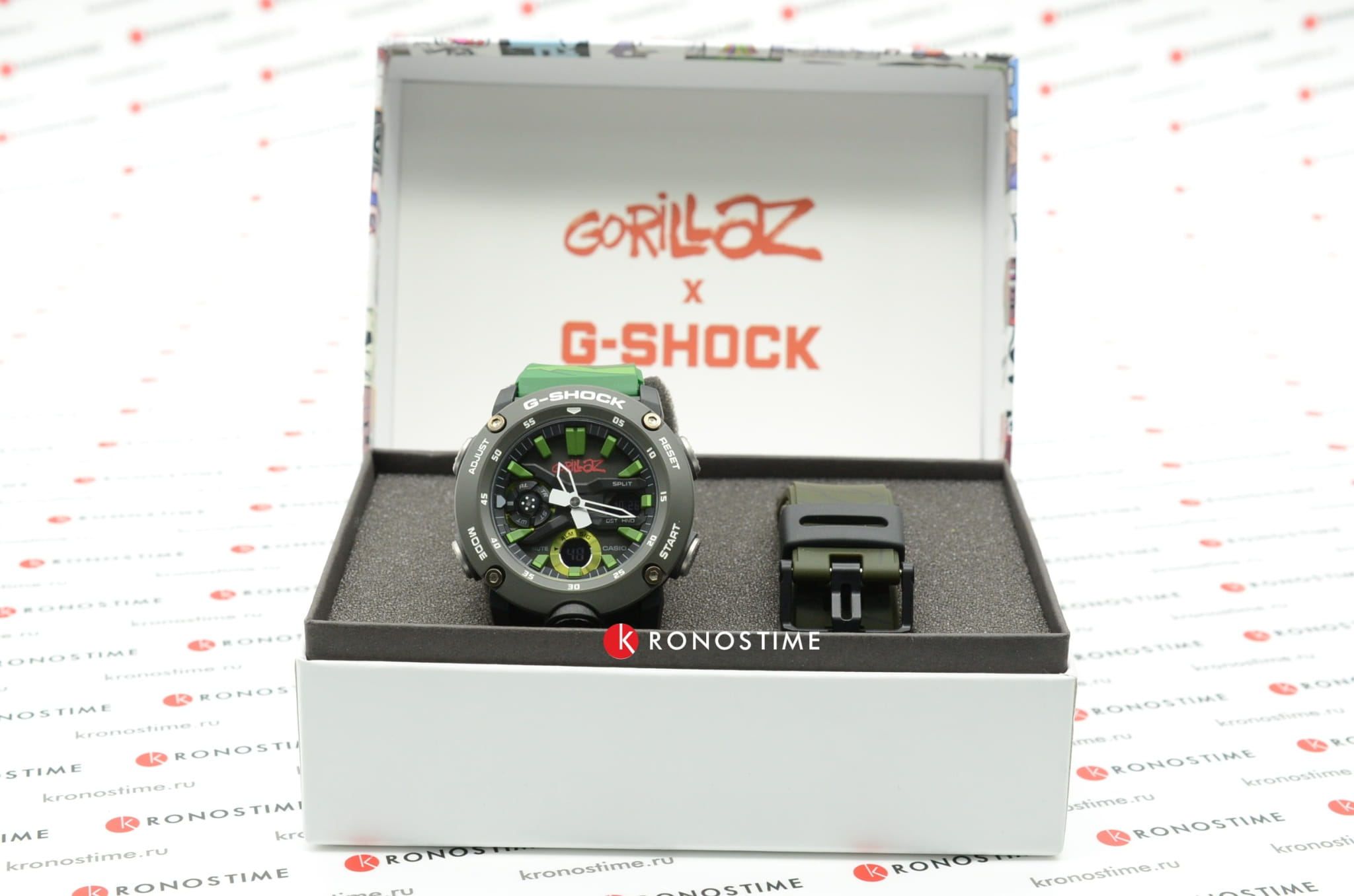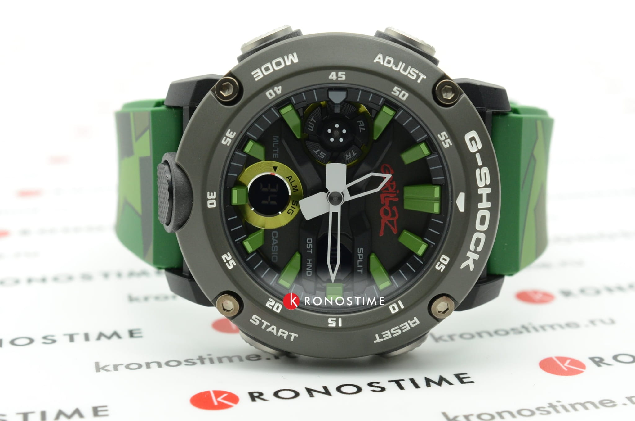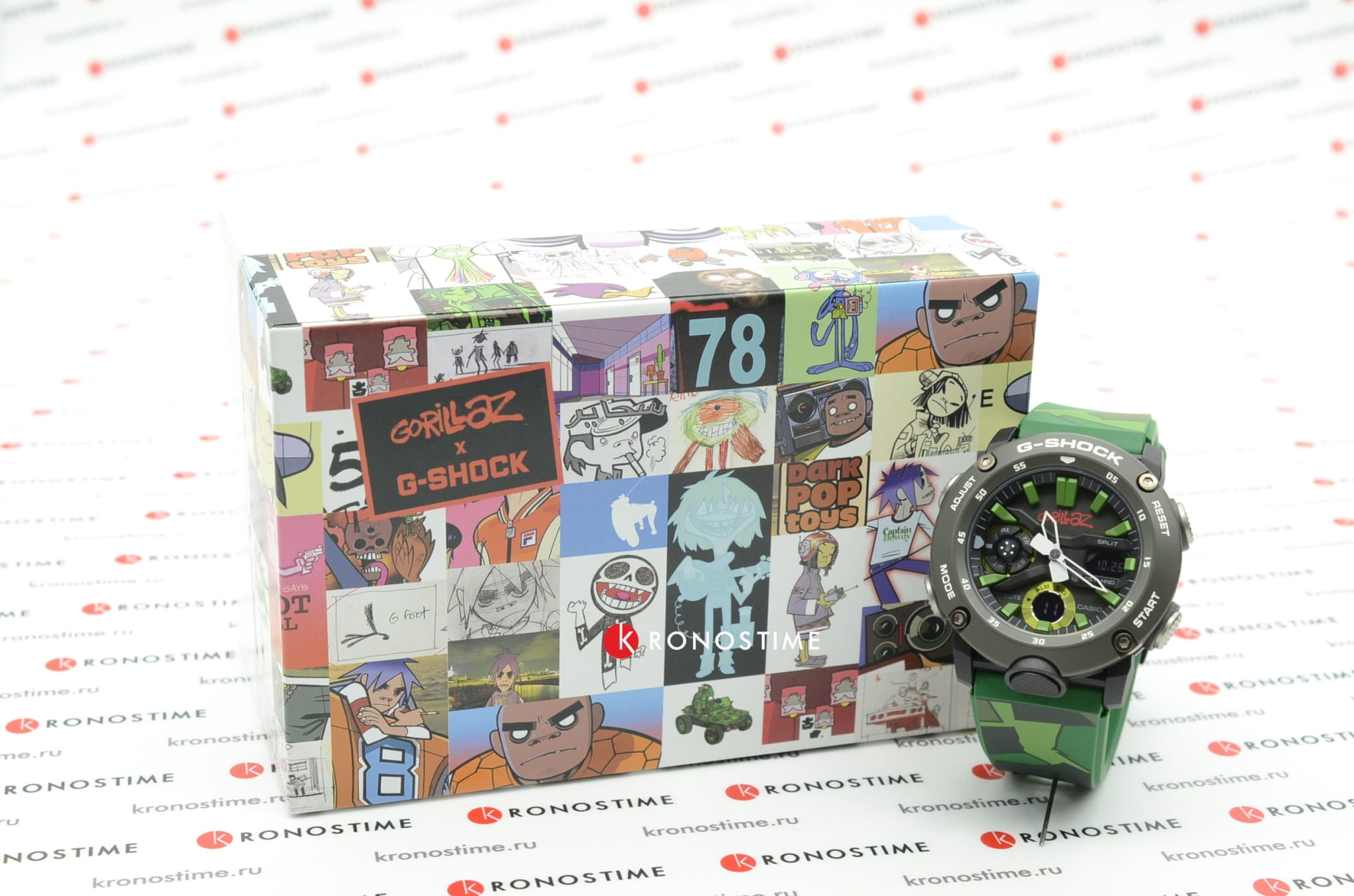 Камуфляжный дизайн отсылает к дебютному студийному альбому Gorillaz, присутствуют крупные элементы, яркие оттенки. В комплектацию входит сменный ремешок в стиле милитари в тёмном исполнении, кастомизированная коробка украшена изображением участников группы. Наручные часы имеют противоударный корпусУдаропрочный корпусМеханизм заключён в корпус, выполненный из современных материалов, устойчивых к ударам, механическим повреждениям и падению с высоты: инновационный пластик, карбон, нержавеющая сталь, титан. из полиуретана с углеродными вставками, что повышает его устойчивость к повреждениям, ударам, вибрациям. Кварцевый высокоточный механизм. Водонепроницаемость 20 бар. Двойная подсветка. Закалённое минеральное стекло. Функционал: мировое времяМировое время Полезное часовое усложнение, отображающее время в основных городах и известных областях по всему миру, оно связано с часовыми поясами, удобно для путешественников и бизнесменов. , секундомер, будильник, таймер, хронографХронографФункция позволяет измерять отрезки времени с особой точностью: часы, минуты, секунды. Верным признаком хронографа является наличие на циферблате 3 дополнительных окошек-счётчиков., второй часовой пояс. Габариты: 48,7 x 51,2 x 14,1 мм.