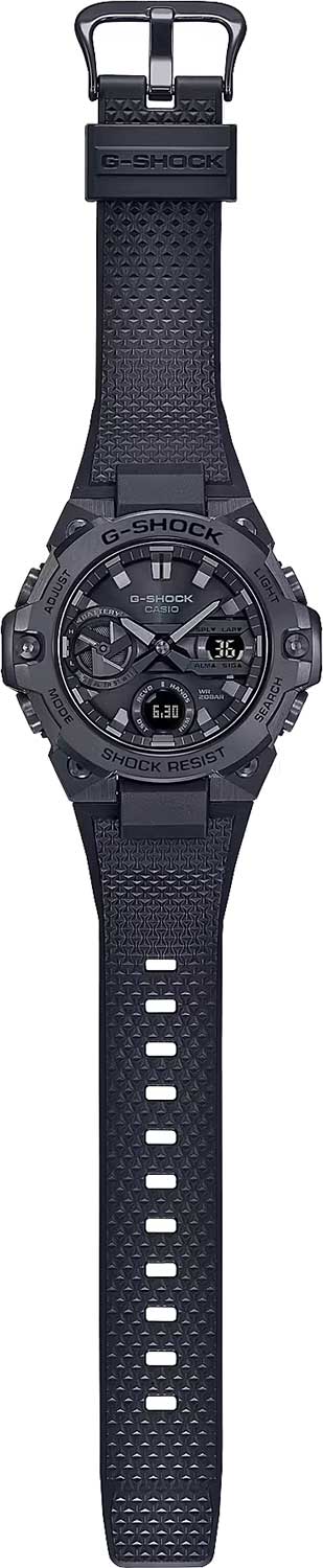 Спортивные японские мужские часы с секундомеромСекундомерСекундоме́р — прибор, способный измерять интервалы времени с точностью до долей секунды. и хронографомХронографФункция позволяет измерять отрезки времени с особой точностью: часы, минуты, секунды. Верным признаком хронографа является наличие на циферблате 3 дополнительных окошек-счётчиков. Casio G-Steel GST-B400BB-1A, кварцевый механизм с высокой точностью. Питание от солнечной энергии Tough Solar - солнечные батарейки большой мощности, индикатор заряда батареи. Функция автоматического сохранения энергии. Время работы аккумулятора без подзарядки приблизительно 7 месяцев, при включенной функции сохранения энергии приблизительно 18 месяцев. Ударопрочный корпусУдаропрочный корпусМеханизм заключён в корпус, выполненный из современных материалов, устойчивых к ударам, механическим повреждениям и падению с высоты: инновационный пластик, карбон, нержавеющая сталь, титан. защищает механизм от ударов и вибрации. . СекундомерСекундомерСекундоме́р — прибор, способный измерять интервалы времени с точностью до долей секунды. с точностью показаний 1/100с (до 1ч) и 1с (после 1ч) и временем измерения 24ч. Мировое времяМировое время Полезное часовое усложнение, отображающее время в основных городах и известных областях по всему миру, оно связано с часовыми поясами, удобно для путешественников и бизнесменов. – 38 городов (38 часовых поясов), всемирное координированное время (UTC). Автоматический переход на зимнее и летнее время, возможность включения/отключения данной функции. Переключение между домашним и мировым временем. Беспроводная технология BluetoothBluetoothСовременная технология, позволяющая синхронизировать часы с телефоном и переносить данные. Часы с Bluetooth расширяют возможности вашего смартфона и делают его использование ещё более удобным. со сверхнизким потреблением энергии для синхронизации со смартфоном. Автоматическое подключение к серверу времени через смартфон для корректировки текущего и настроек мирового времени. Функции перемещения стрелок для беспрепятственного просмотра информации на дисплее, отключения/включения звука, поиска телефона. Отображение дней недели на шести языках. Смена отображения даты/месяца. Стальная задняя крышка крепится на 4-х винтах. Класс водозащиты: 200 метров, позволит плавать, нырять и заниматься другими водными видами спорта. Ремешок на стандартной застежке.