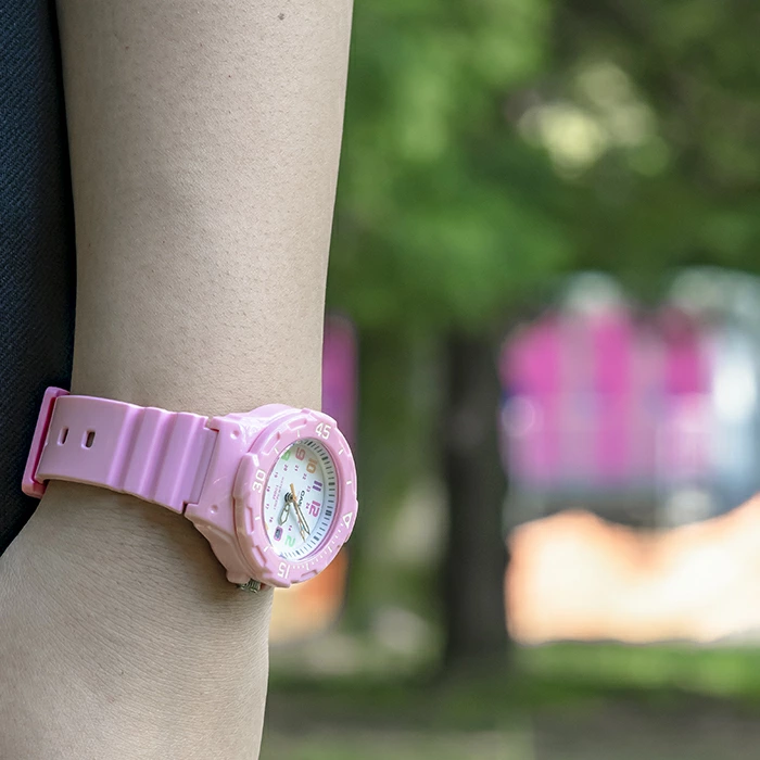 Часы в спортивном стиле полностью подойдут для пляжного отдыха. Корпус и браслет выполнены из высокопрочных полимерных материалов. На аккуратном циферблате расположены временные отметки в виде цветных арабских цифр и миниатюрное окошечко с календарем. Люминесцентная подсветкаЛюминесцентное покрытиеПозволяет считывать показания времени в темноте. Производители наносят на стрелки, часовые индексы, безель или поверхность циферблата светонакопительный состав, дающий холодное свечение.. Высокая водонепроницаемость в 100 WR идеально подходит для плавания в воде. Небольшой вес в 25 грамм не создаст ощущения тяжести при ношении аксессуара.